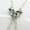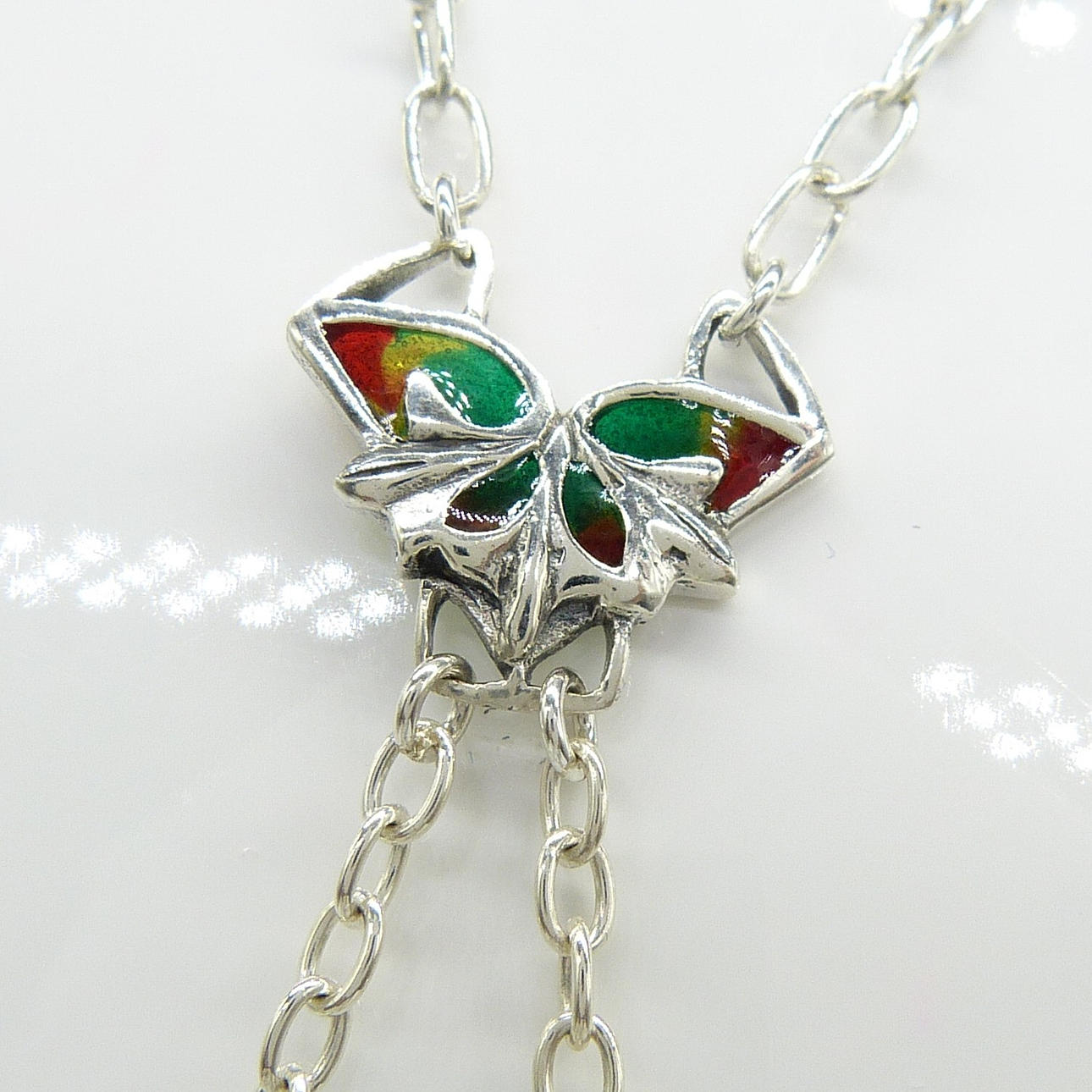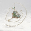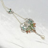 Este elegante collar presenta a la legendaria ninfa y tiene una incrustación de esmalte en colores azul, verde, amarillo y rojo.
