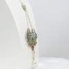 Una perla cultivada blanca de 10 x 7 mm aproximadamente está suspendida en la parte inferior del colgante, que también está engastado con varias piedras de marcasita.