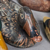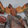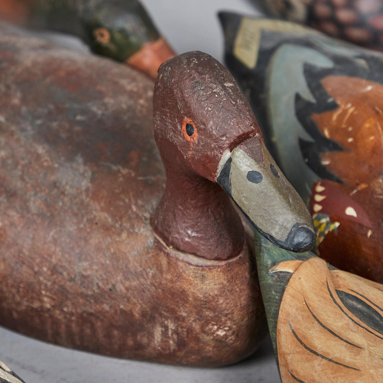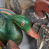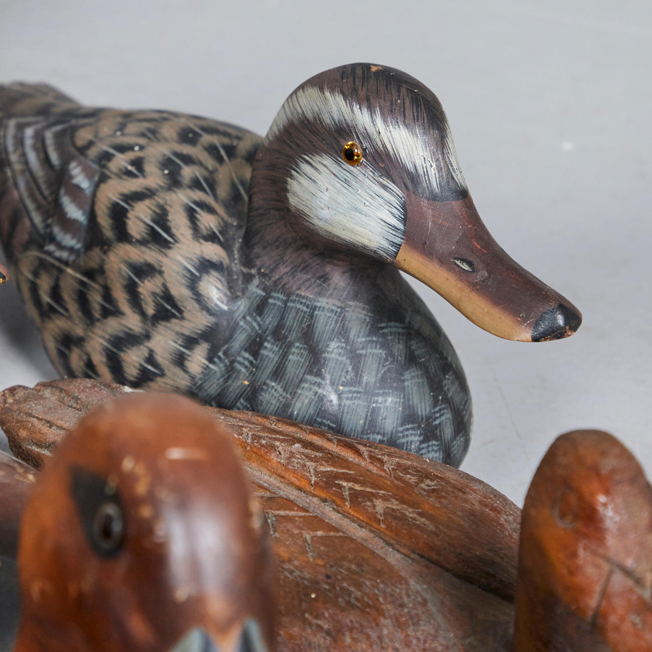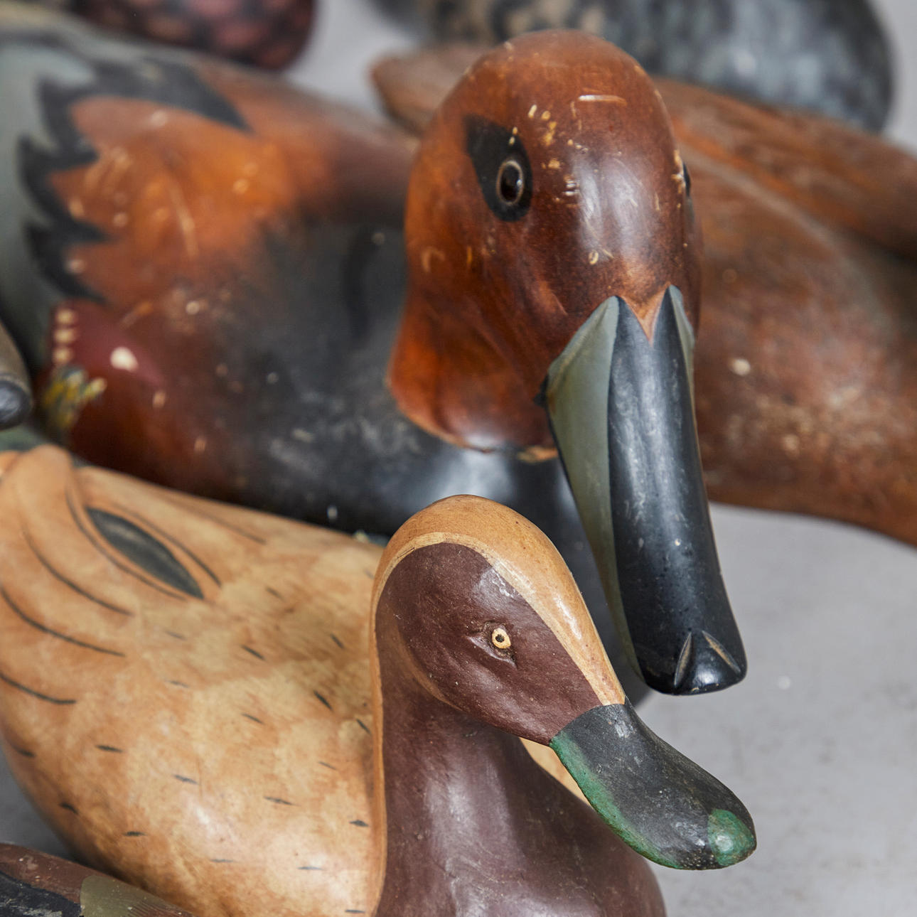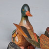 Catorce figuras, patos, madera. Grupo de catorce patos de madera con decoraciones policromadas en varios diseños, H.12-24.5cm, L.18-38cm, W.9-43cm. (14).