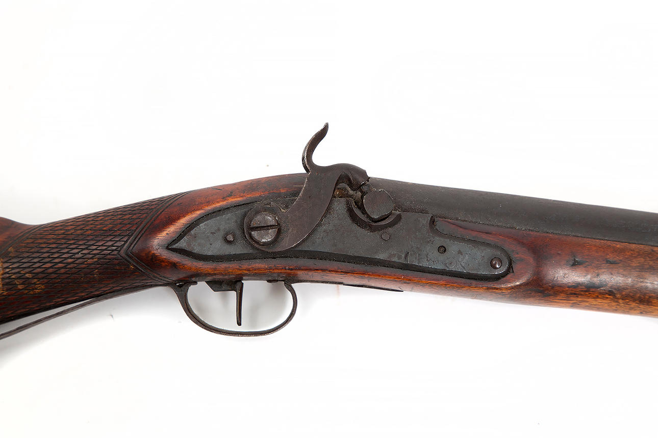 Tronco de madera con decoración tallada. Longitud 135 cm, reelaborado a partir de candado de pedernal.