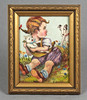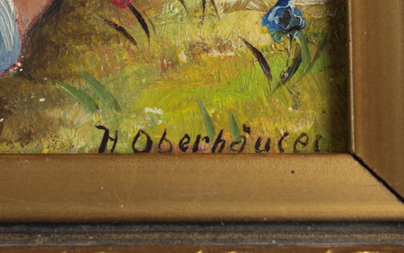 Ök firmado H. Oberhäuser abajo a la derecha en una placa de pintura, una niña sentada en un prado con su gato en su regazo, ambas mirando asustadas al perro que se acerca por detrás, ca. 13 x 17 cm, en el marco de perfil aprox. 17x21,5 cm.