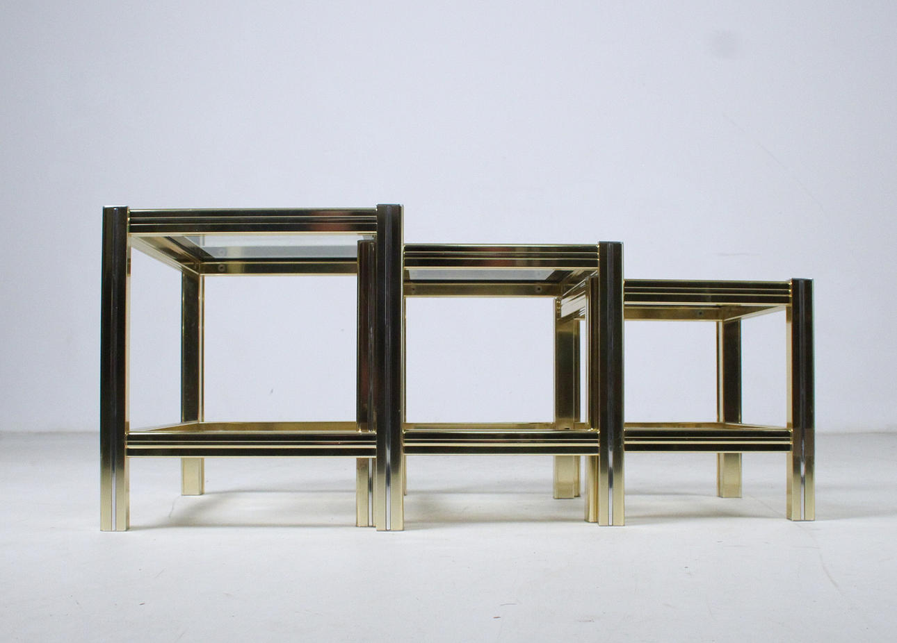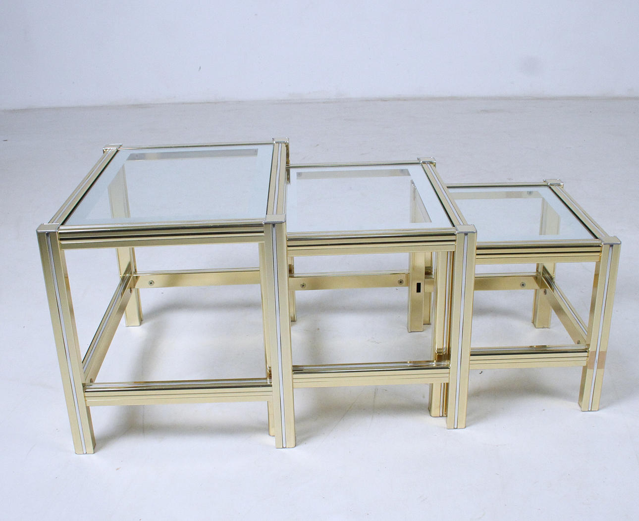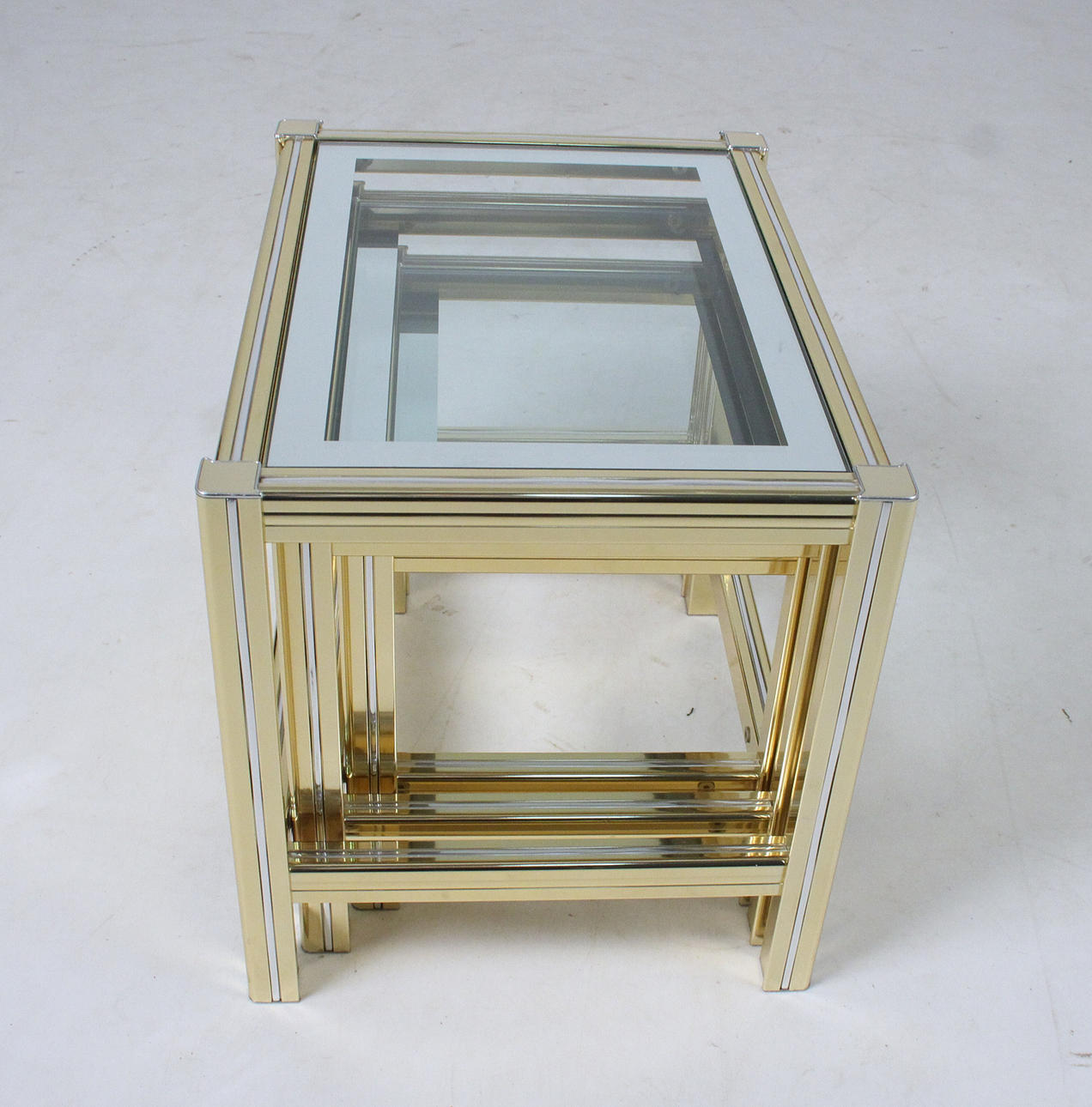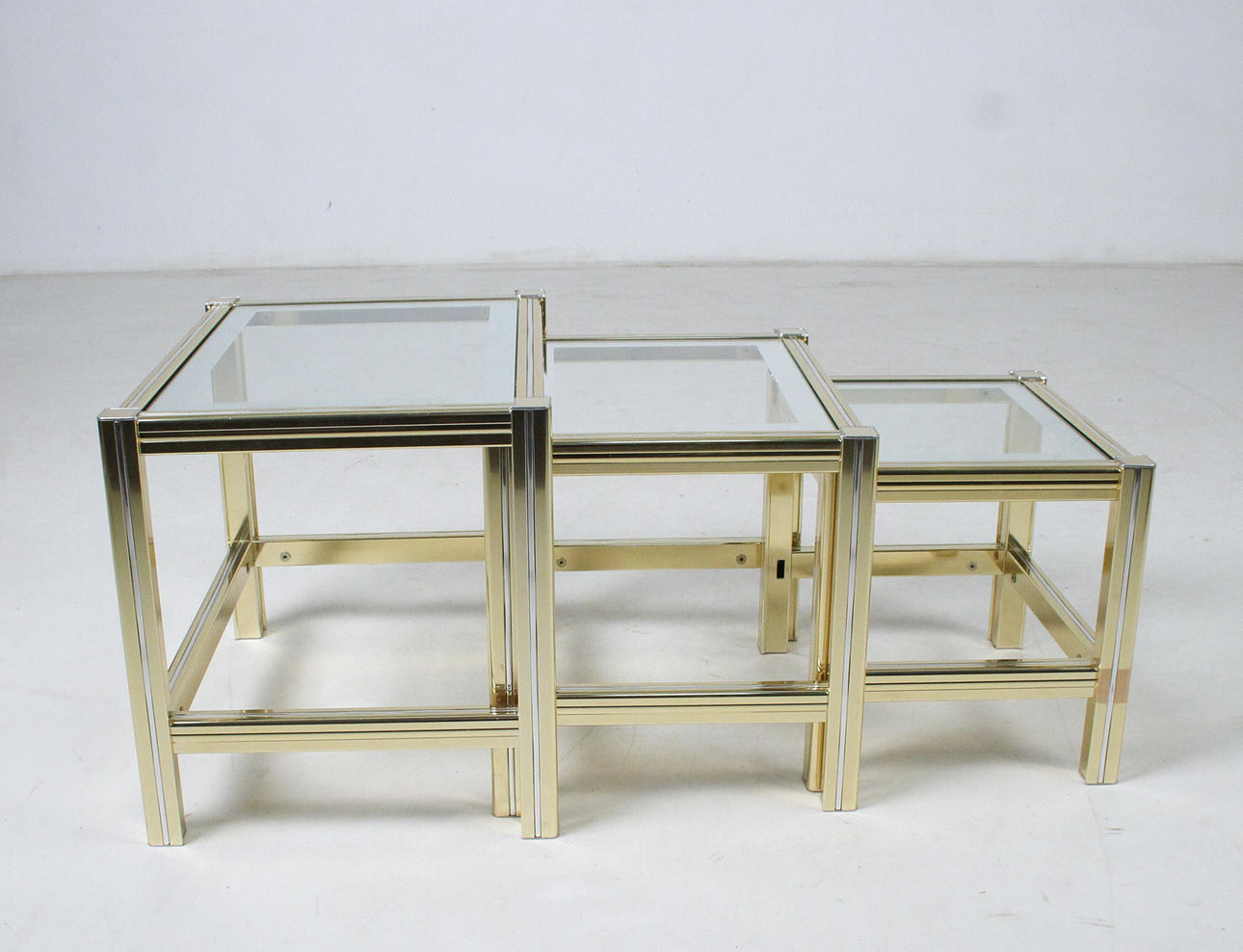 Conjunto de mesas nido al estilo de Maison Charles. Construcción rectangular realizada en metal cromado con incrustaciones de latón y placas de vidrio sueltas. H. 31/33/37, B. 34/37/44,5 cm, D. 38/41/51,5 cm.