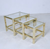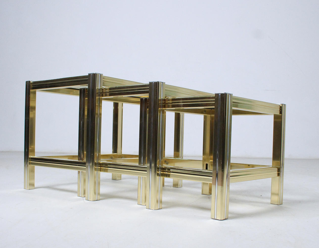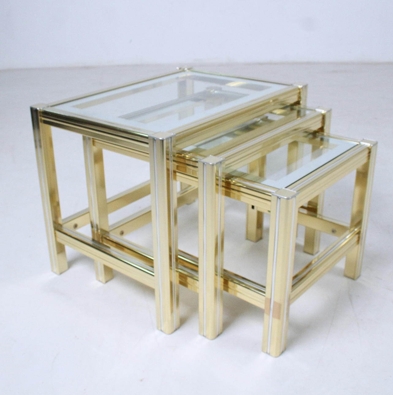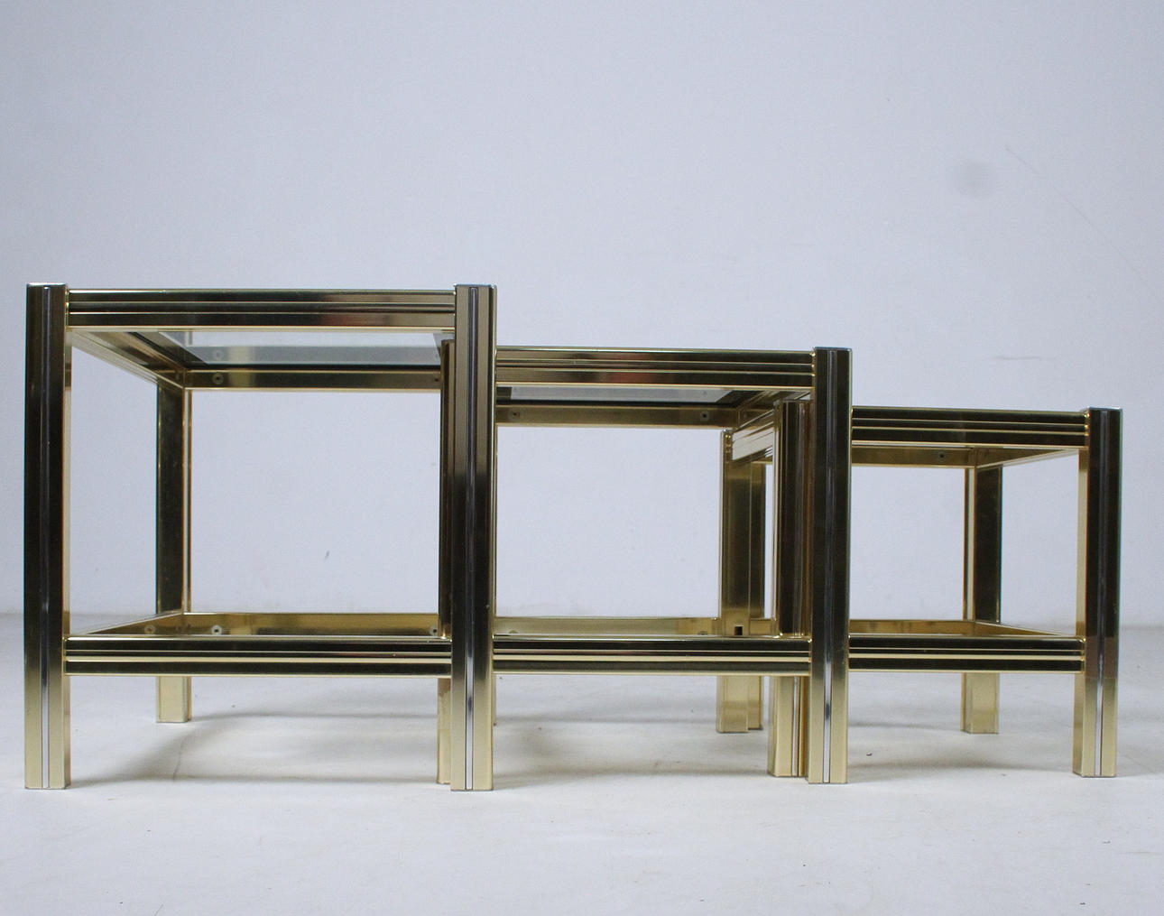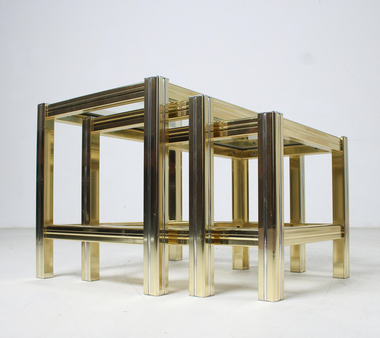 Conjunto de mesas nido al estilo de Maison Charles. Construcción rectangular realizada en metal cromado con incrustaciones de latón y placas de vidrio sueltas. H. 31/33/37, B. 34/37/44,5 cm, D. 38/41/51,5 cm.