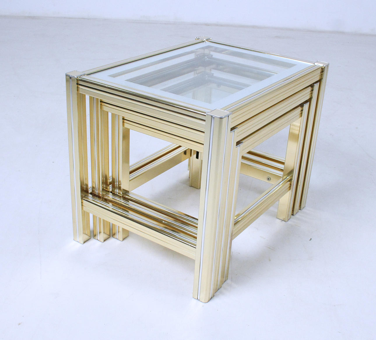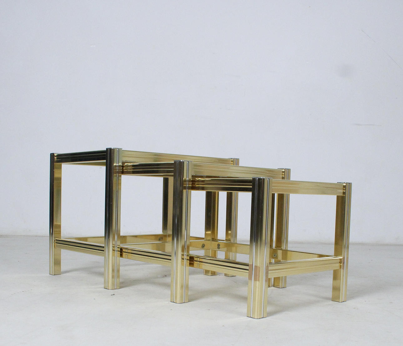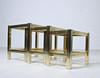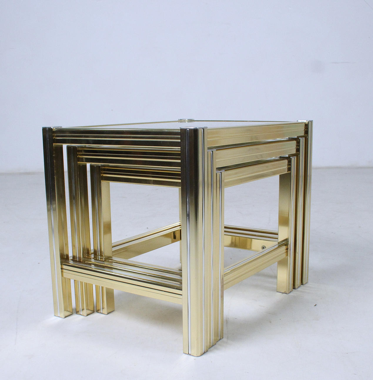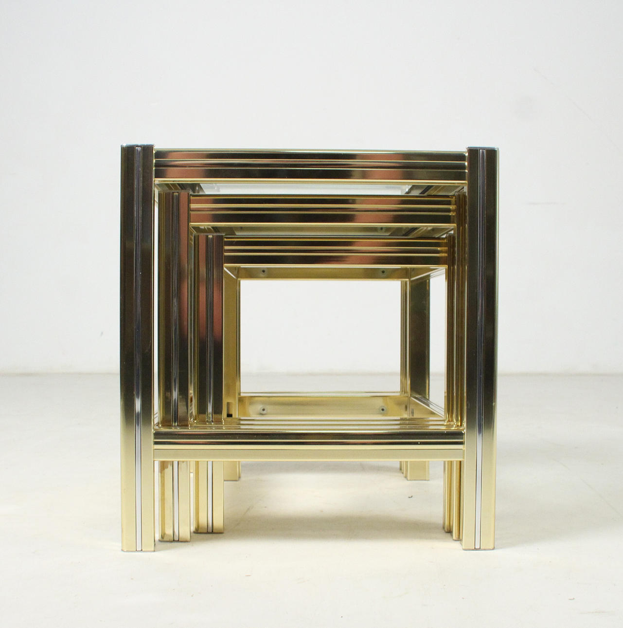 Conjunto de mesas nido al estilo de Maison Charles. Construcción rectangular realizada en metal cromado con incrustaciones de latón y placas de vidrio sueltas. H. 31/33/37, B. 34/37/44,5 cm, D. 38/41/51,5 cm.