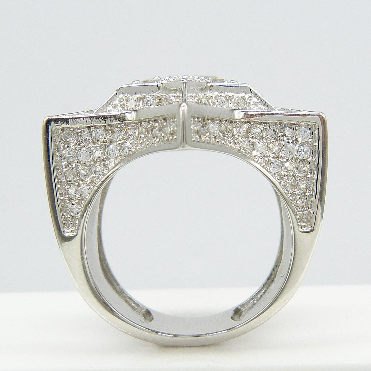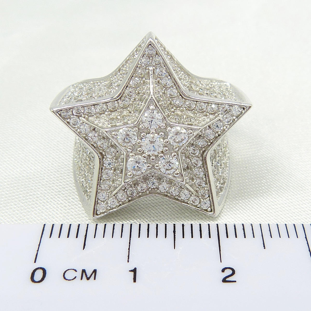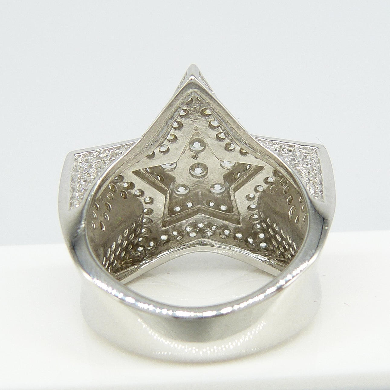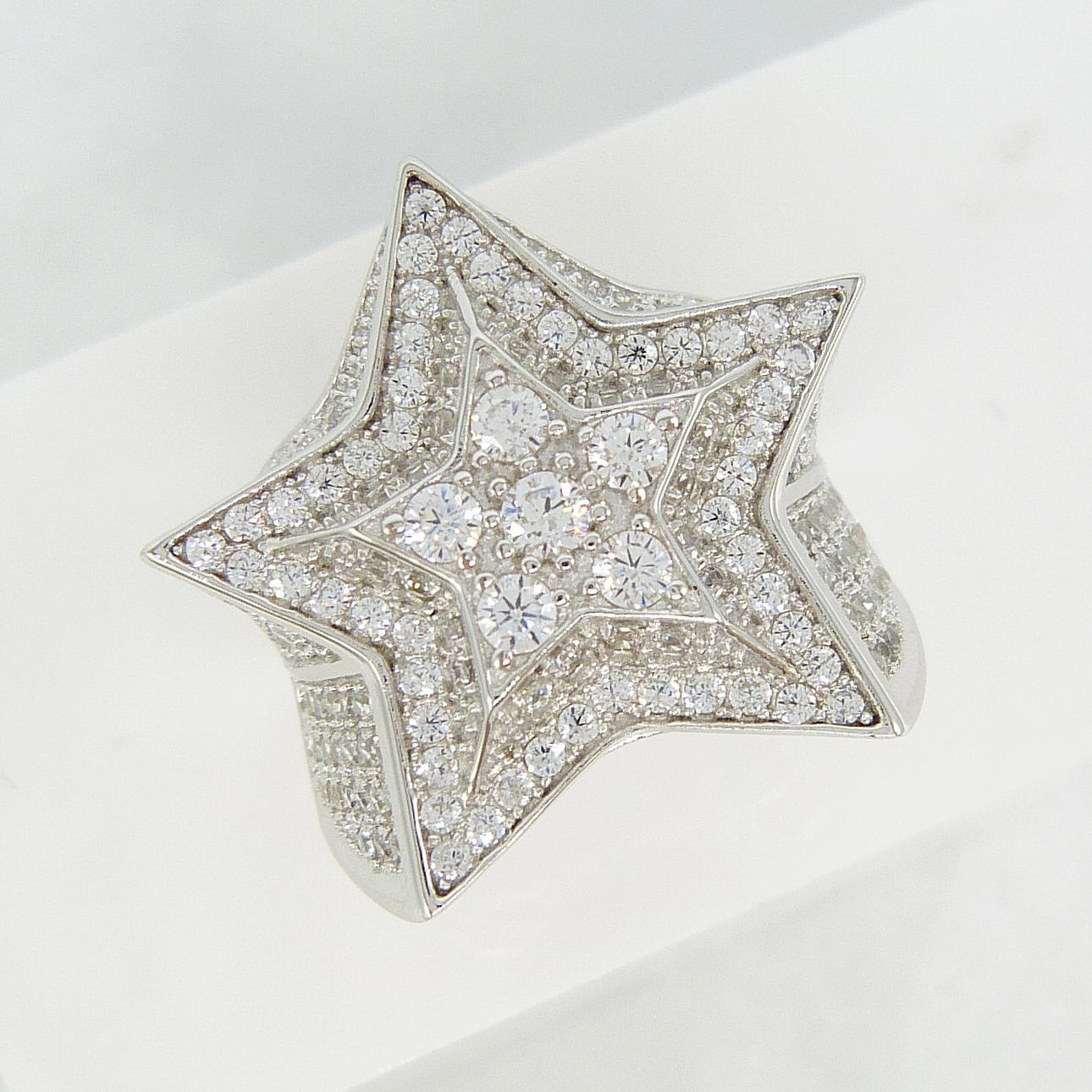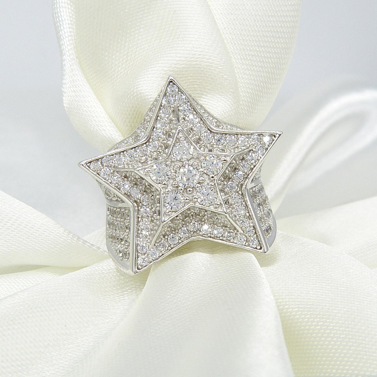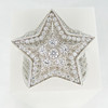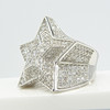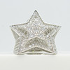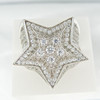Un anillo de vestir grande y emocionante en forma de estrella en plata engastado con cientos de piedras de zirconia cúbica blancas de corte redondo.