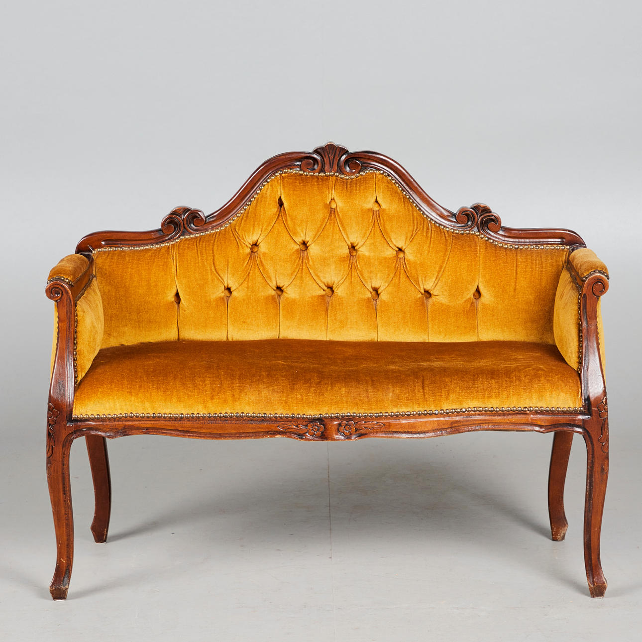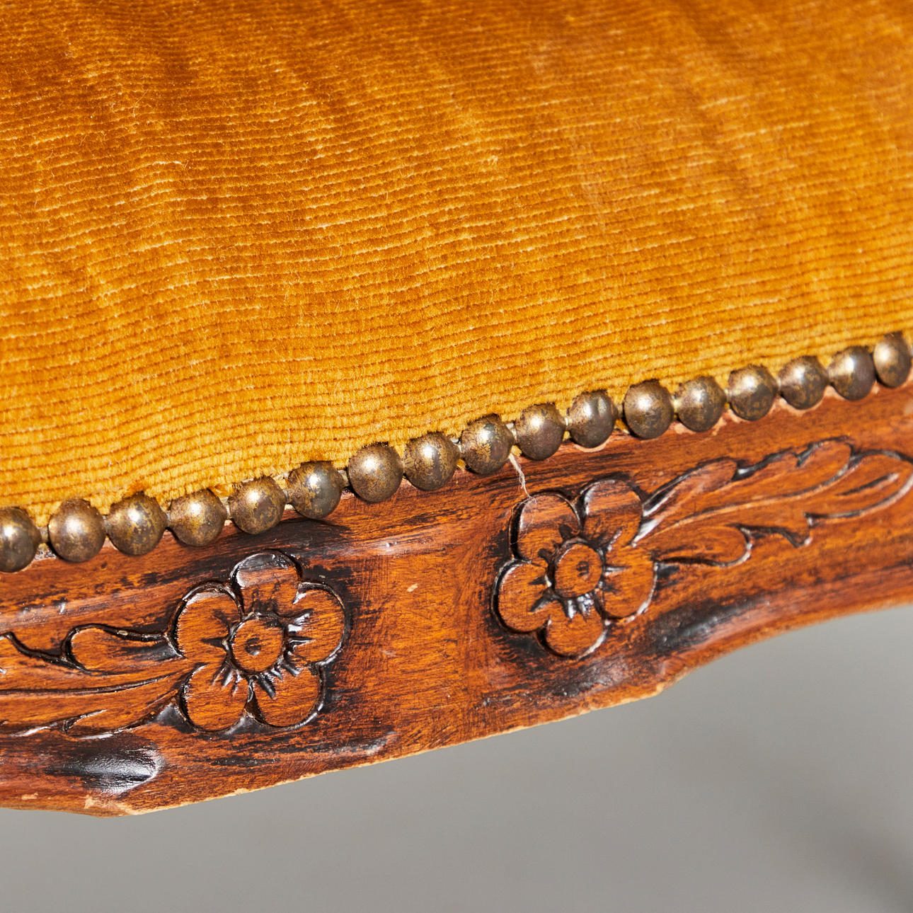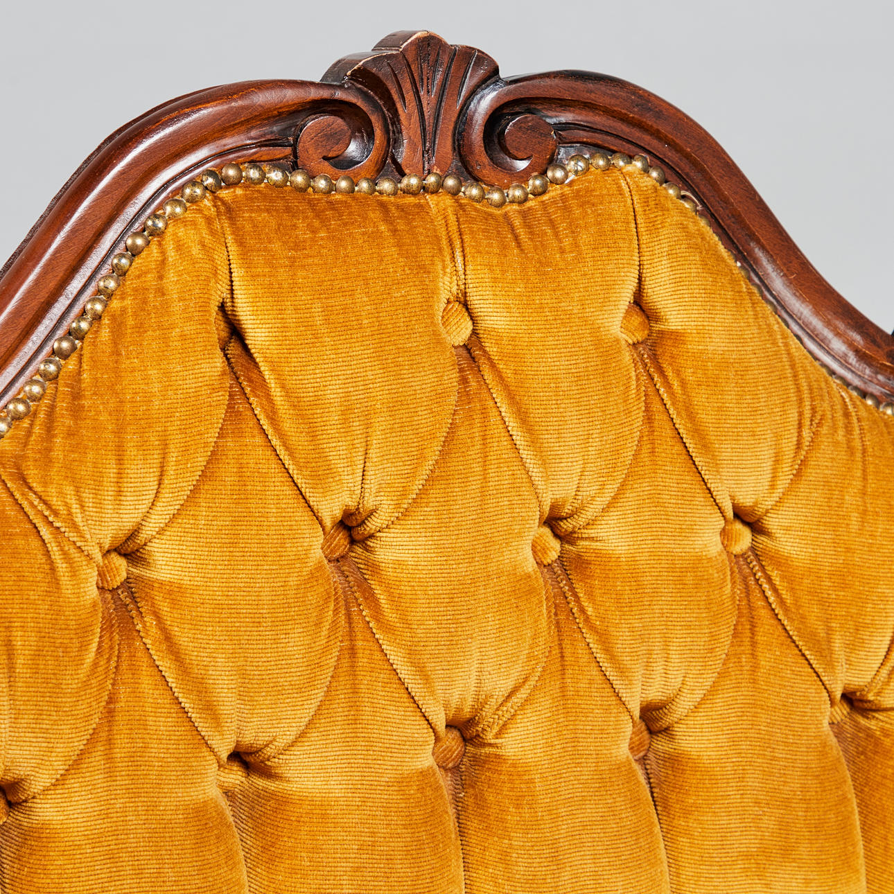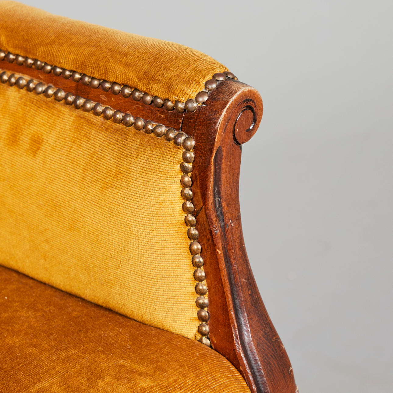 Sofá/banco de estilo barroco, madera, terciopelo. Banco realizado en madera barnizada con reposabrazos y patas cabriolé, así como respaldo curvo con adornos en forma de voluta, tapizado y revestido en velour amarillo indio, decorado con botonadura y remaches, H.93cm, altura asiento: 40cm, L.106cm , A. 44cm.