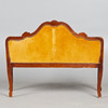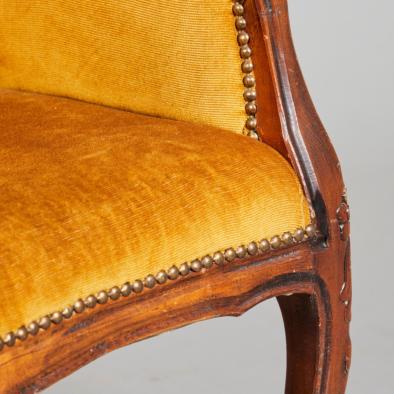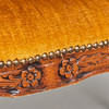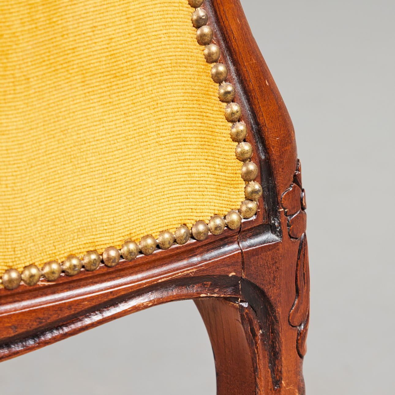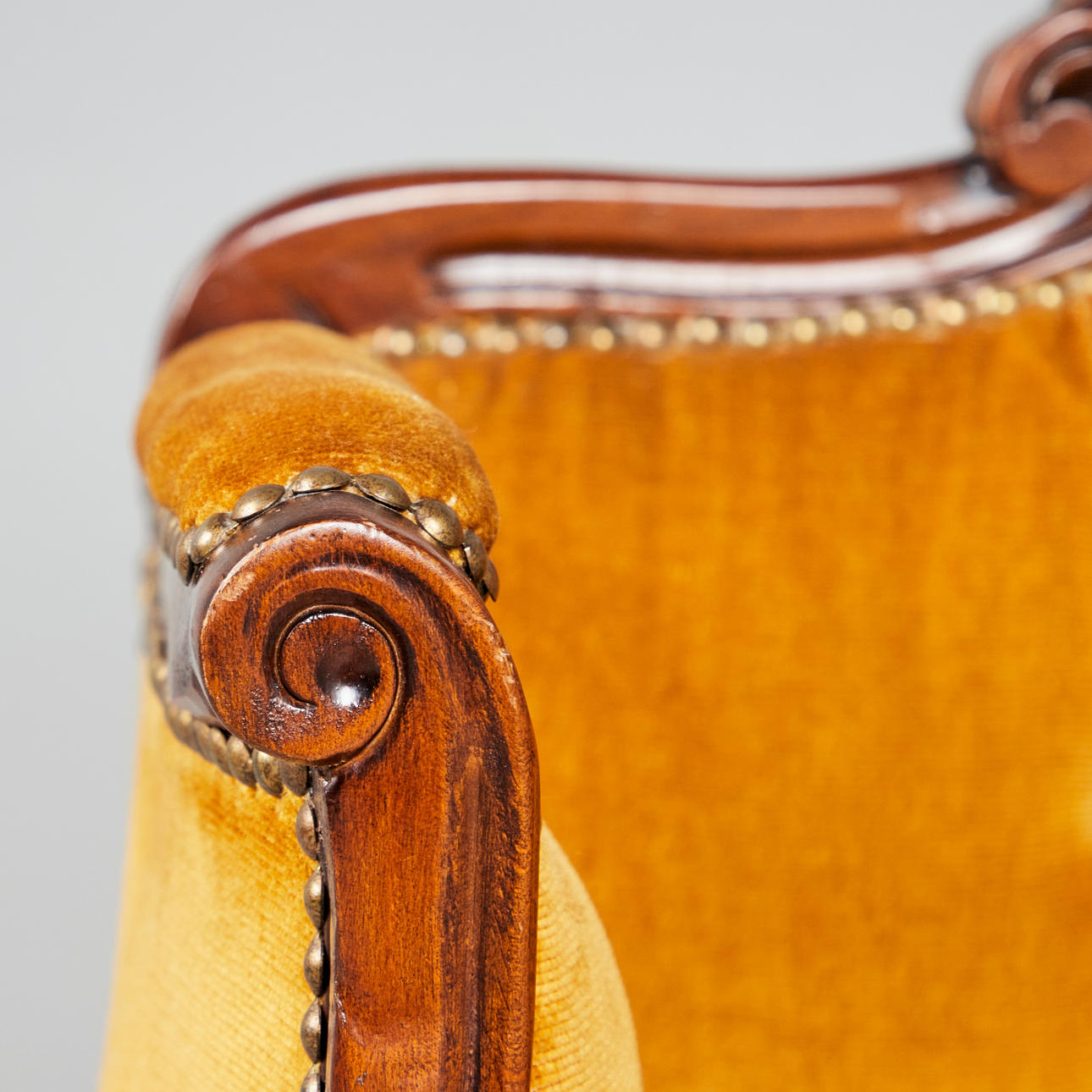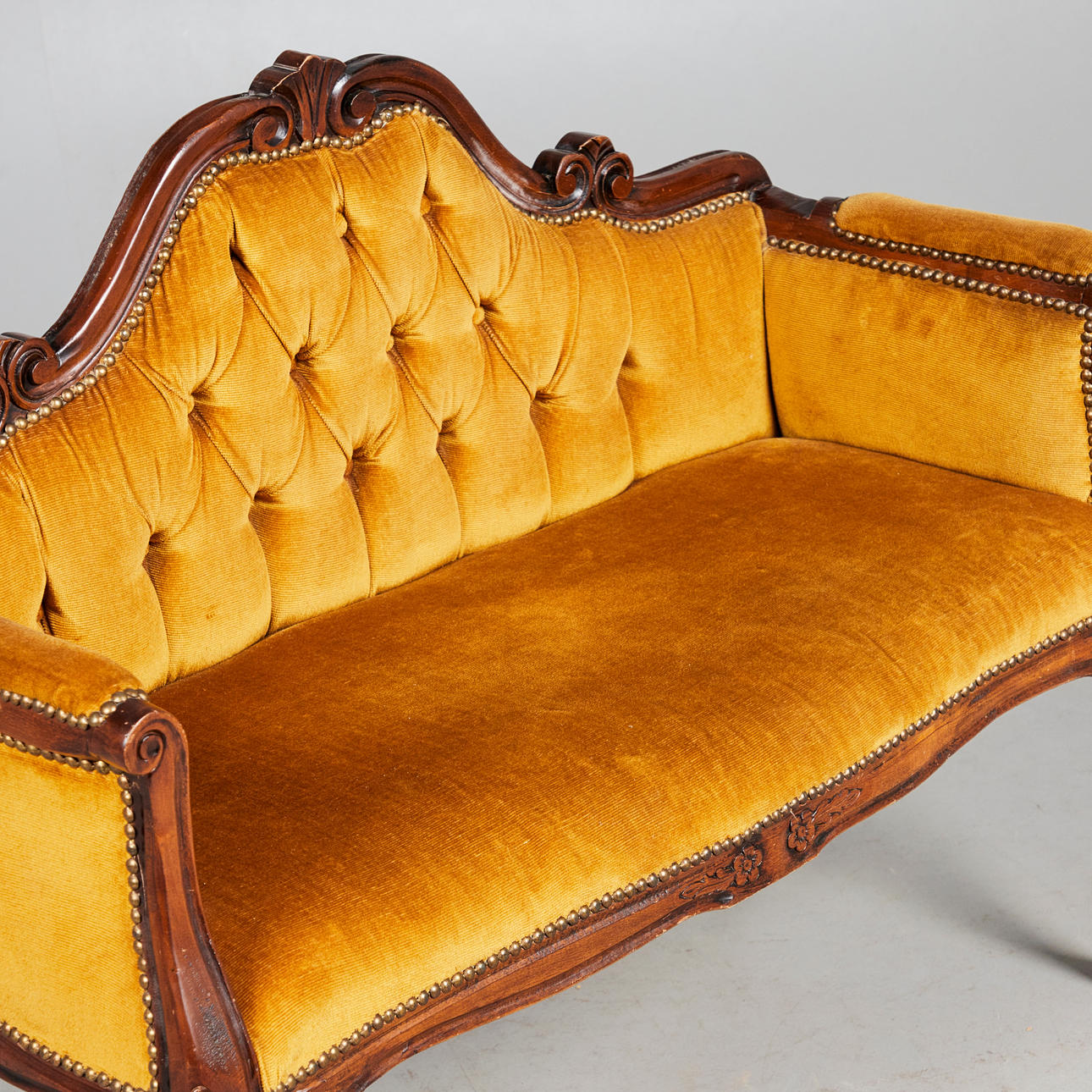 Sofá/banco de estilo barroco, madera, terciopelo. Banco realizado en madera barnizada con reposabrazos y patas cabriolé, así como respaldo curvo con adornos en forma de voluta, tapizado y revestido en velour amarillo indio, decorado con botonadura y remaches, H.93cm, altura asiento: 40cm, L.106cm , A. 44cm.