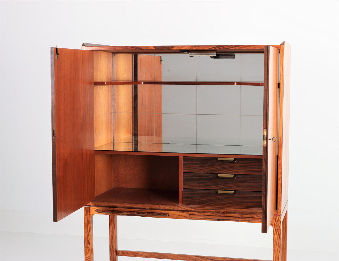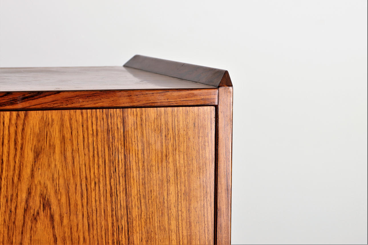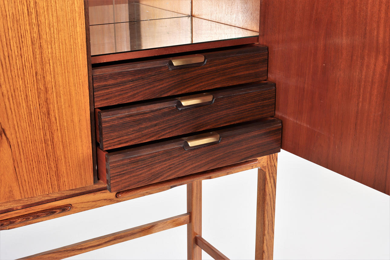 Mueble bar en palisandro con patas. Paneles extraíbles, cajones internos, estante y espejo de vidrio e iluminación.