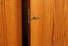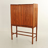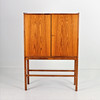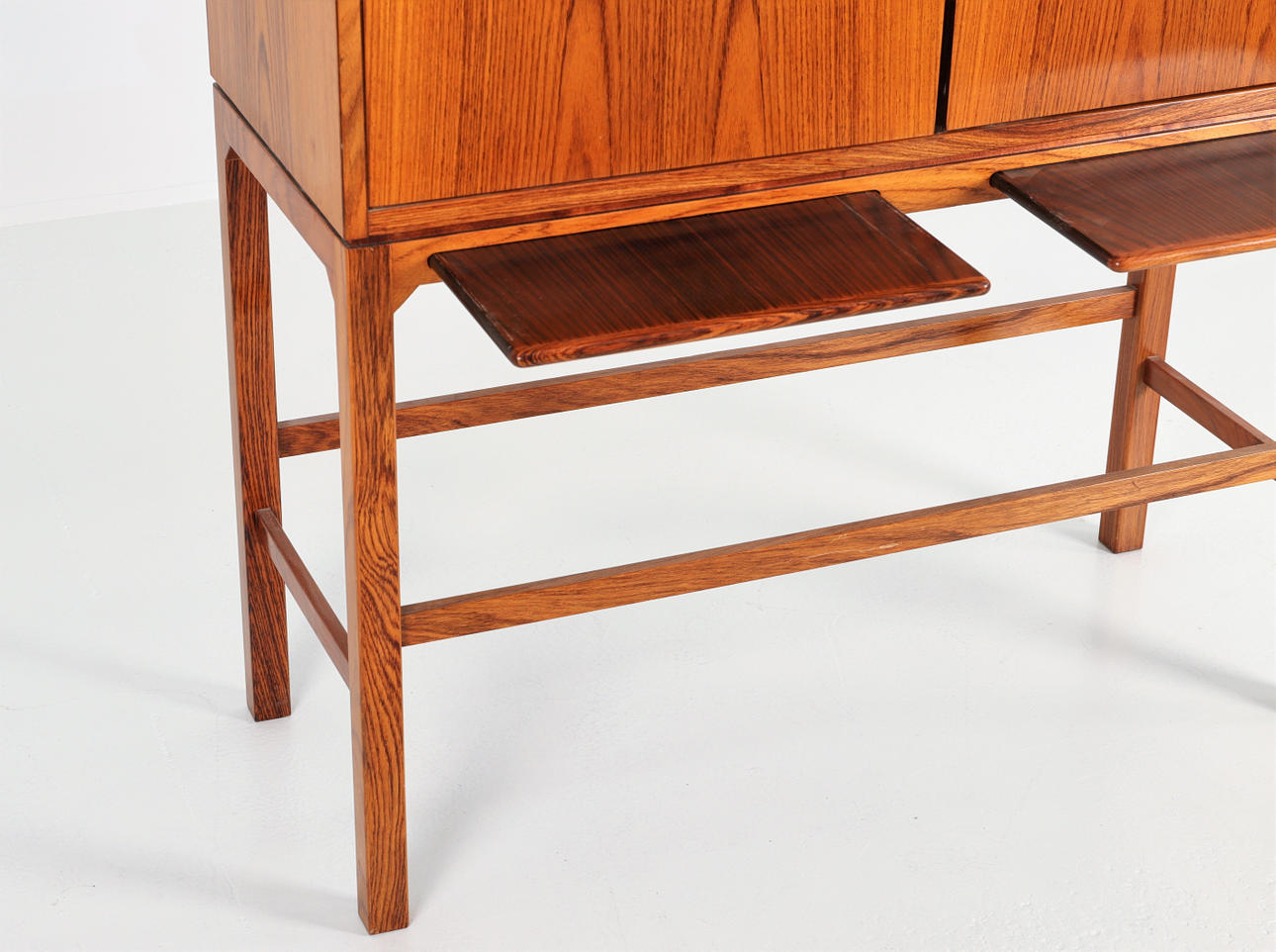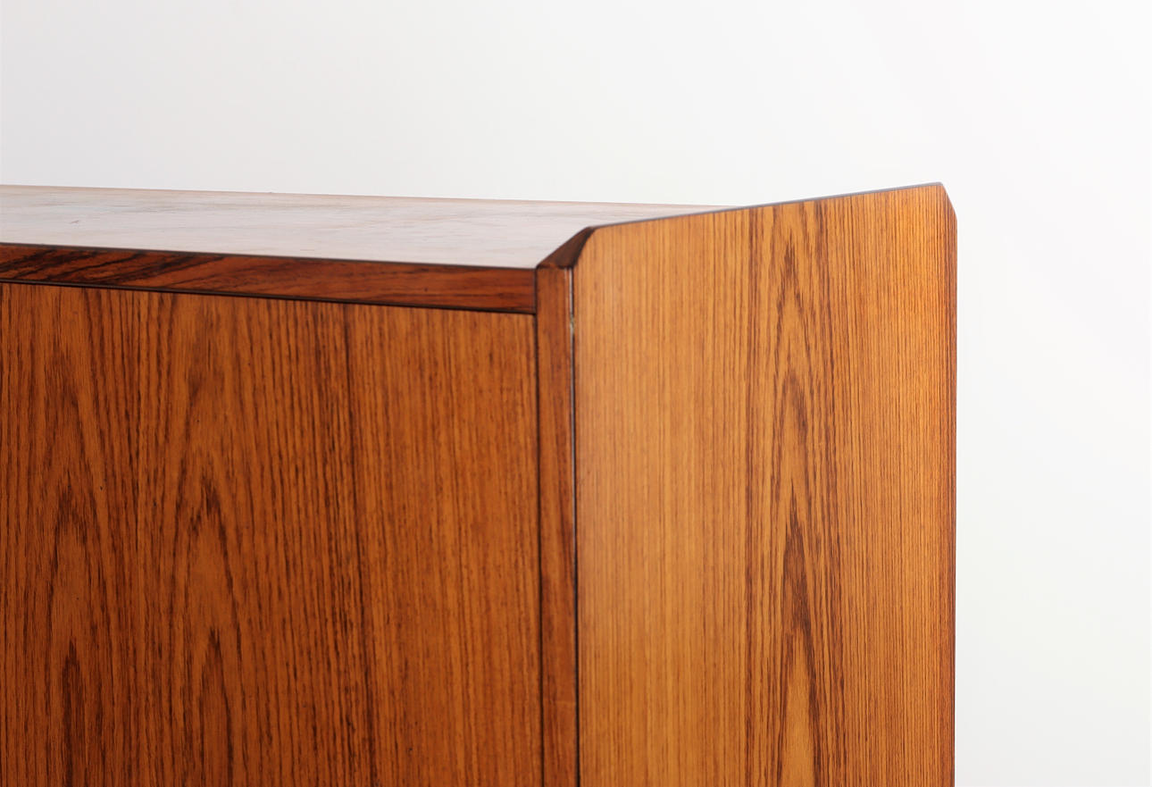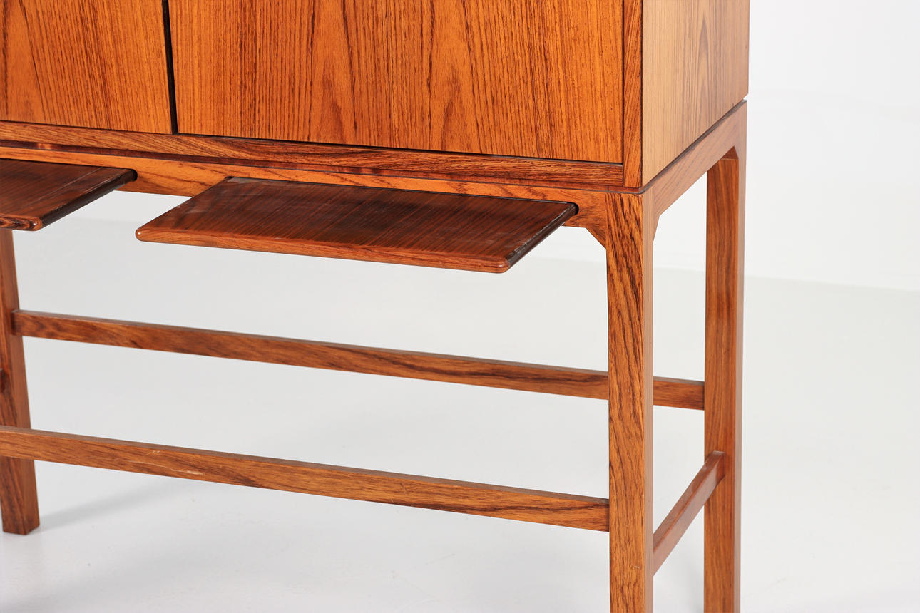 Mueble bar en palisandro con patas. Paneles extraíbles, cajones internos, estante y espejo de vidrio e iluminación.