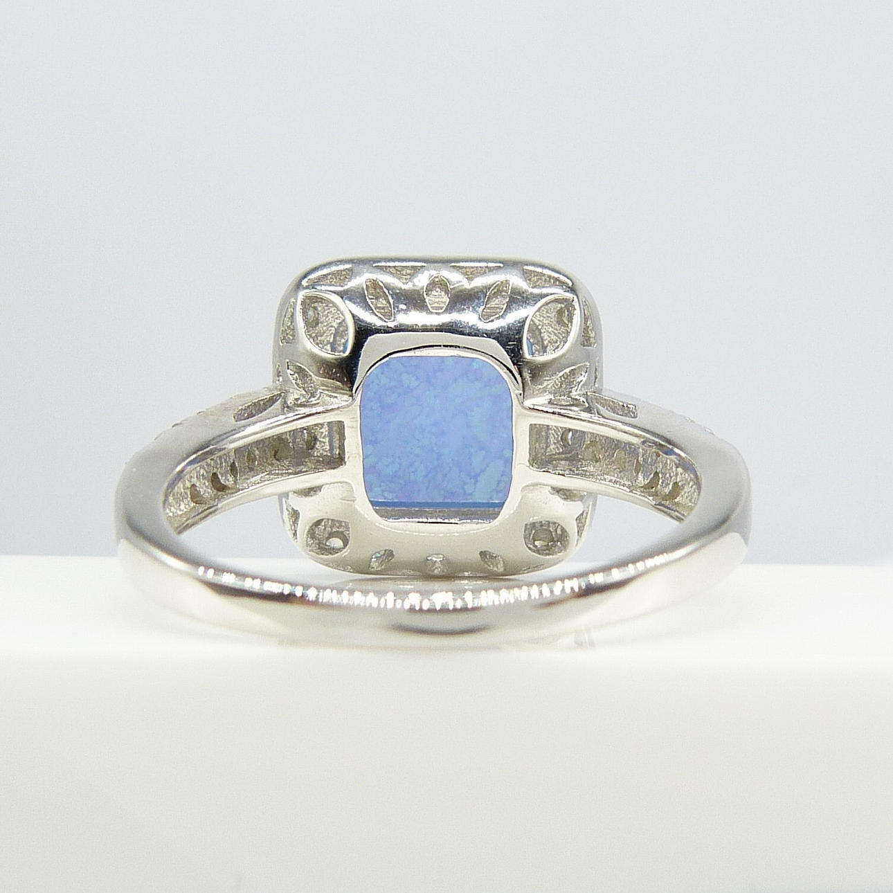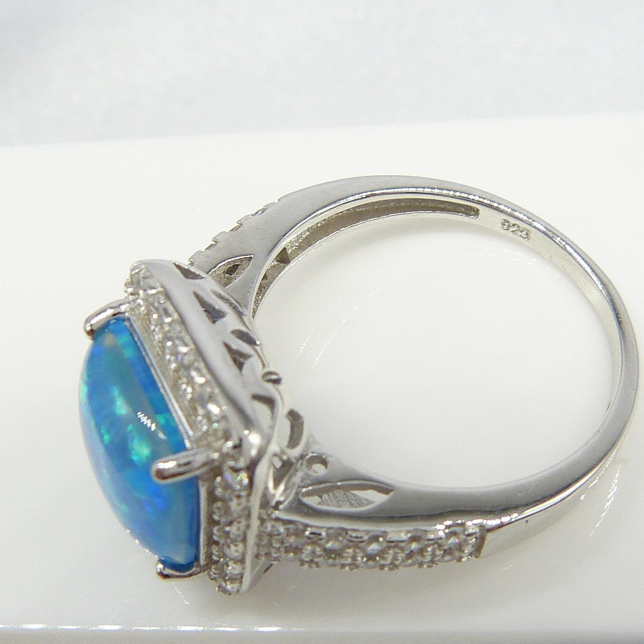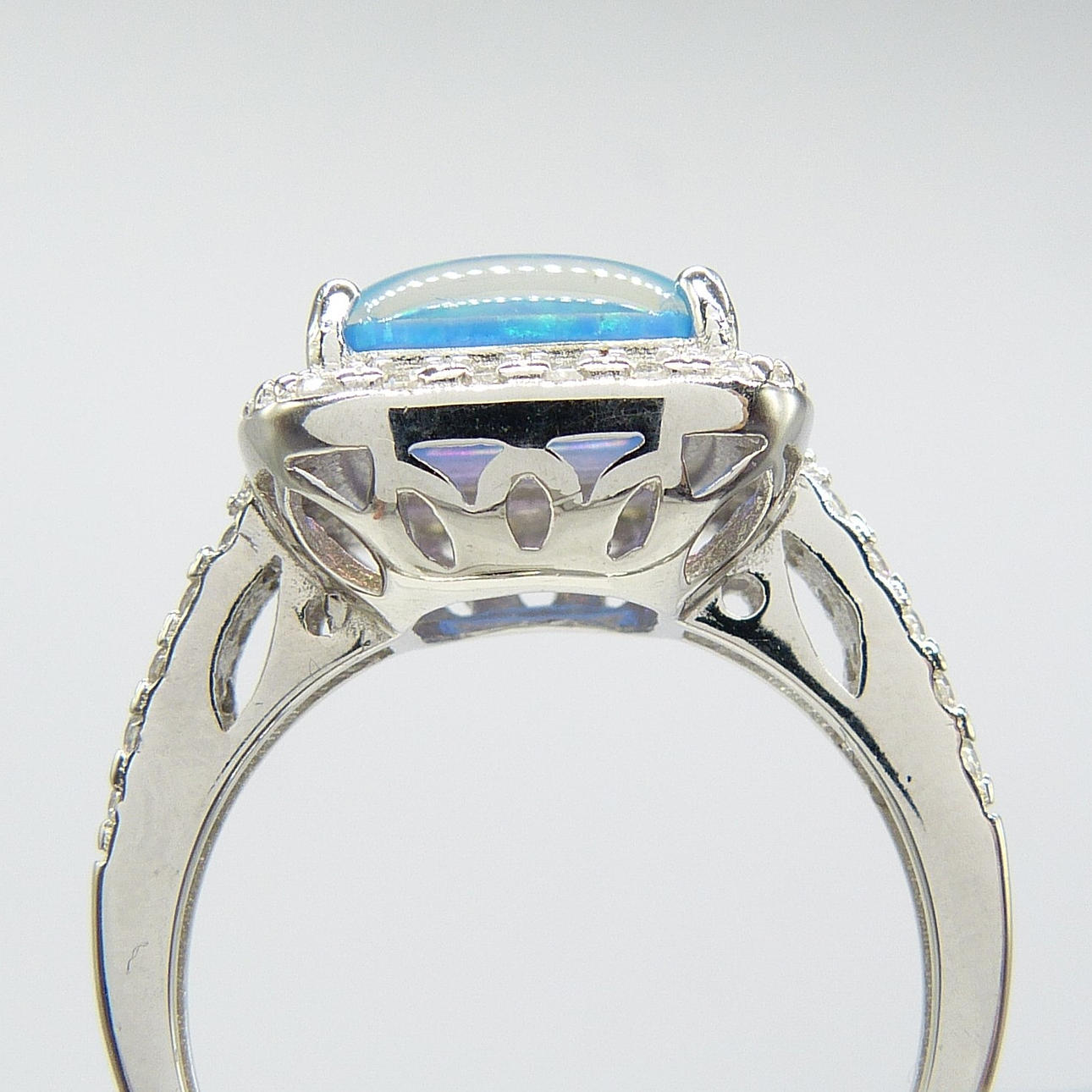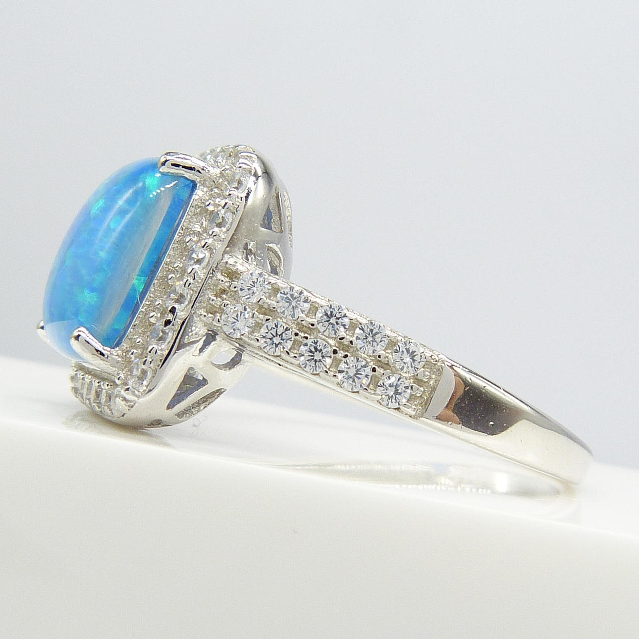 Varias pequeñas circonitas cúbicas blancas de corte redondo están engastadas en un marco alrededor del opalito y en dos filas en cada hombro.