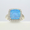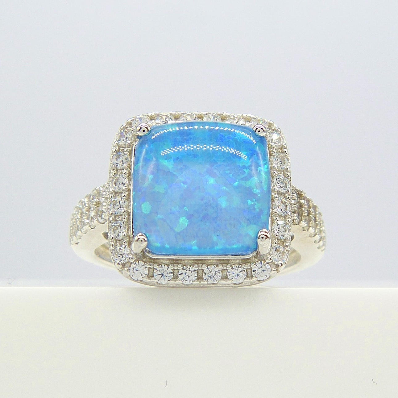 Este anillo está engastado con garras y tiene un cabujón cuadrado redondeado de opalita azul vivo en el centro. Este opalito mide 10 x 10mm aprox.