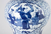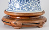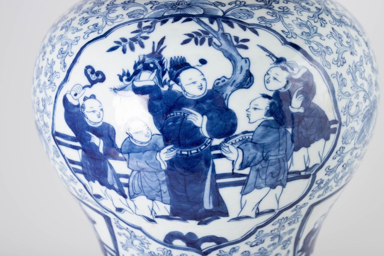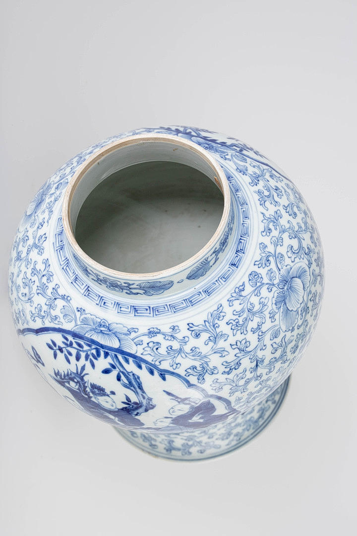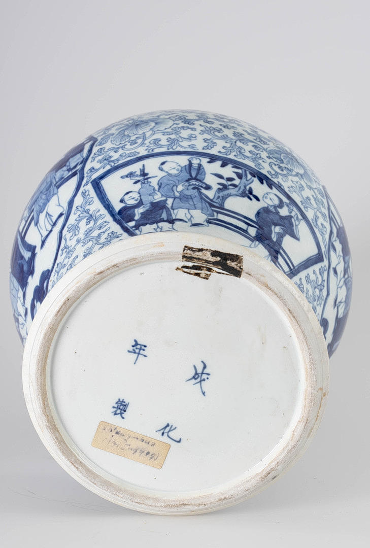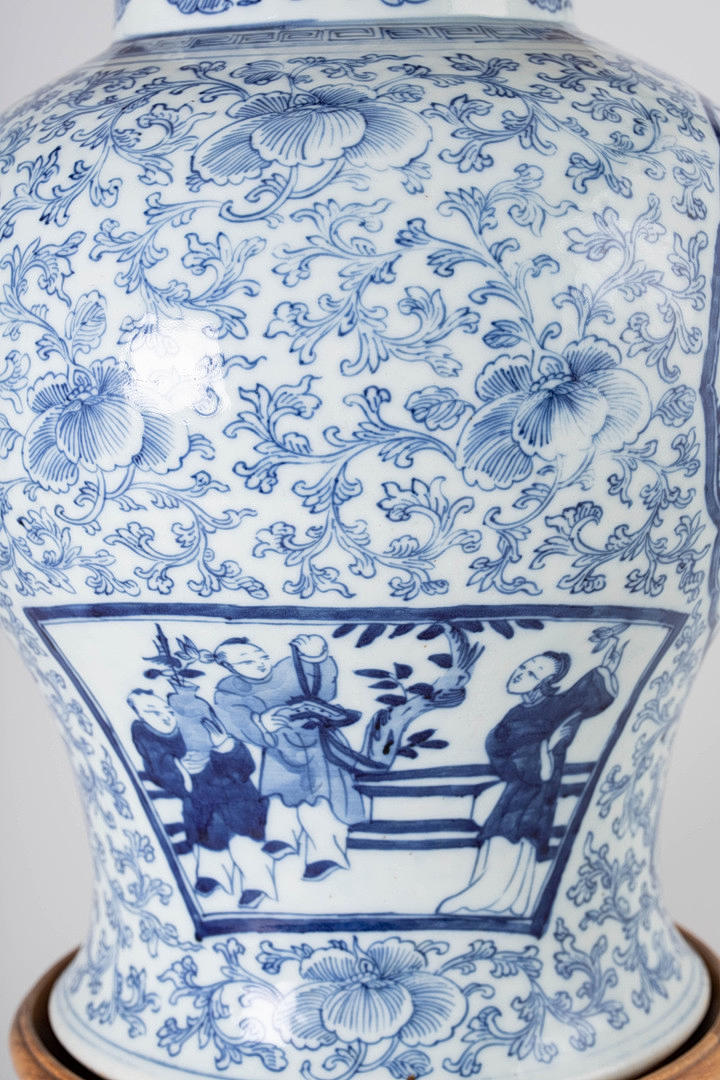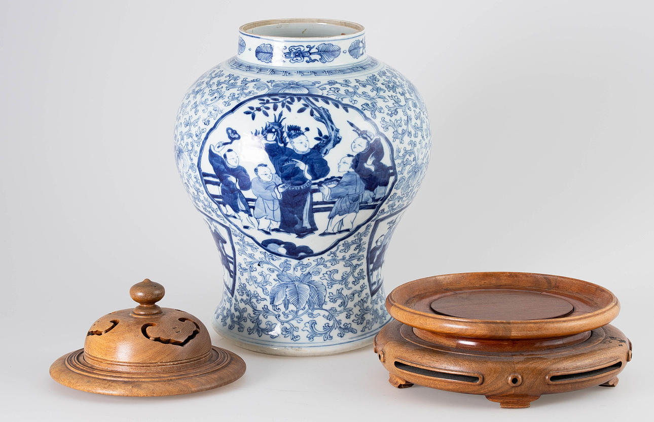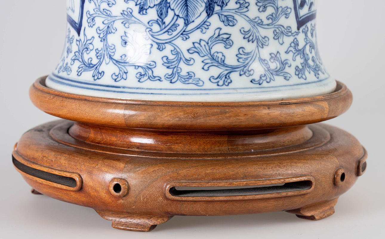 En forma de balaustre, decorado en azul vidriado con densos zarcillos de flores de crisantemo, cuatro cartuchos redondos o en forma de abanico con escenas figurativas y niños en un paisaje de jardín. Marca de cuatro caracteres Cheng Hua Nian Zhi. Base de madera tallada en hueco y tapa de madera abovedada con pomo ovalado puntiagudo. Alt. 33 / 49 cm, Ø 27 cm.