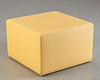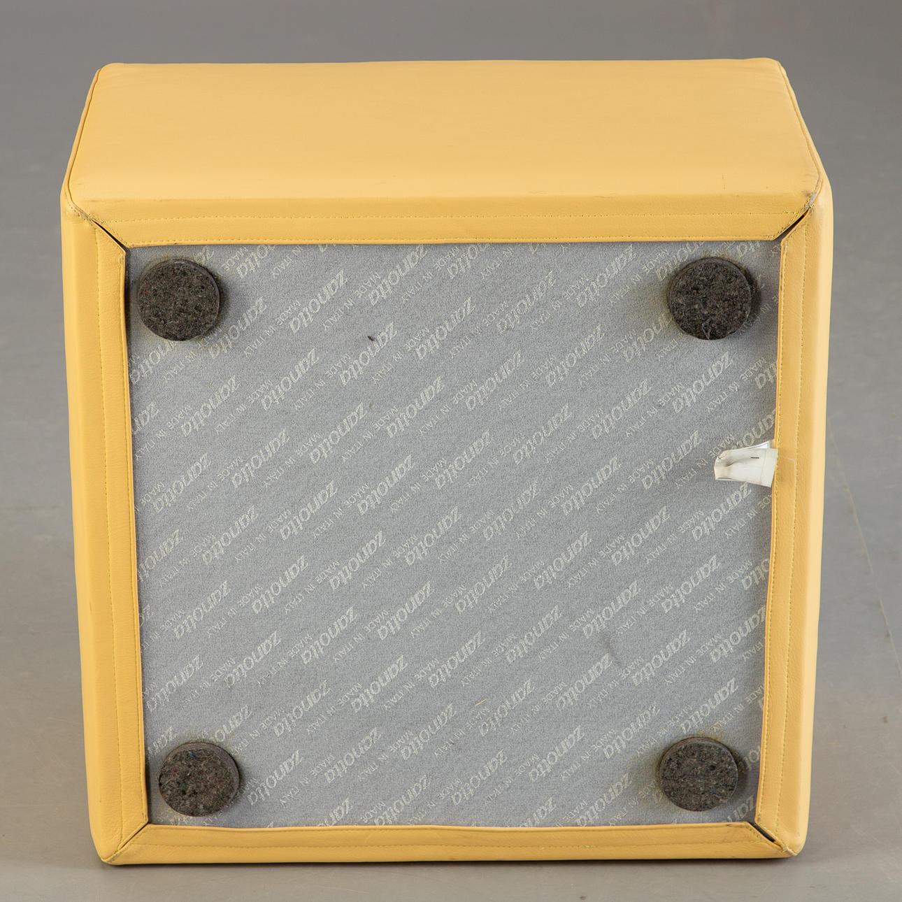 Taburete de Zanotta. Cubierta de cuero en amarillo sol pastel, pies de fieltro.