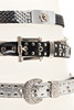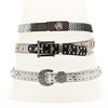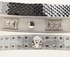 Cinturón plateado de cuero artificial con pedrería y mascarones de león en metal blanco, longitud aproximada de 83-94 cm.
