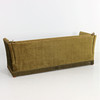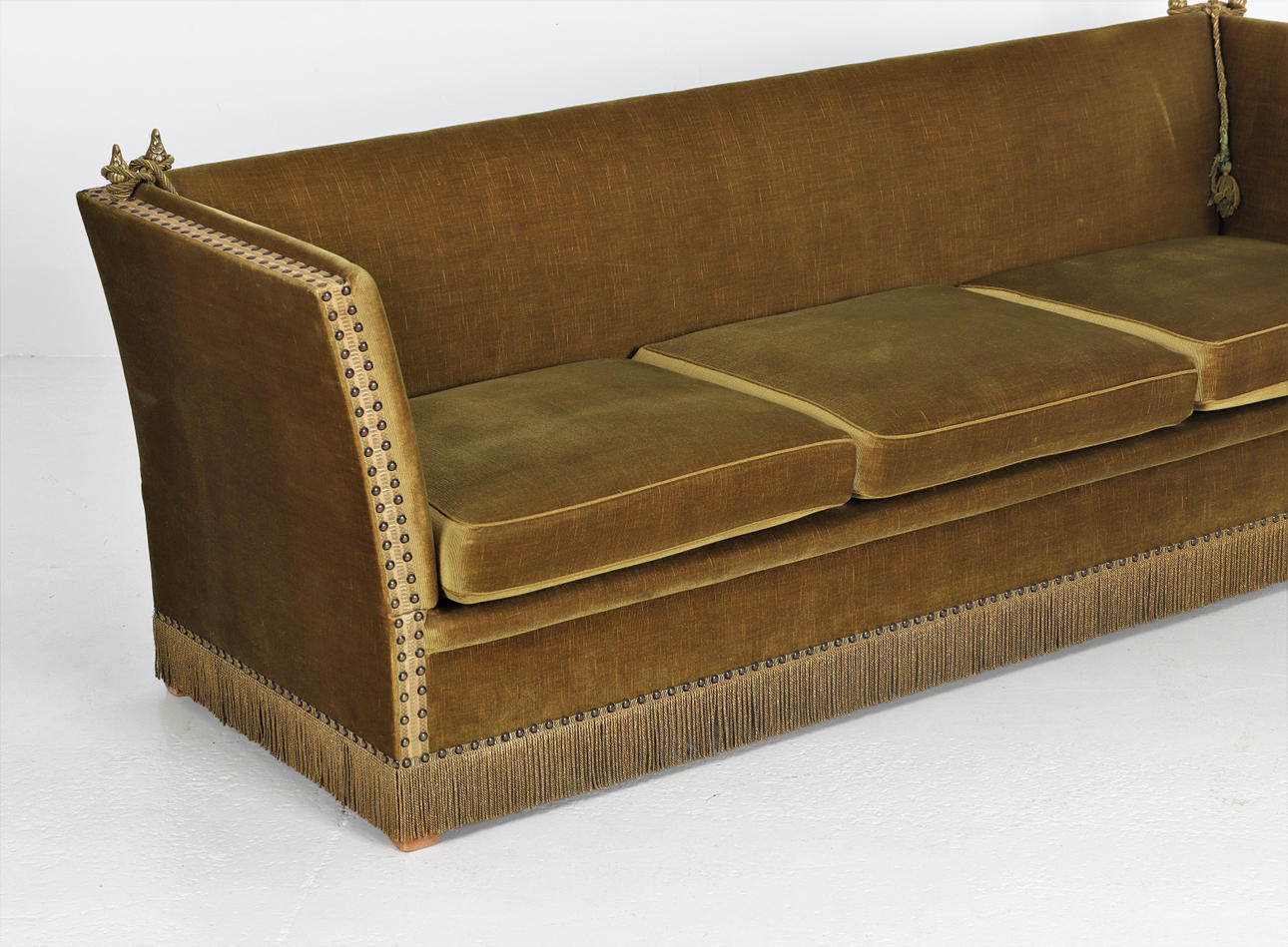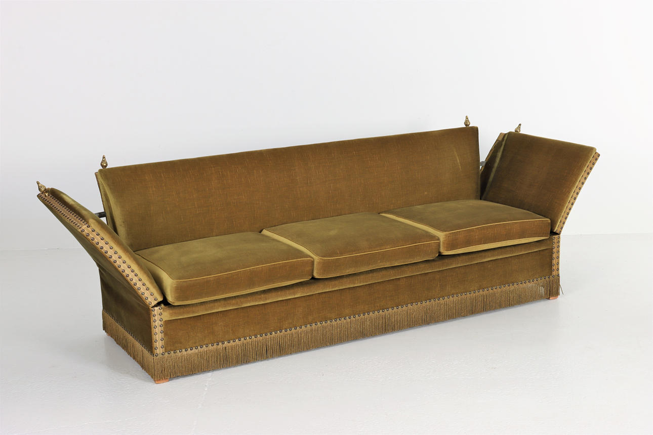 Sofá Knole, 3 plazas, laterales abatibles, felpa verde, totalmente tapizado, cenefa de pedrería, 3 cojines sueltos, tiradores de latón.