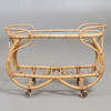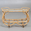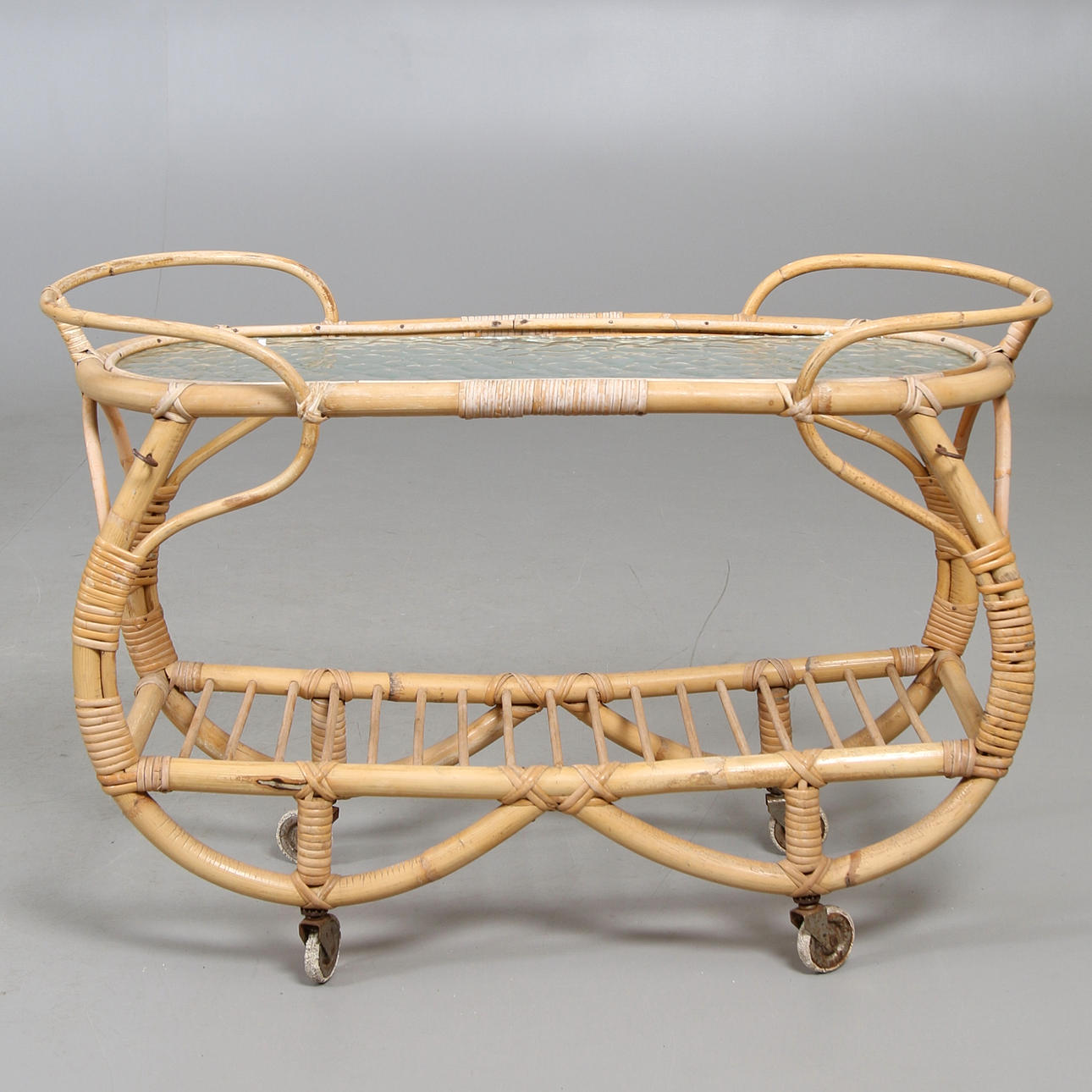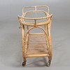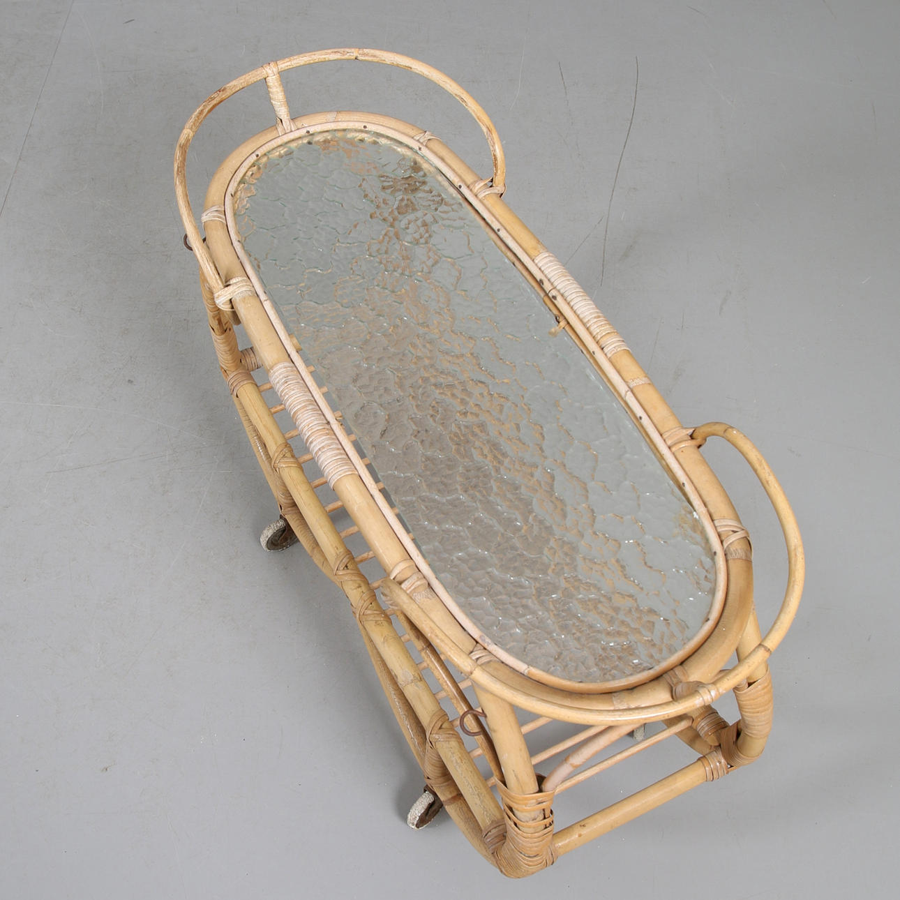 Sobre ruedas. Tapa de cristal, así como un estante inferior. Longitud aprox. 74, ancho 29,5, alto 51 cm.