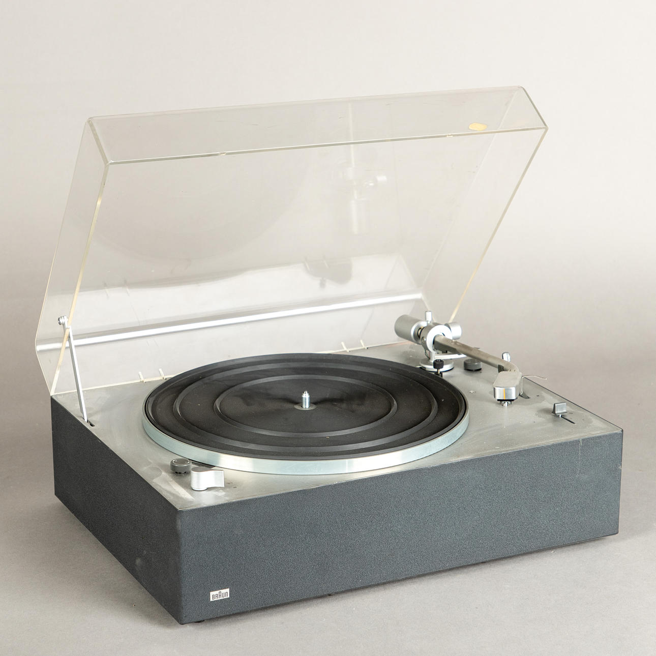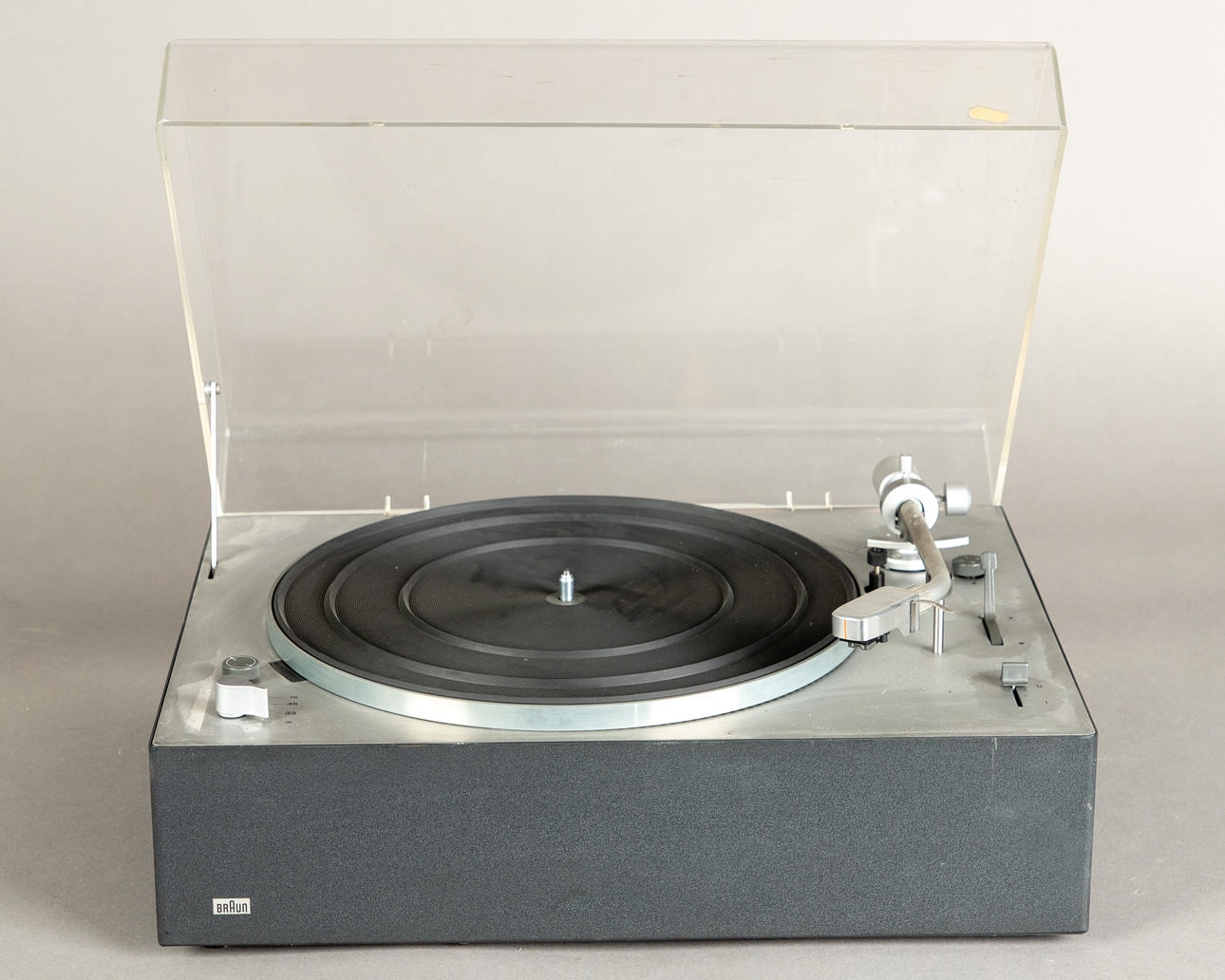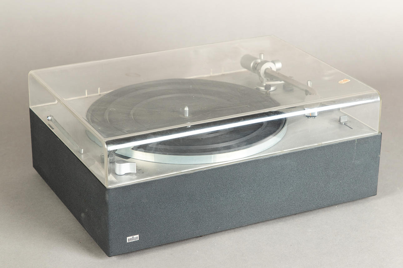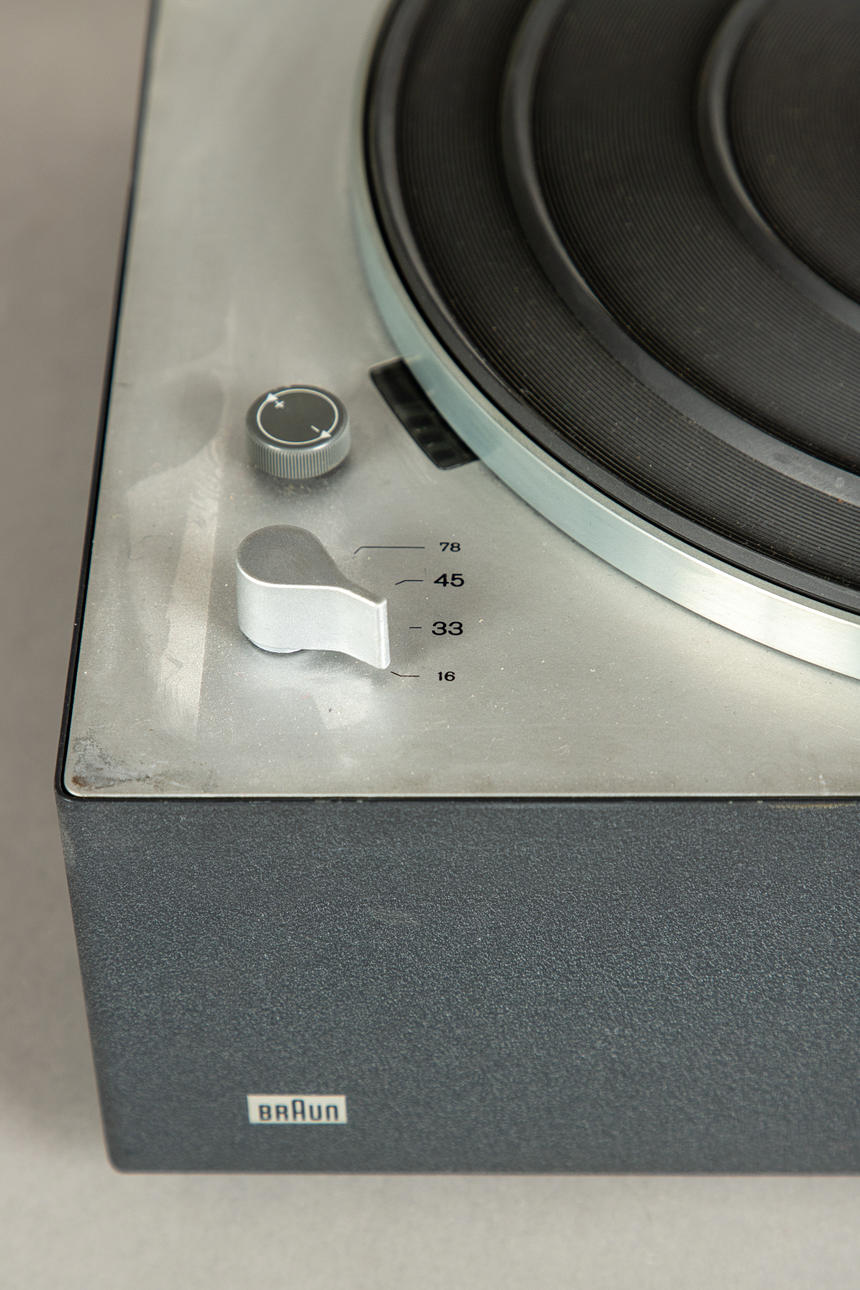 plástico/metal Tocadiscos Braun PS 1000, accionamiento con motor síncrono. Velocidad 13/33/45/78. Rango de ajuste fino de velocidad +/- 3%.