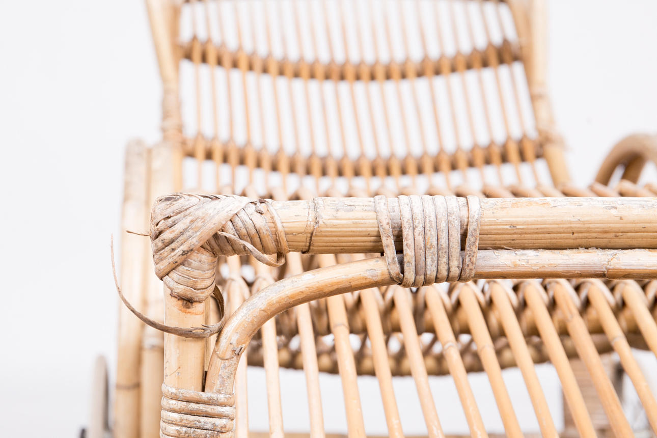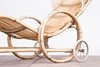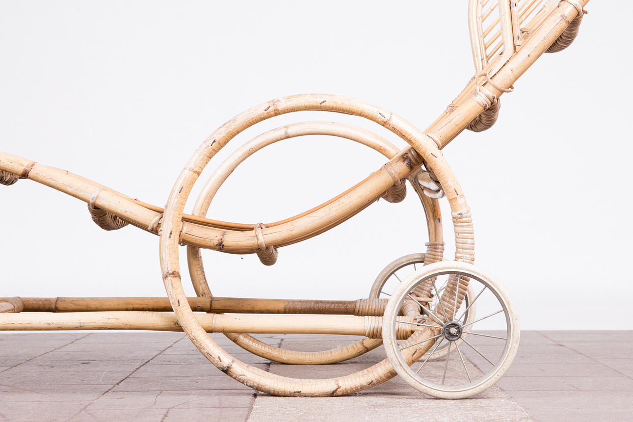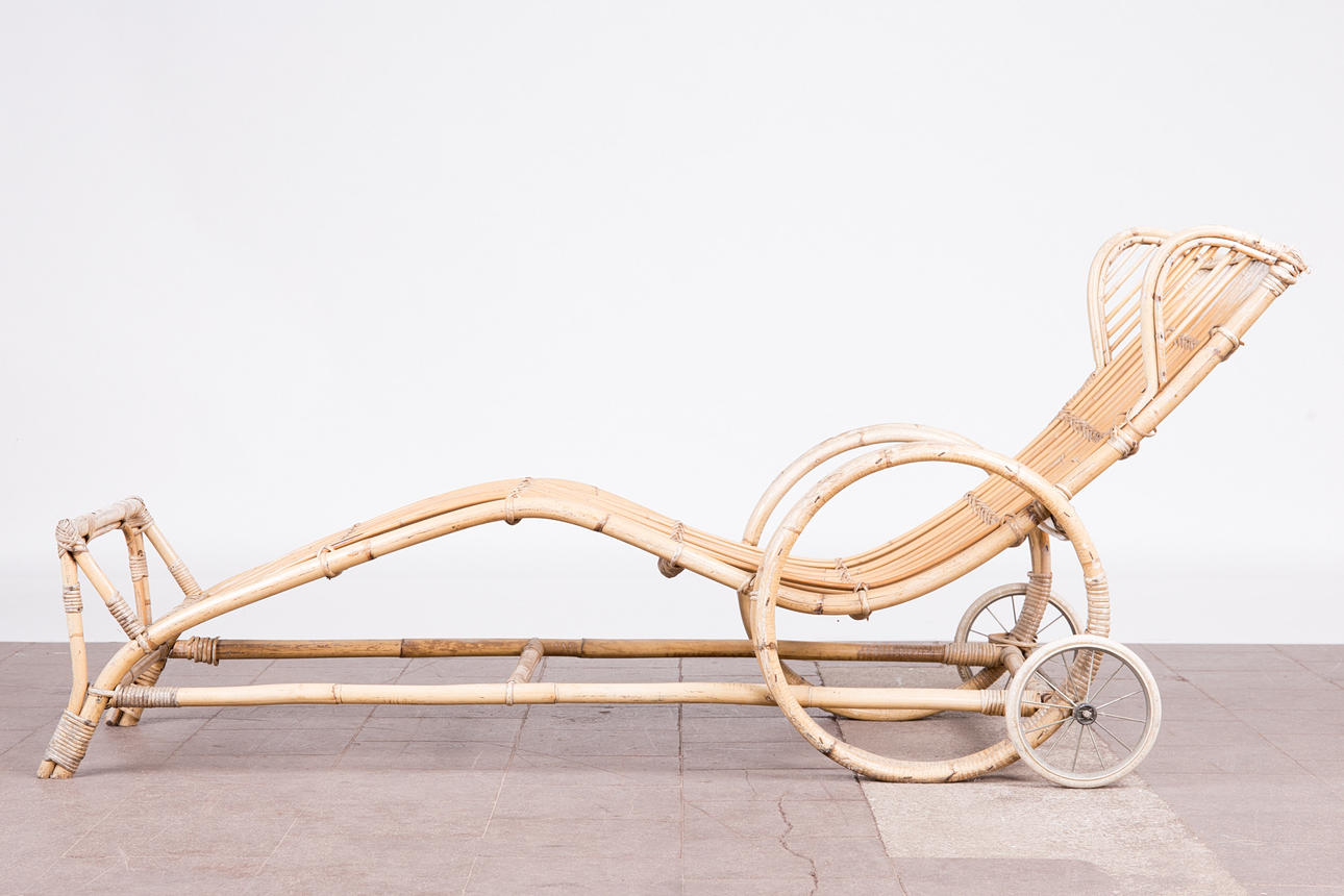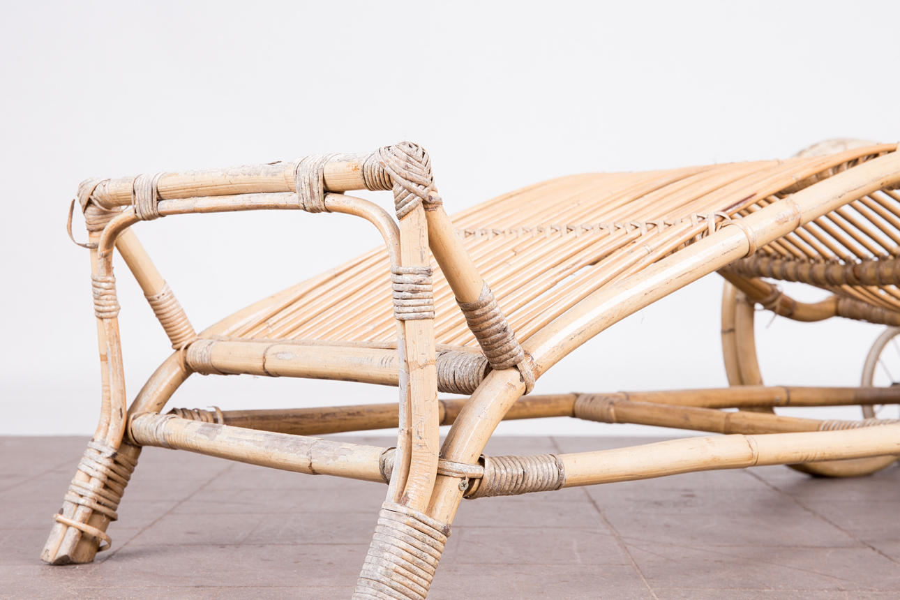 Tumbona, bambú, años 50. Construcción de bambú curvo con reposabrazos y dos ruedas de metal, H.80cm, L.170cm, W.63cm.