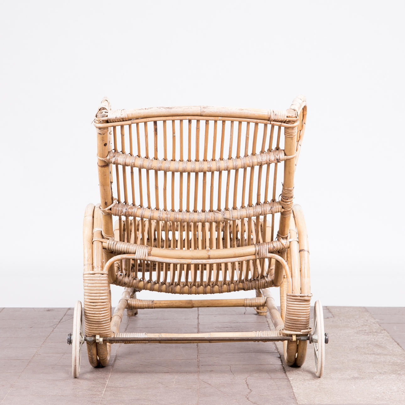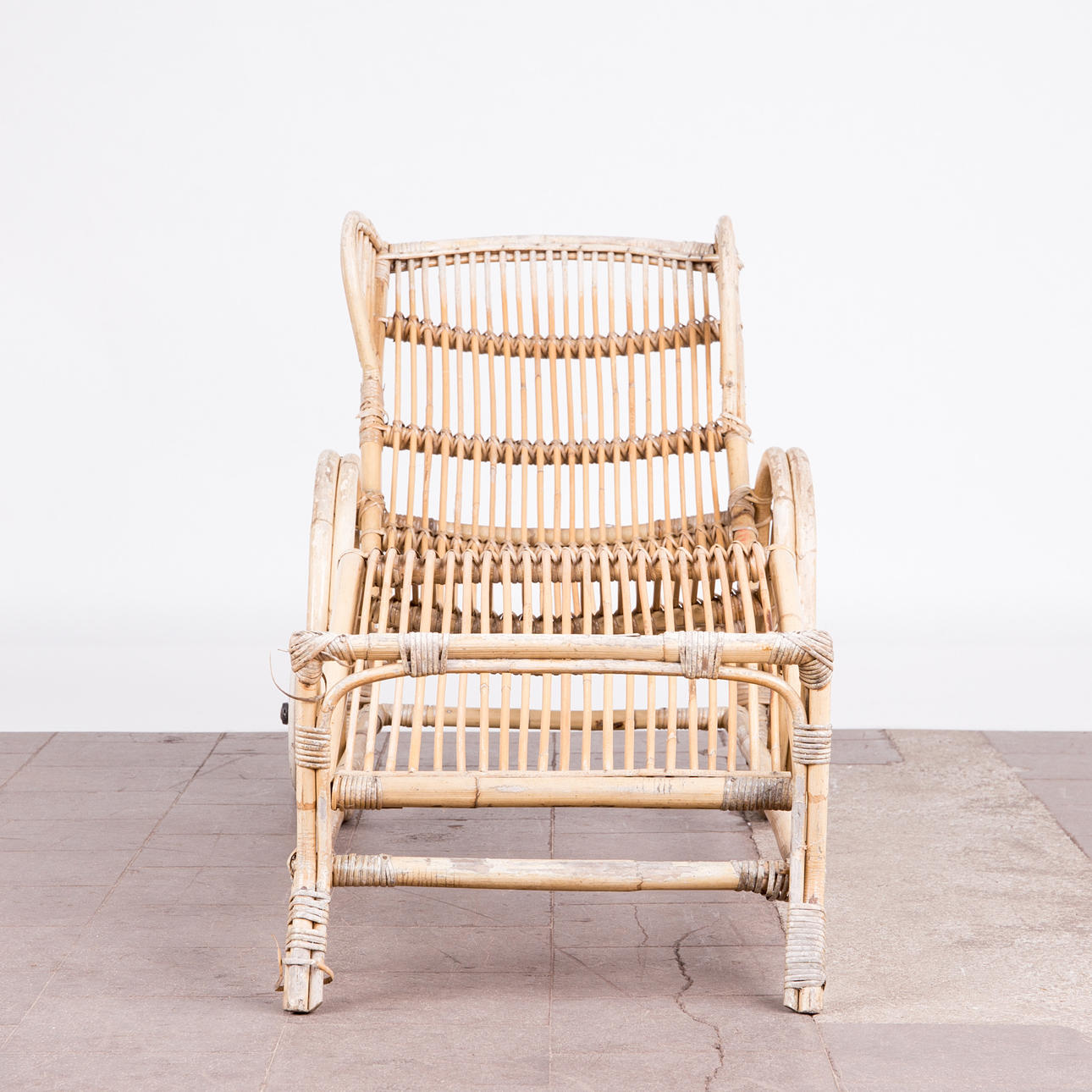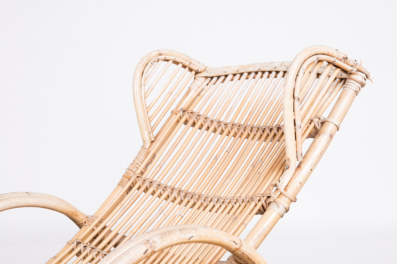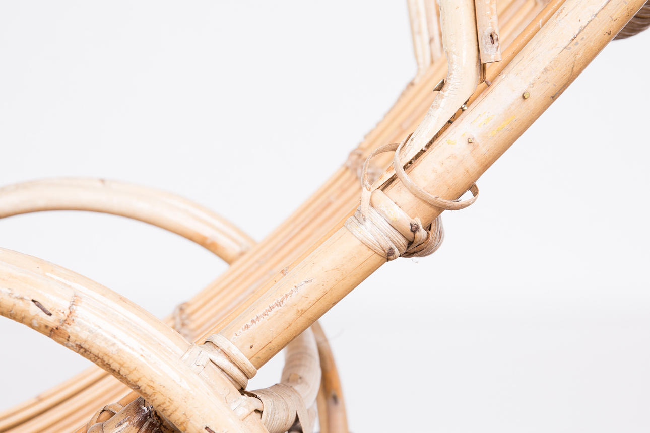 Tumbona, bambú, años 50. Construcción de bambú curvo con reposabrazos y dos ruedas de metal, H.80cm, L.170cm, W.63cm.