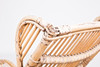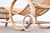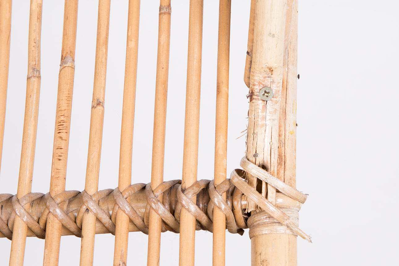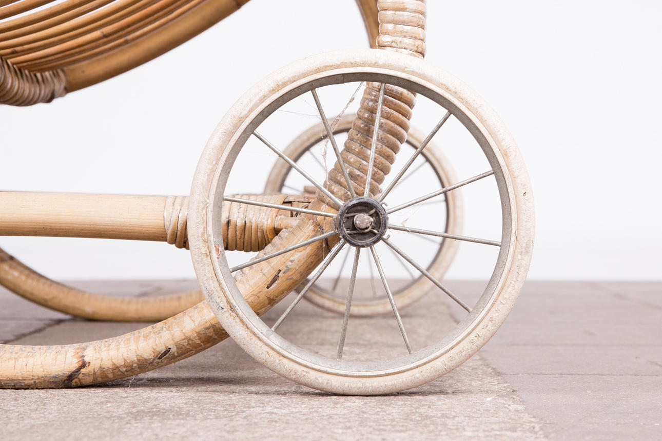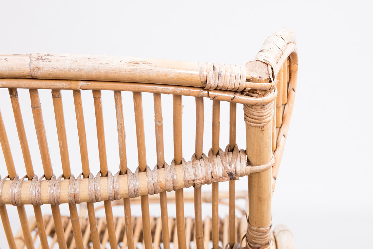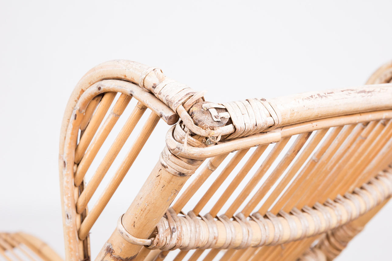Tumbona, bambú, años 50. Construcción de bambú curvo con reposabrazos y dos ruedas de metal, H.80cm, L.170cm, W.63cm.