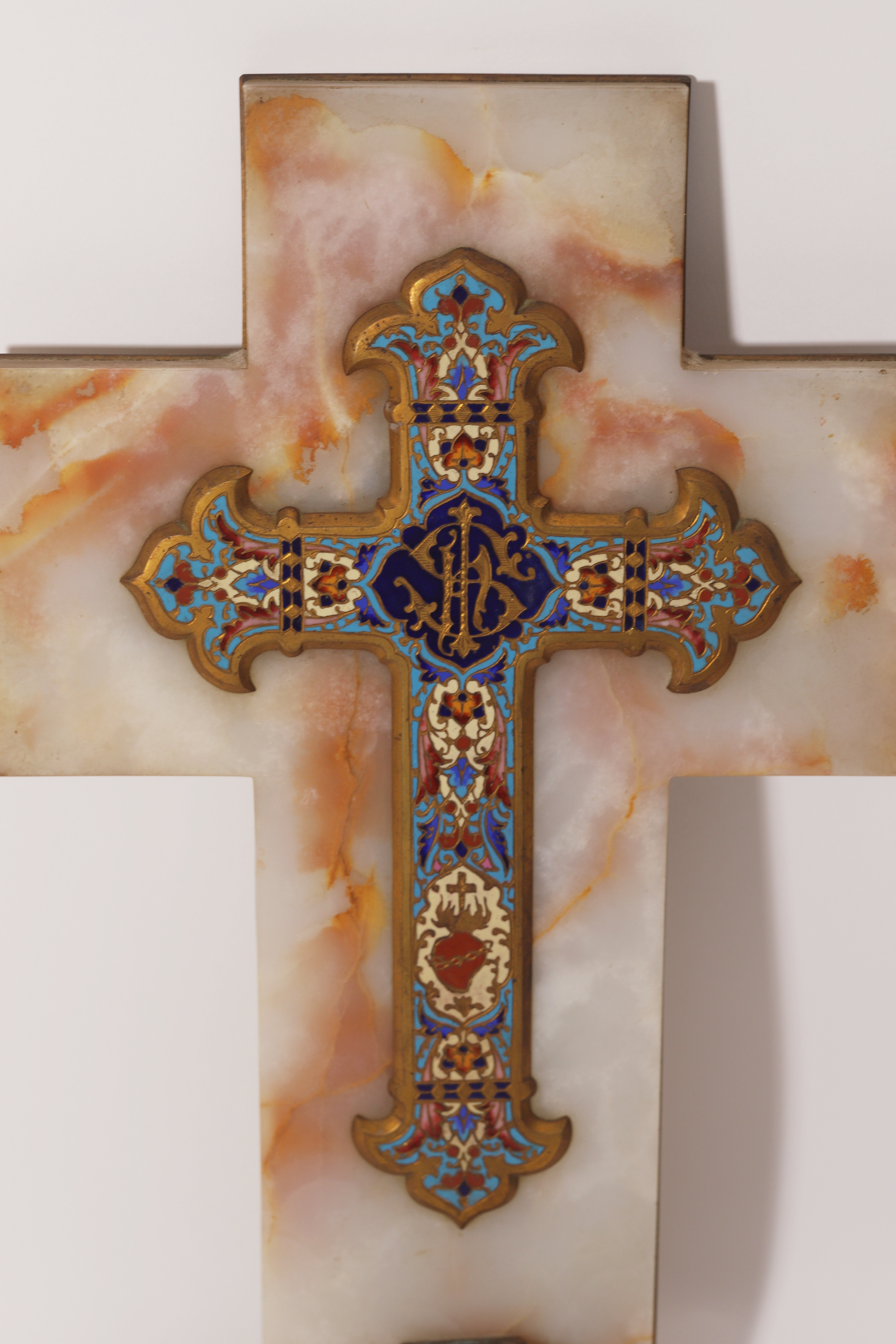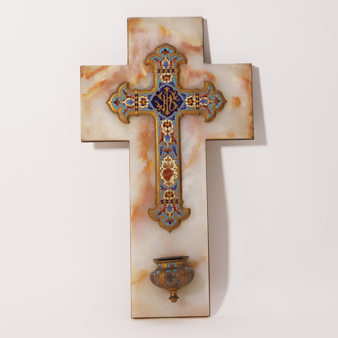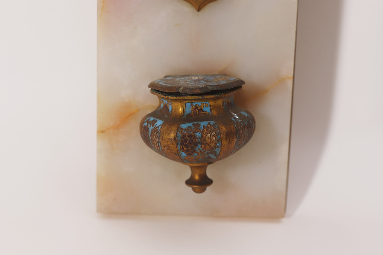 2161595. ANTIGUA BENDITERA DE MÁRMOL Y ESMALTE CHAMPLEVÉ.