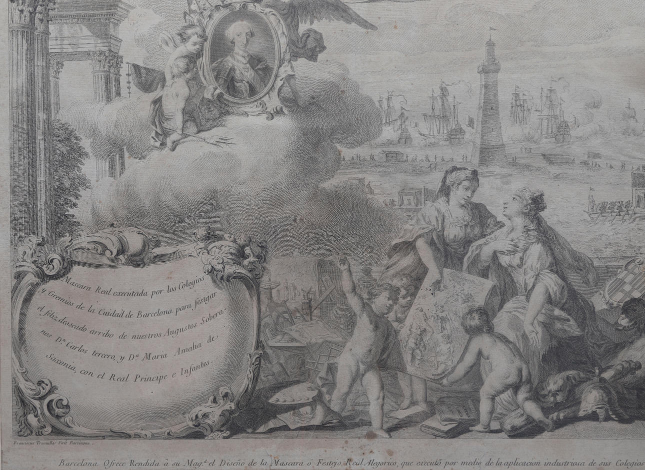 "Barcelona Ofrece Rendida â su Mag.d el Diseño de la Mascara ó Festejo Real Alegorico, que executó por medio de la aplicacion industriosa de sus Colegios y Gremios."