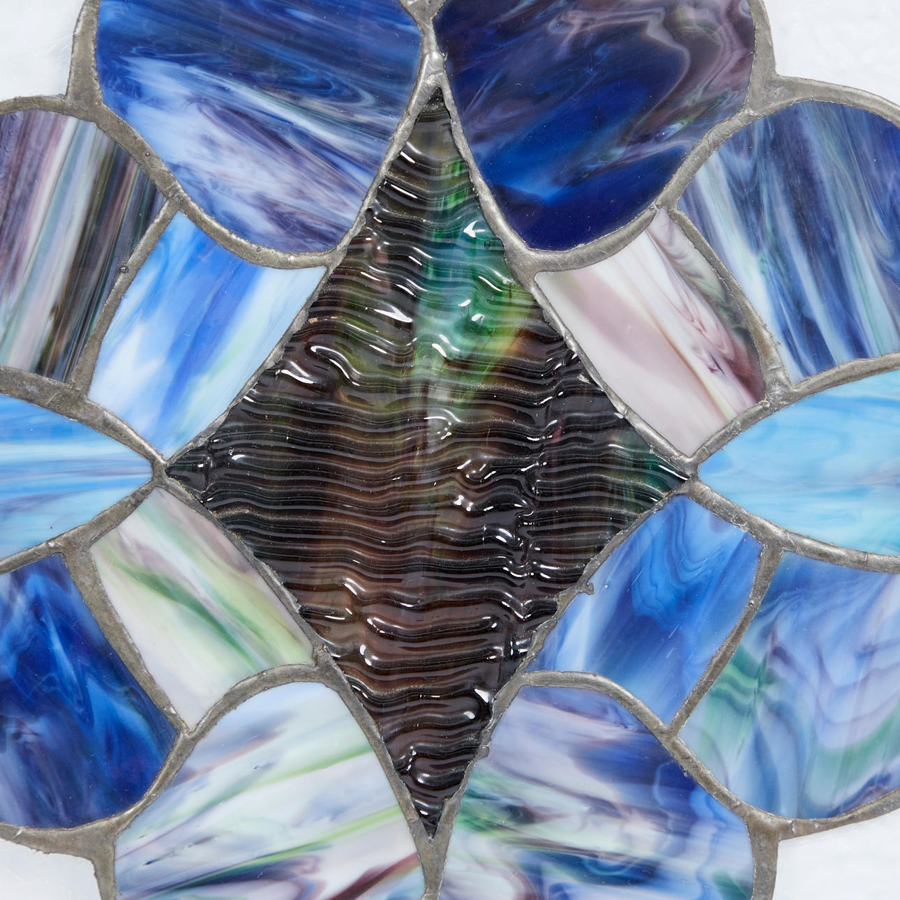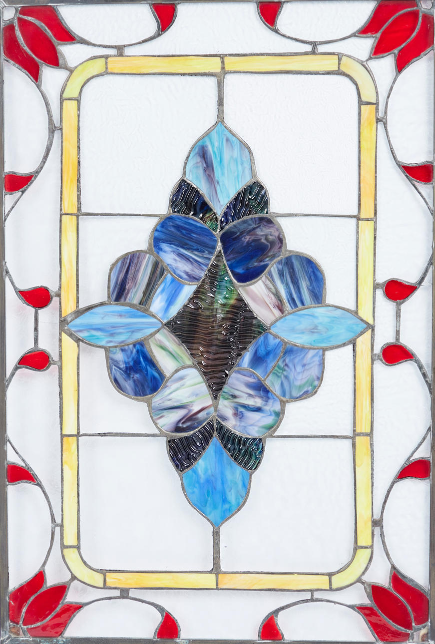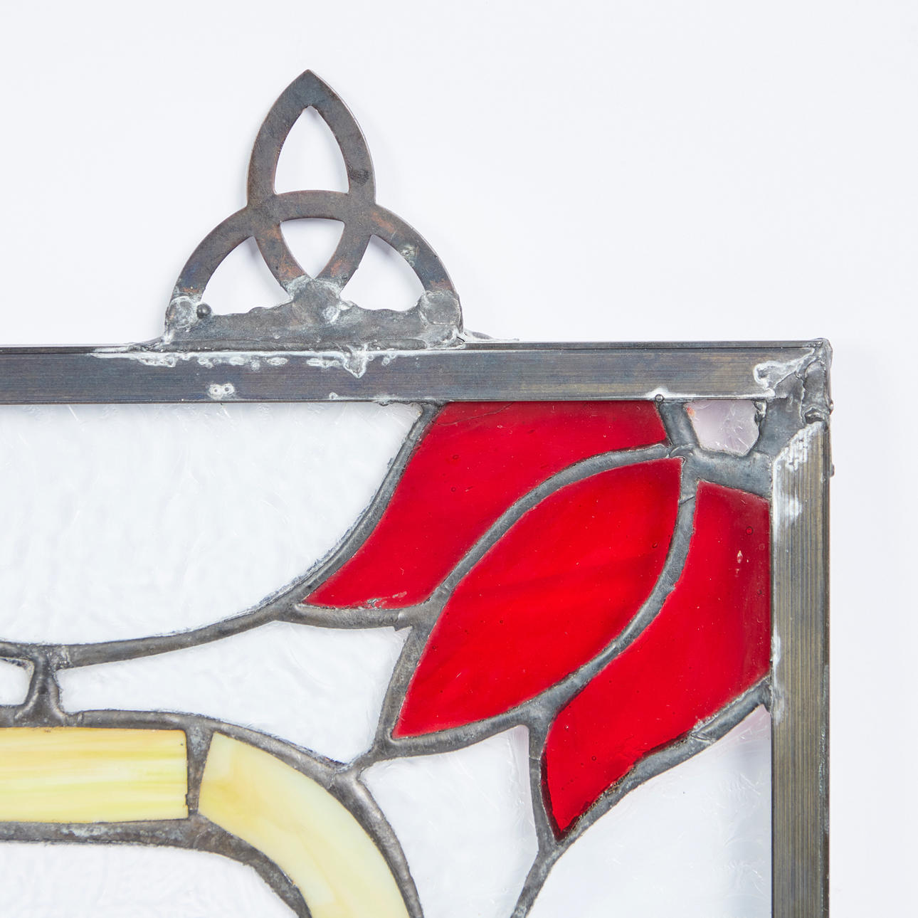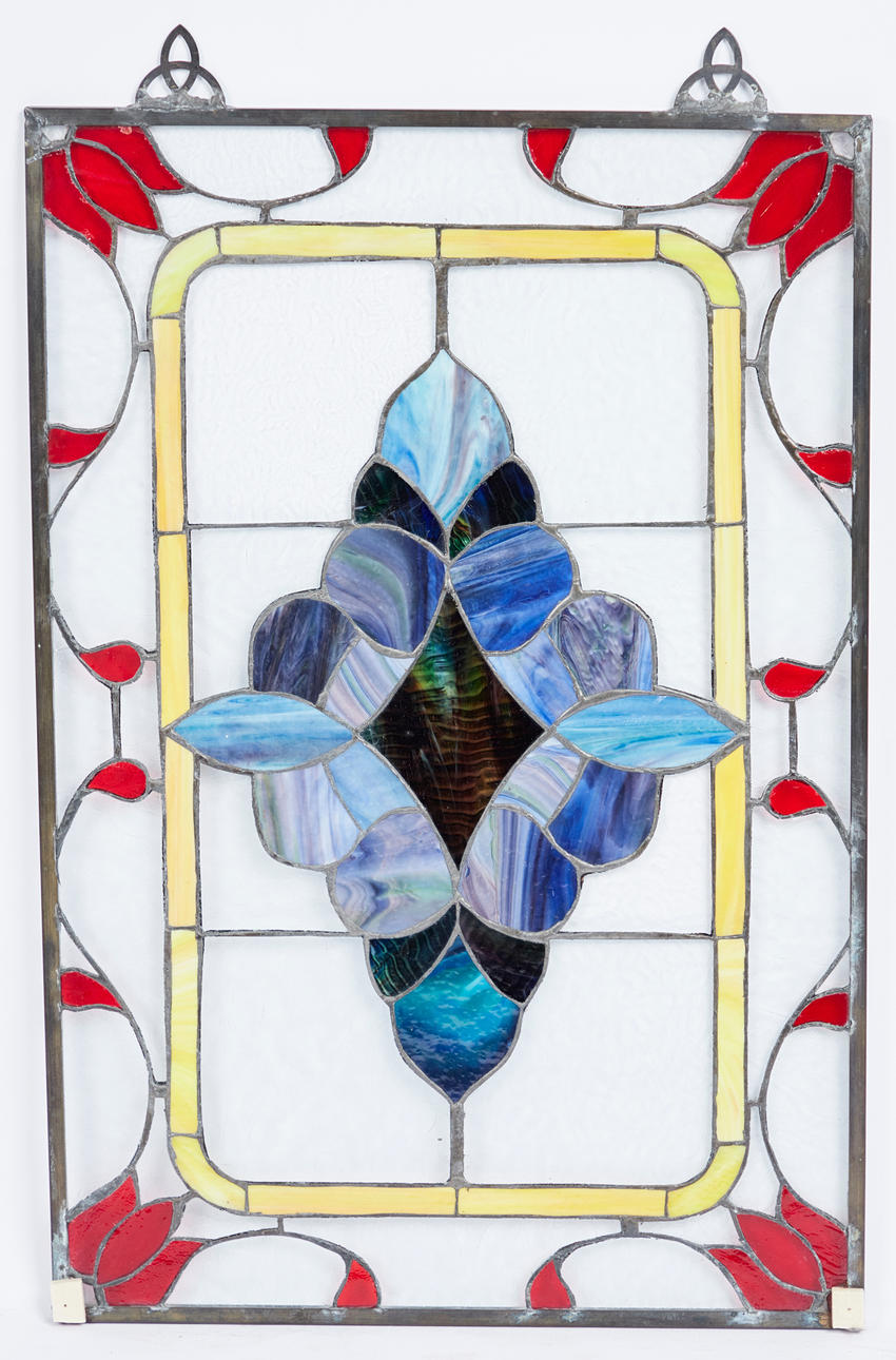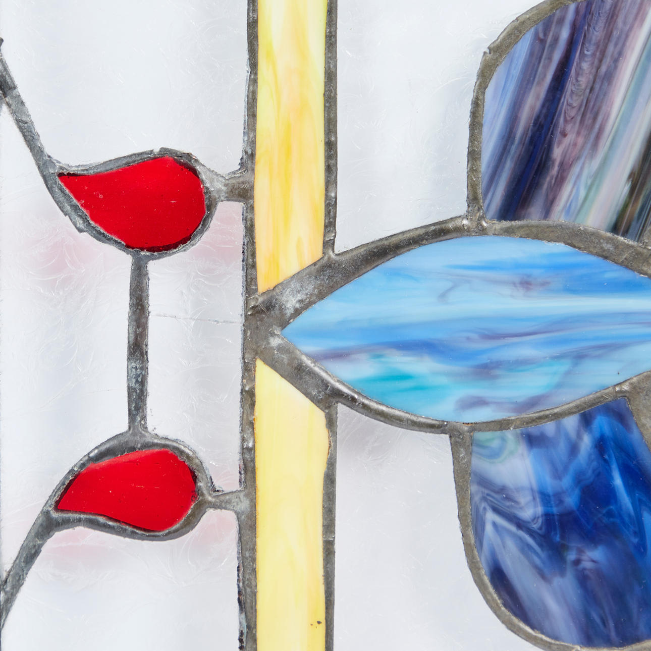 Vidrieras Art Deco / vidrieras, vidrio, plomo. Vitral rectangular con cristales en rojo, azul y amarillo con motivo floral, engastado en varillas de plomo, con dispositivo de suspensión en la parte superior, 70x46cm.
