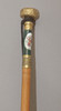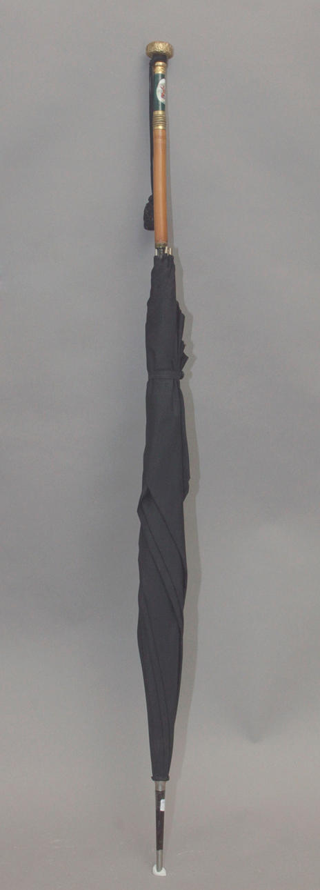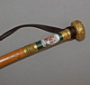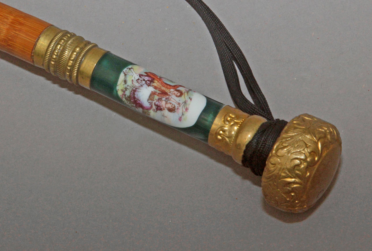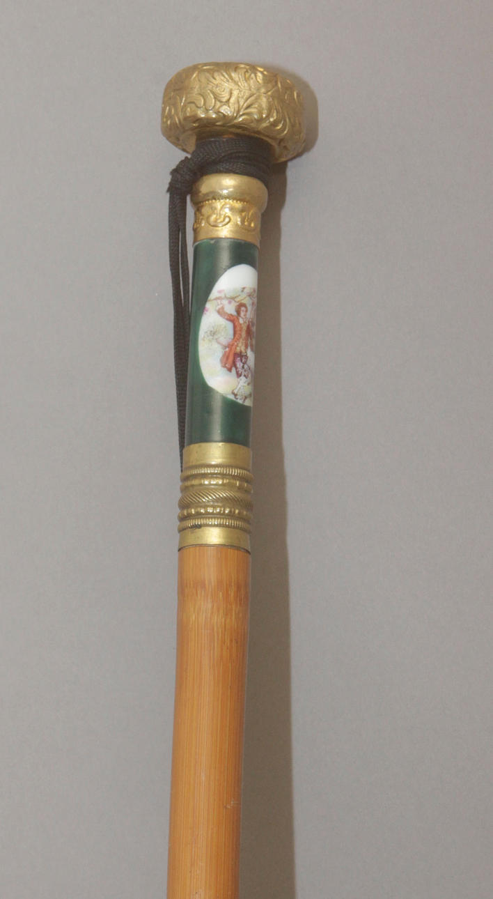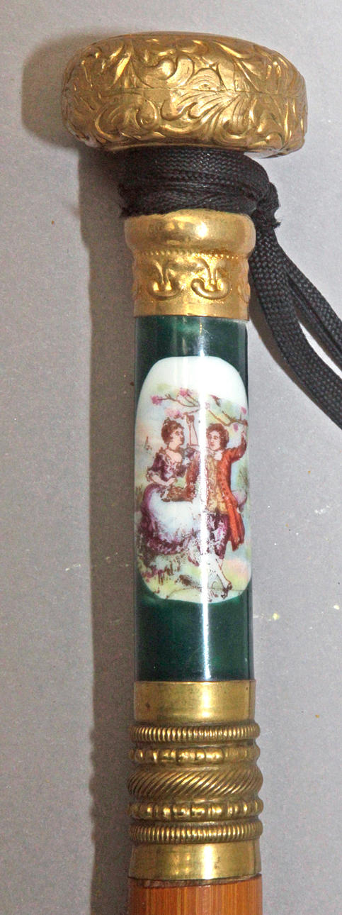 Caña en madera de frutal con detalles en porcelana verde con medallón representando escena galante. Transformado en paraguas con gabardina en seda negra de época posterior , 90,50 cm. long.