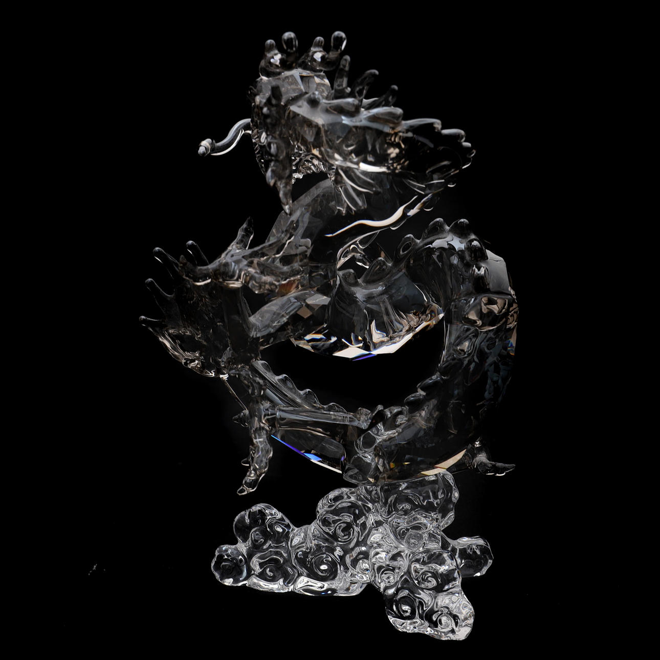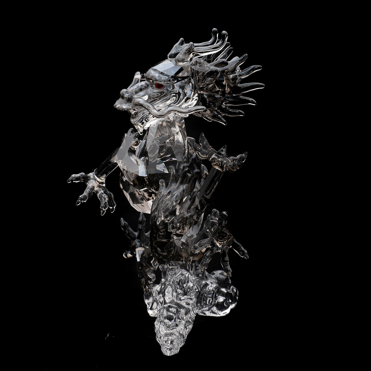 número 1096752, el dragón en cristal satinado facetado, con ojos rojos, sentado sobre una base de cristal transparente de agua arremolinada, 12 cm de alto, con certificado, en caja original y cubierta exterior, edición anual en 2012 solo para miembros de SCS.