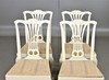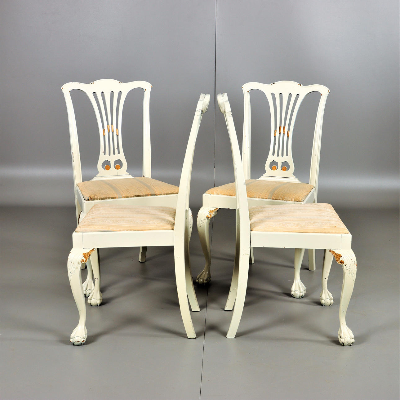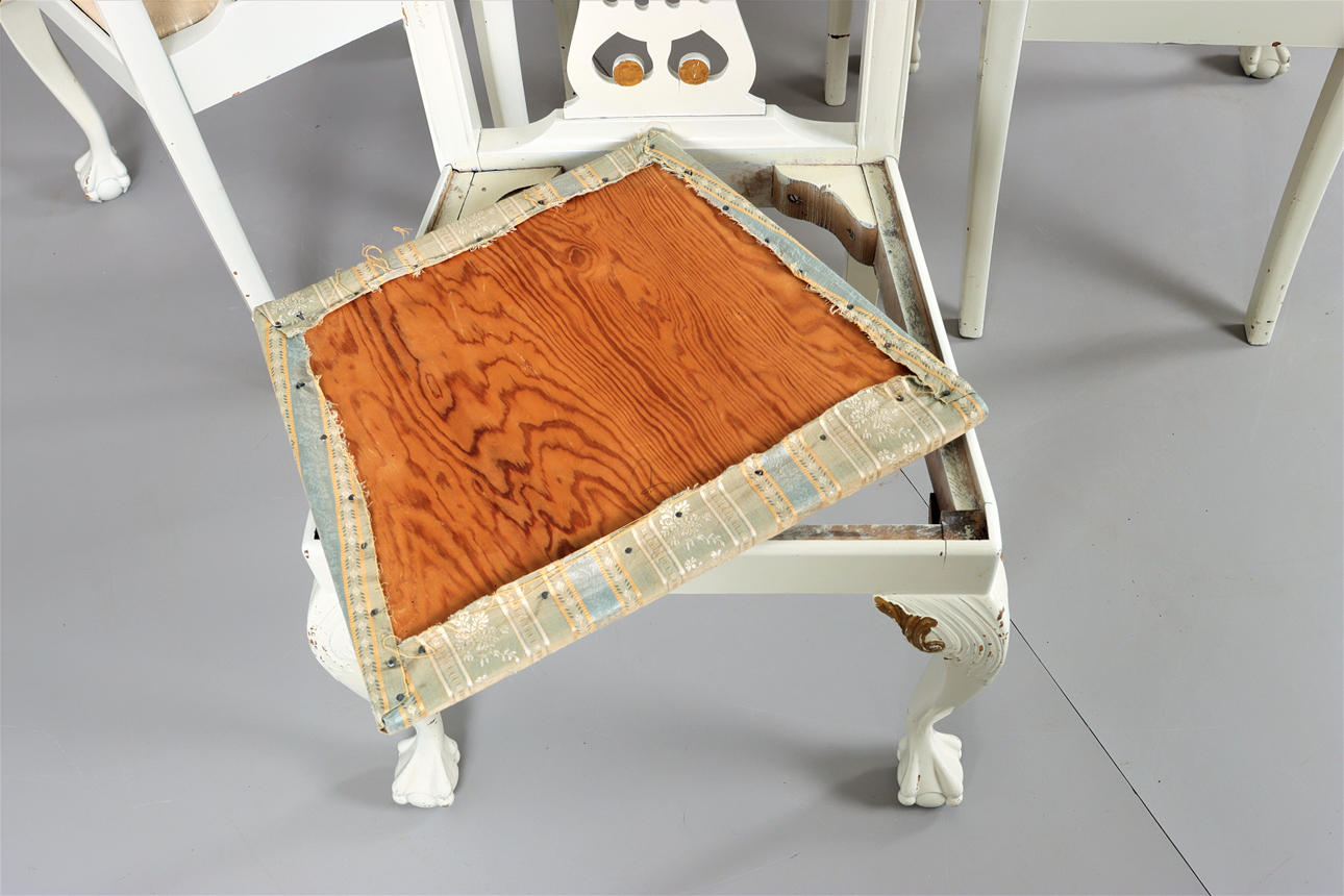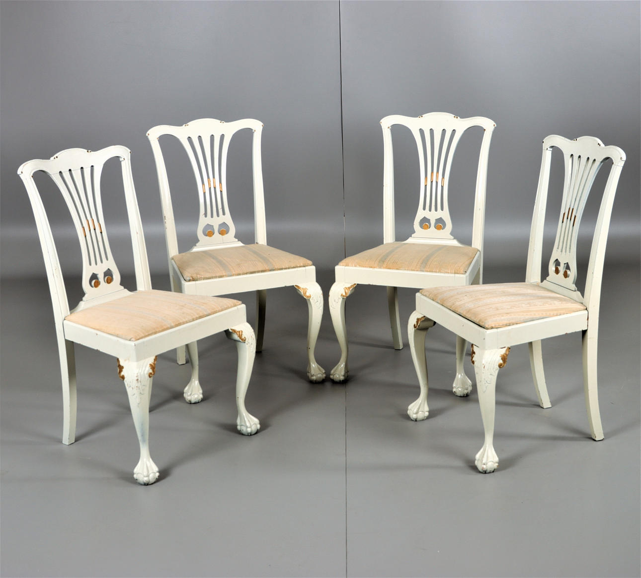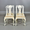 4 sillas, detalles cortados, piecero con garra y bola. Asiento suelto. Años 20 Altura 95 cm Altura del asiento 45 cm Ancho aproximado 54 cm.