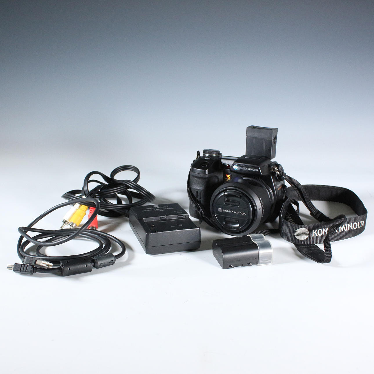 Konica Minolta Dimage A2 con accesorios.