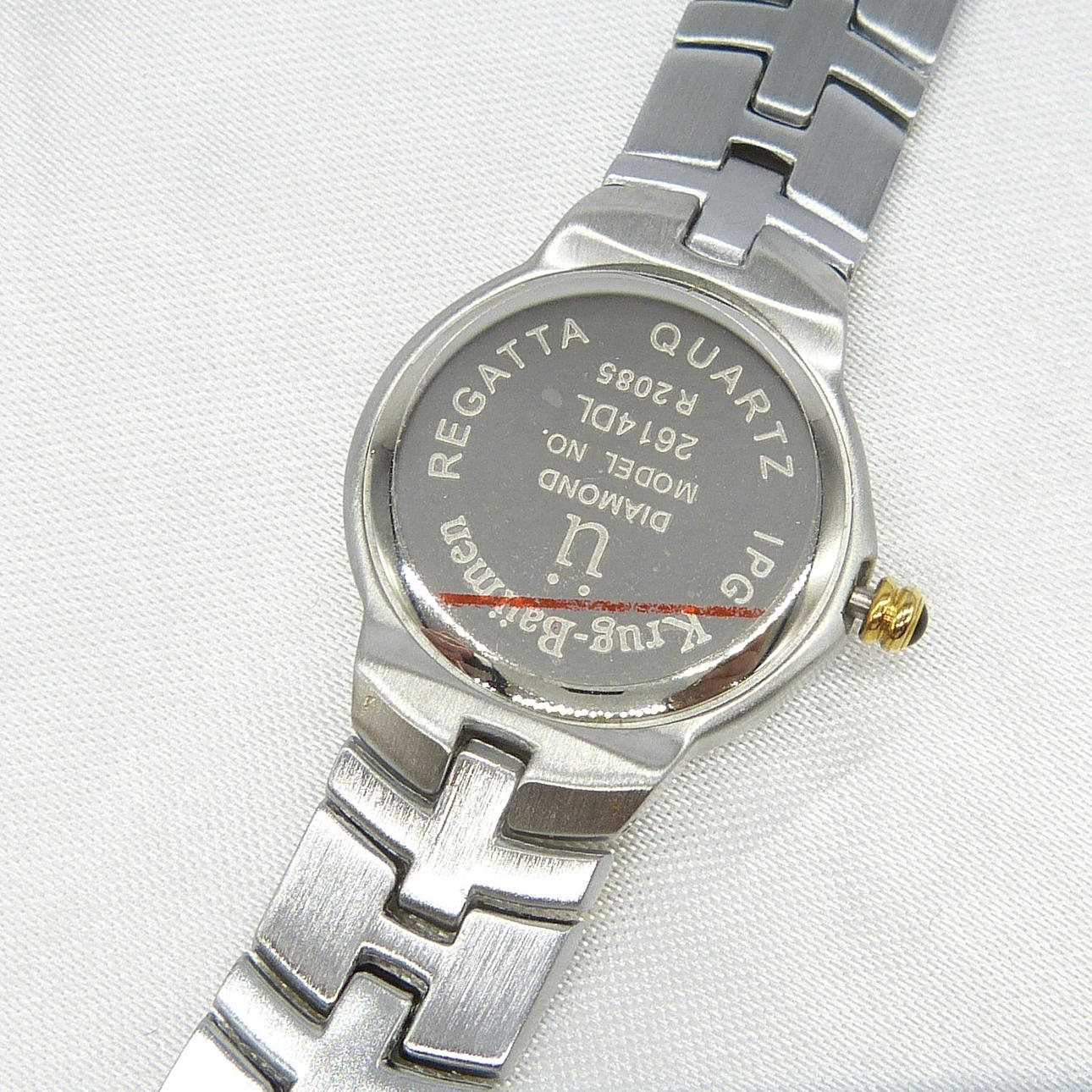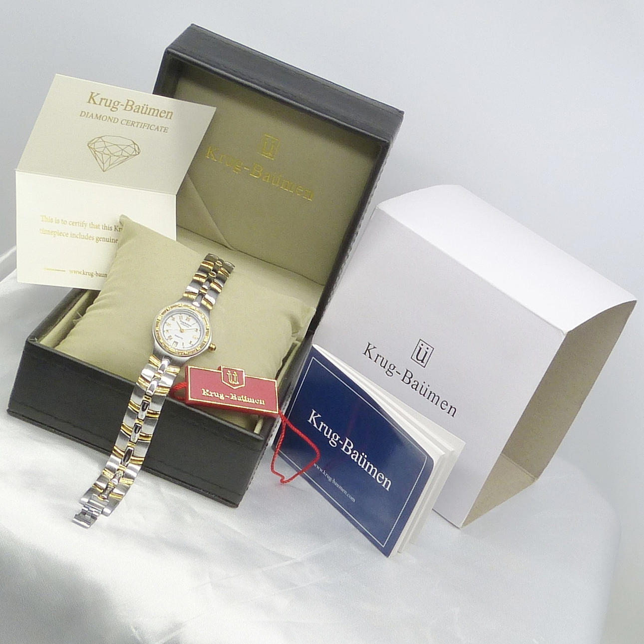 Un reloj de pulsera Krug Baümen para mujer con DIAMANTE Regatta IPG chapado en oro con movimiento de cuarzo • Movimiento: cronógrafo de cuarzo japonés, con ventana de fecha • Diamantes: naturales; 4 x corte redondo, engastados en la cara • Modelo: 2614DL-4D • Esfera: blanca con números romanos. 3 manecillas en forma de espada • Vidrio: cristal mineral • Diámetro de la caja: 24 mm • Hermeticidad: 3 ATM (30 metros) • Material: Caja de acero inoxidable con brazalete de metal (correa) chapado en oro IPG • Longitud del brazalete: ajustable • Se entrega con caja de presentación original, documentación y funda Peso del reloj: 63,1 g. Peso de la caja: 235,0 g.
