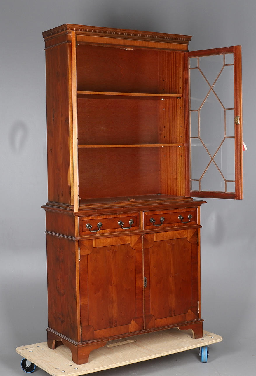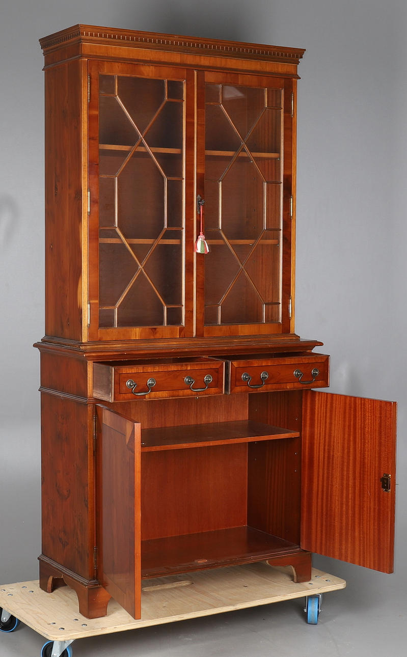 Parte superior acristalada con puertas vidriadas de astrágalo, la parte inferior con dos cajones de friso y dos armarios debajo.