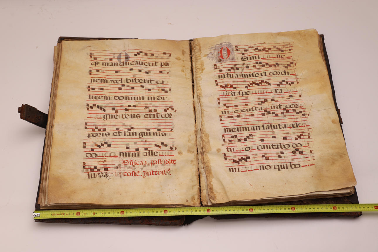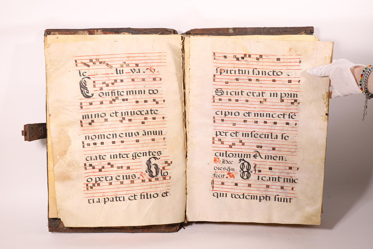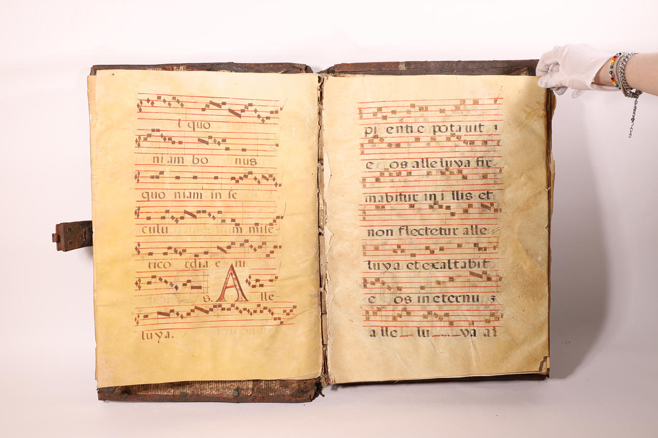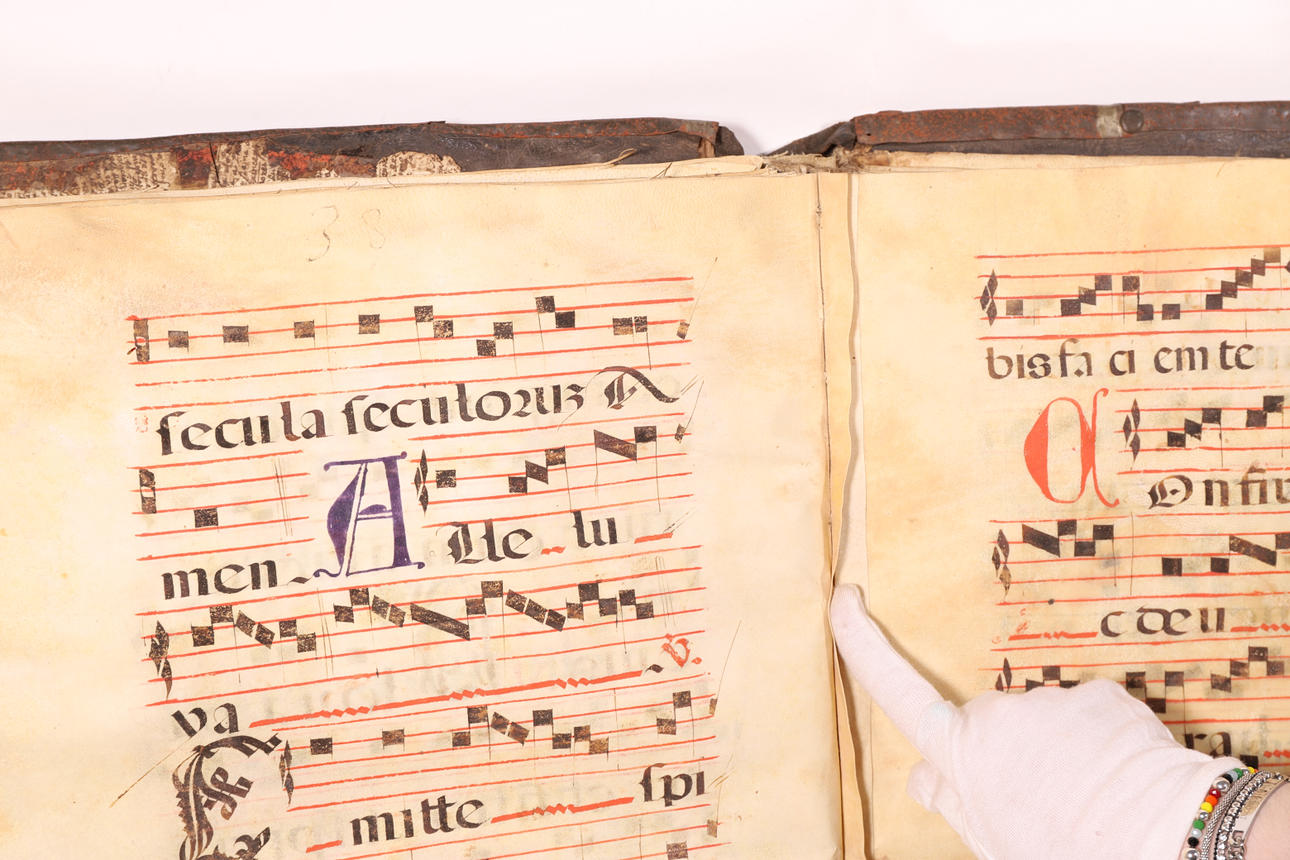 Manuscrito en pergamino, con pentagrama de color rojo y anotaciones musicales en negro. El cuerpo del texto es formal gótica. Cubierta en madera forrada en piel, con cantoneros decorativos en las esquinas y aplicaciones en latón.