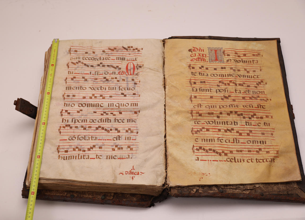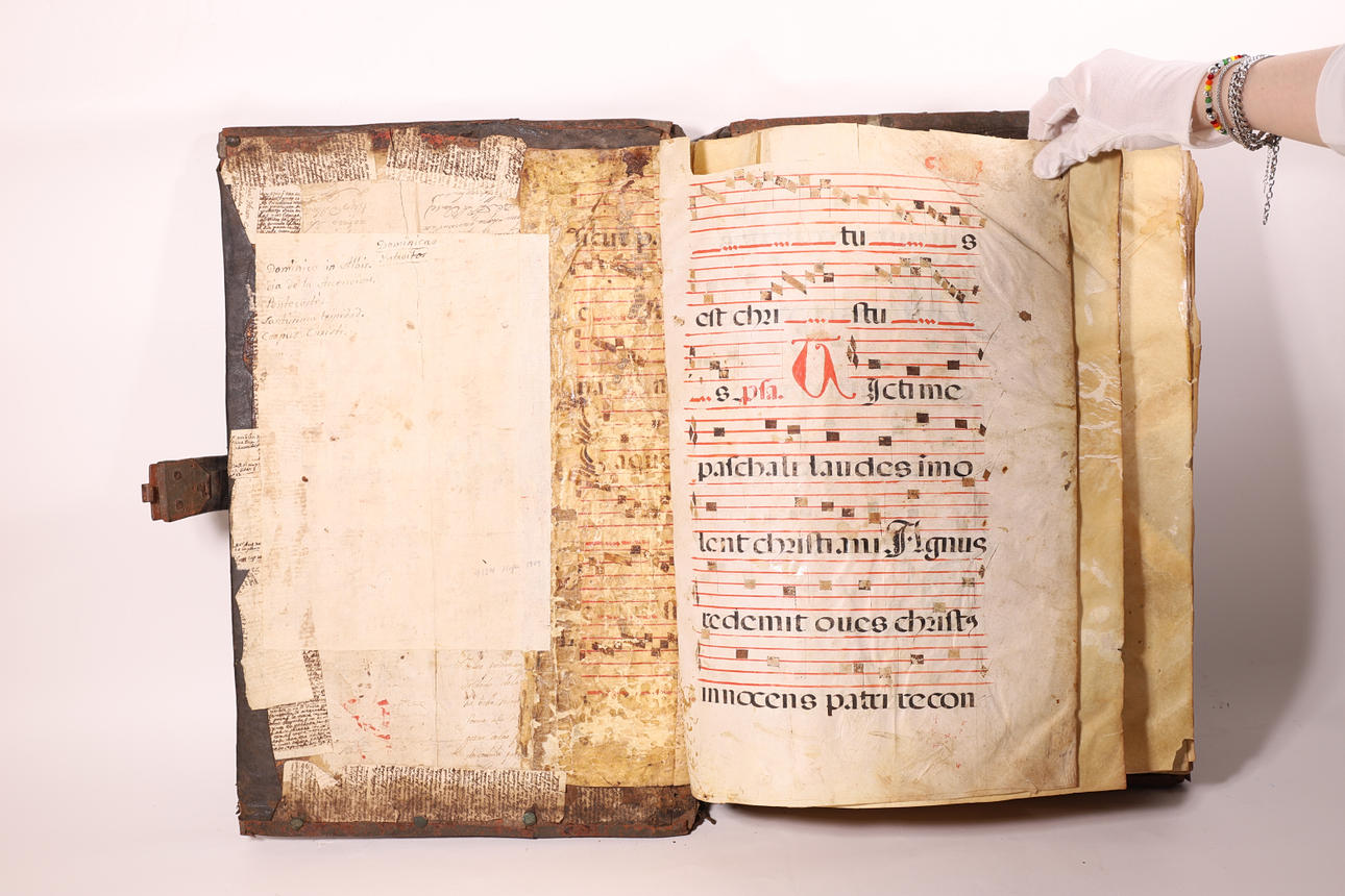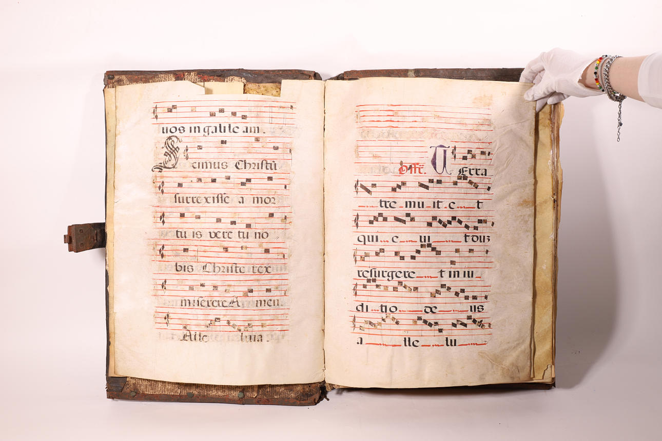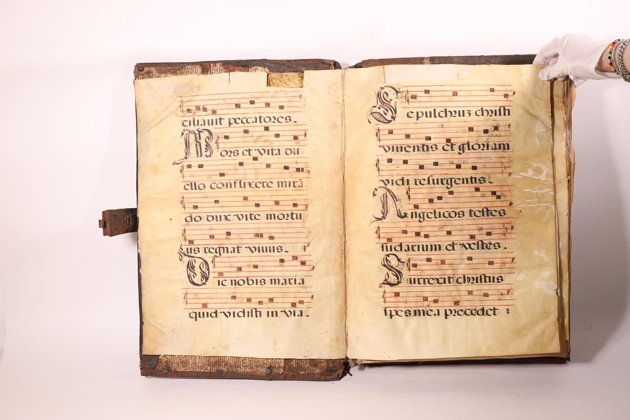 Manuscrito en pergamino, con pentagrama de color rojo y anotaciones musicales en negro. El cuerpo del texto es formal gótica. Cubierta en madera forrada en piel, con cantoneros decorativos en las esquinas y aplicaciones en latón.