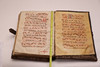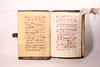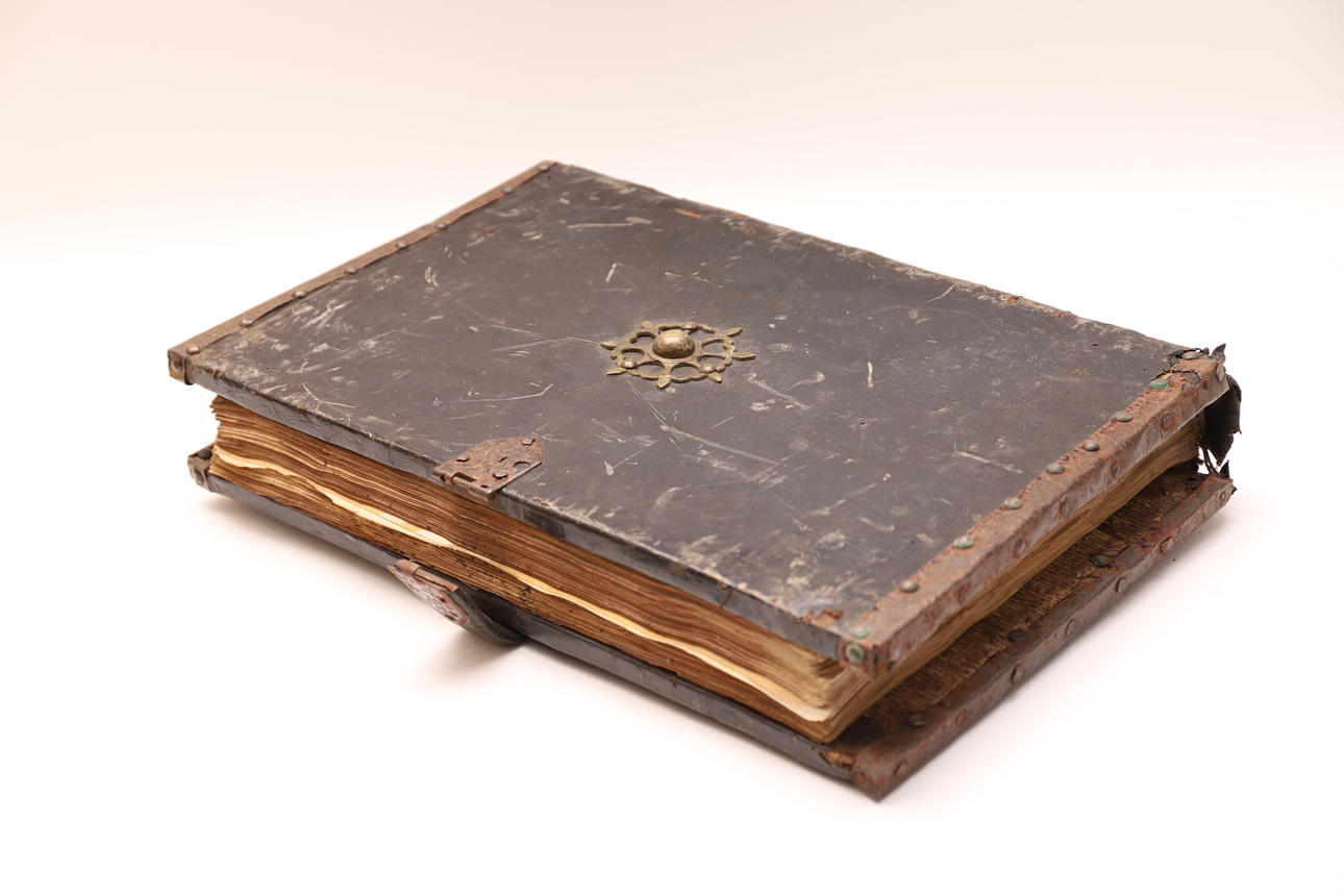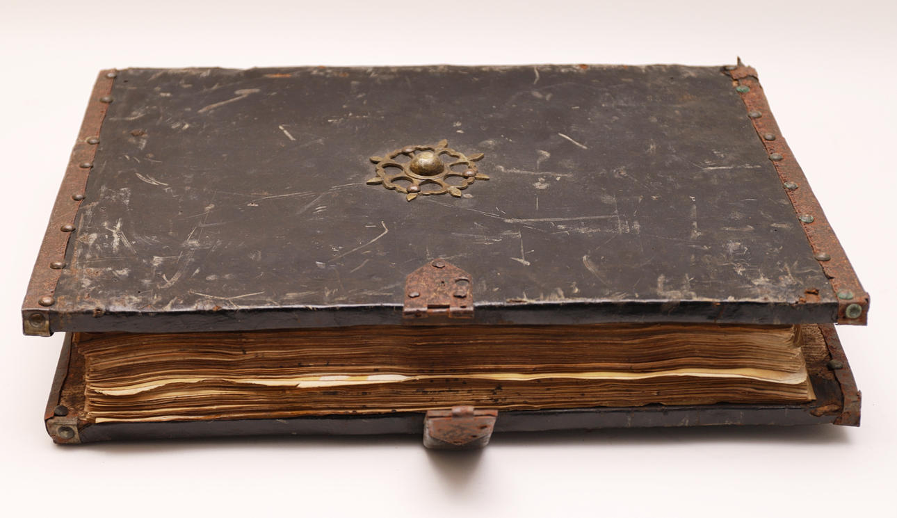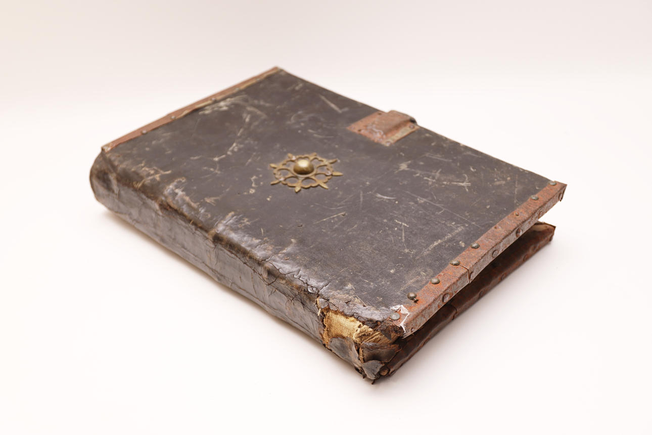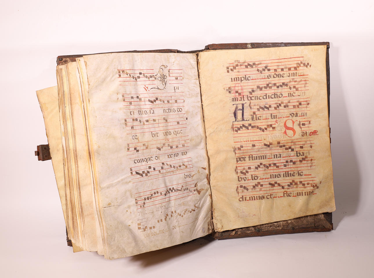 Manuscrito en pergamino, con pentagrama de color rojo y anotaciones musicales en negro. El cuerpo del texto es formal gótica. Cubierta en madera forrada en piel, con cantoneros decorativos en las esquinas y aplicaciones en latón.