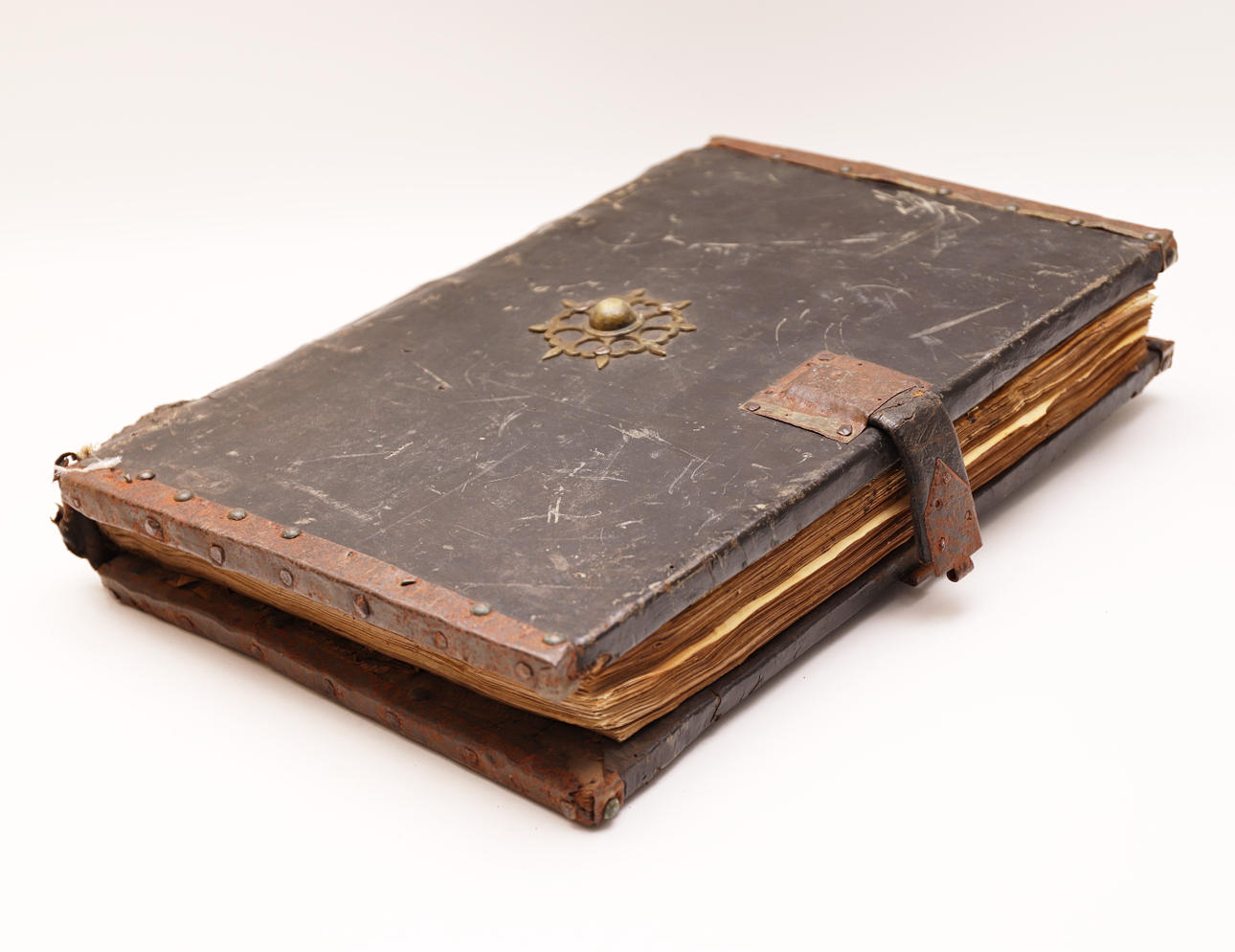 Desperfectos y faltas. Se aprecian pérdidas en los cantoneros decorativos, piel de la cubierta con múltiples rascadas, lomo con desperfectos y faltas. Algunas hojas están dobladas, con roturas y faltas. Manchas de humedad.