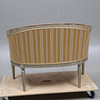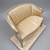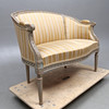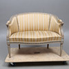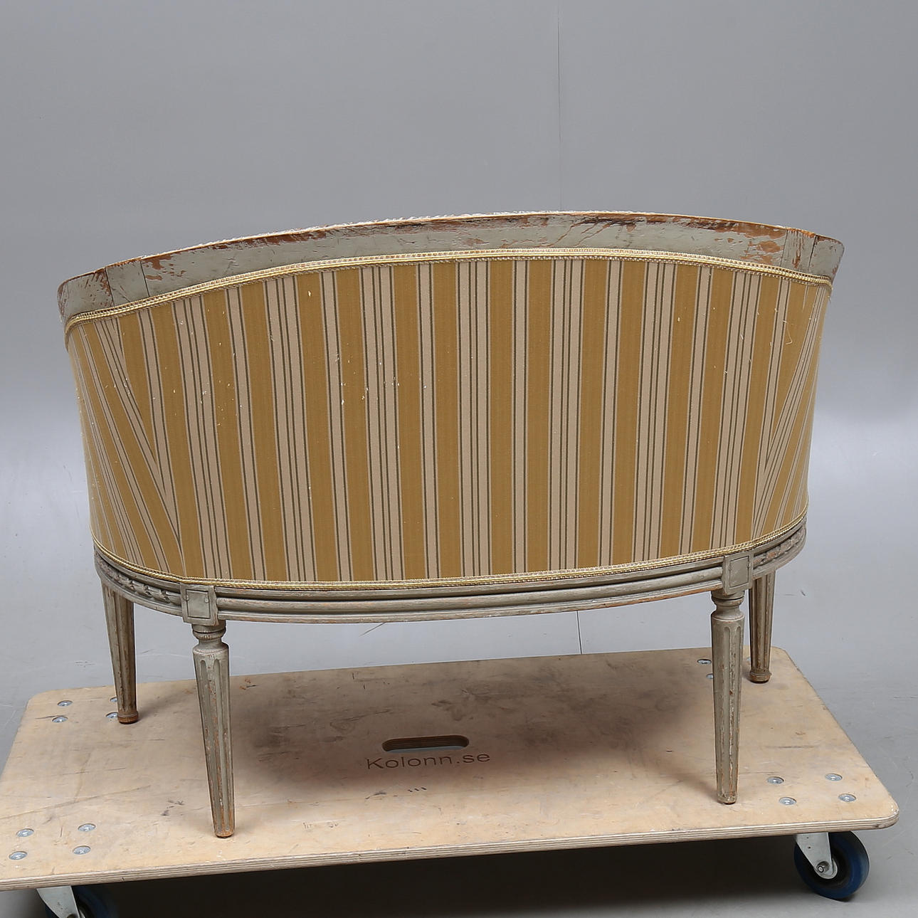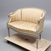 Decoración pintada, cortada de varilla de perla y decoración de hojas. Patas acanaladas, florones. Tapicería sólida y acolchada. Longitud 101 cm, altura del asiento 42 cm.