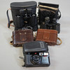 Zoom Pentax 70-X. Cámara con bolsa, Zeiss Ikon Nettar, 1900. Agfa Isolette II. Terra Marine en bolsa. Grodenstock Múnich.