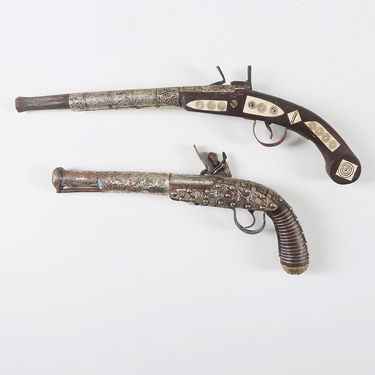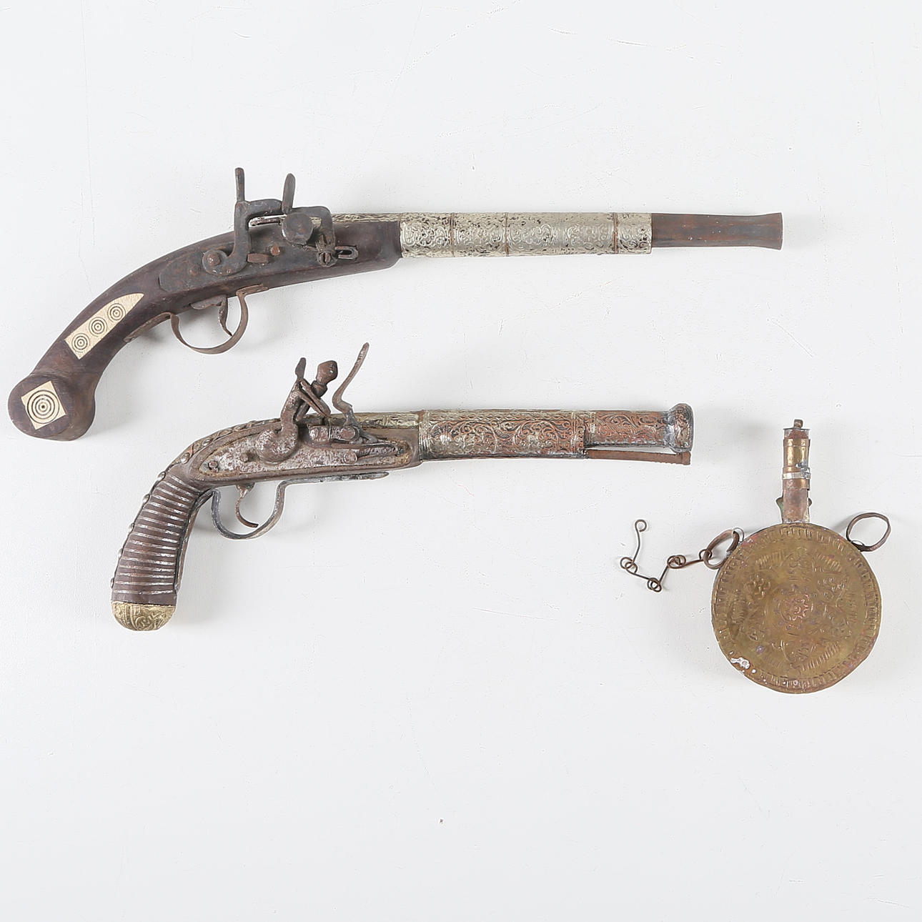 2242262. 2 RÉPLICAS DE PISTOLAS y BOTELLA DE POLVO, 1900.