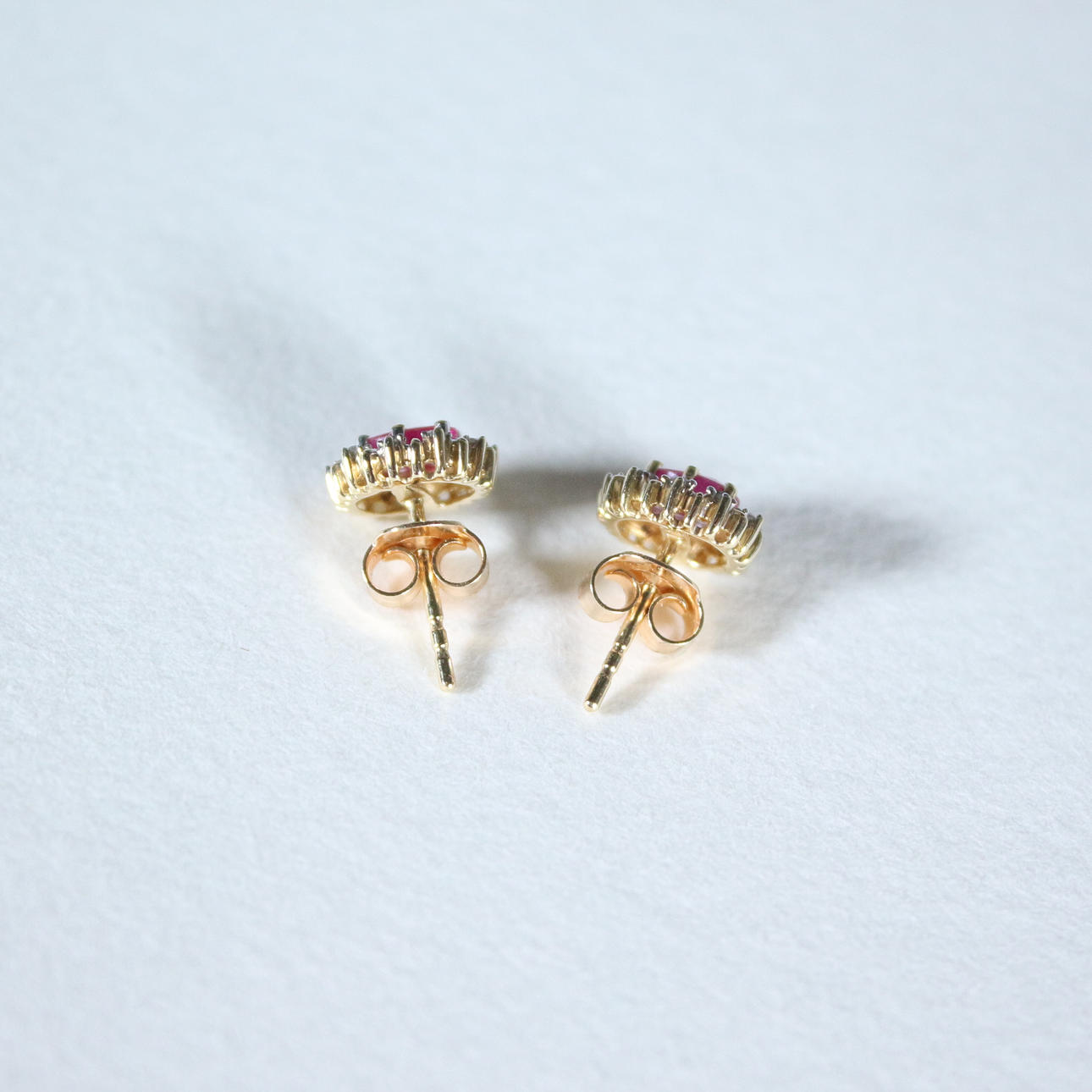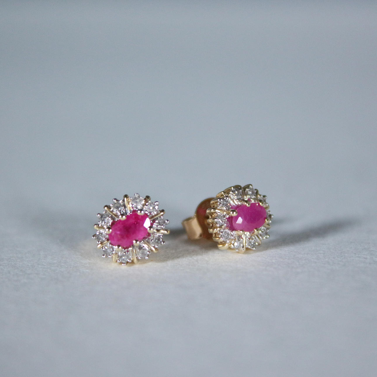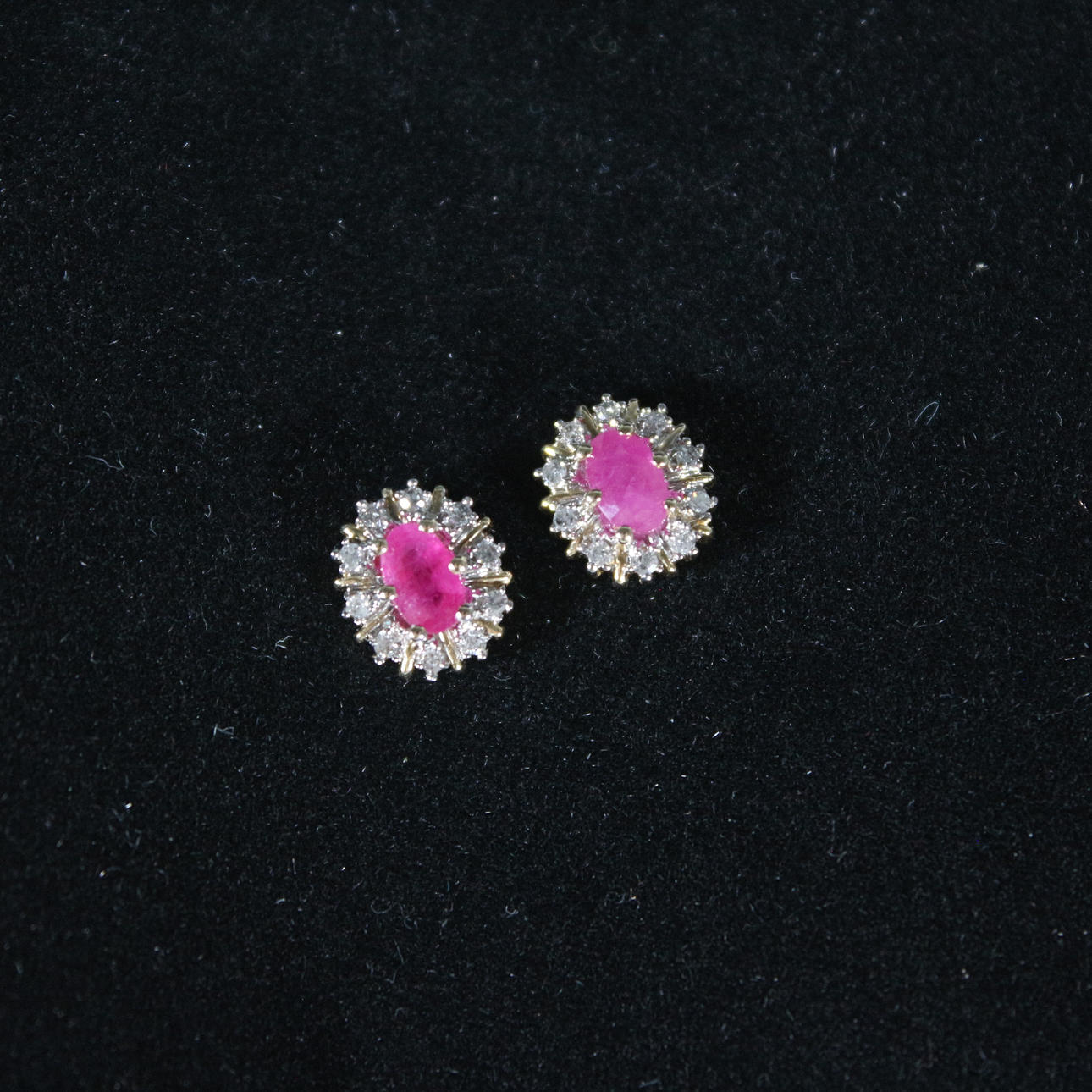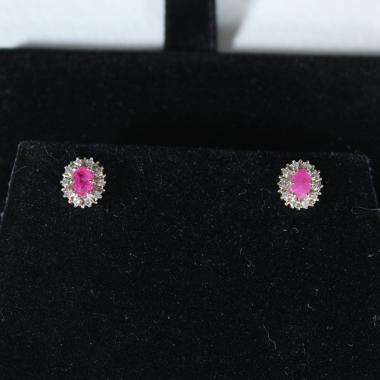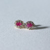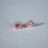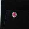 Pendientes de botón con rubí rodeado de diamantes, oro 585, dimensiones (totales) aprox.: 9x6,5 mm; Dimensiones de los rubíes aprox.: 5,5x3,5cm.