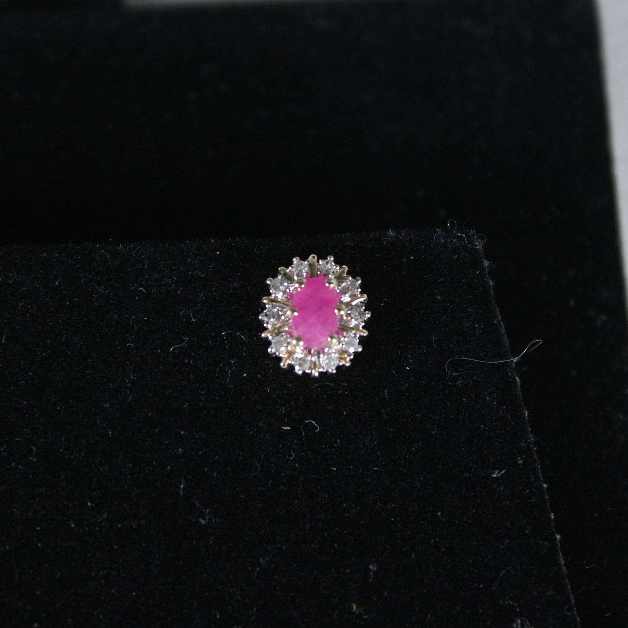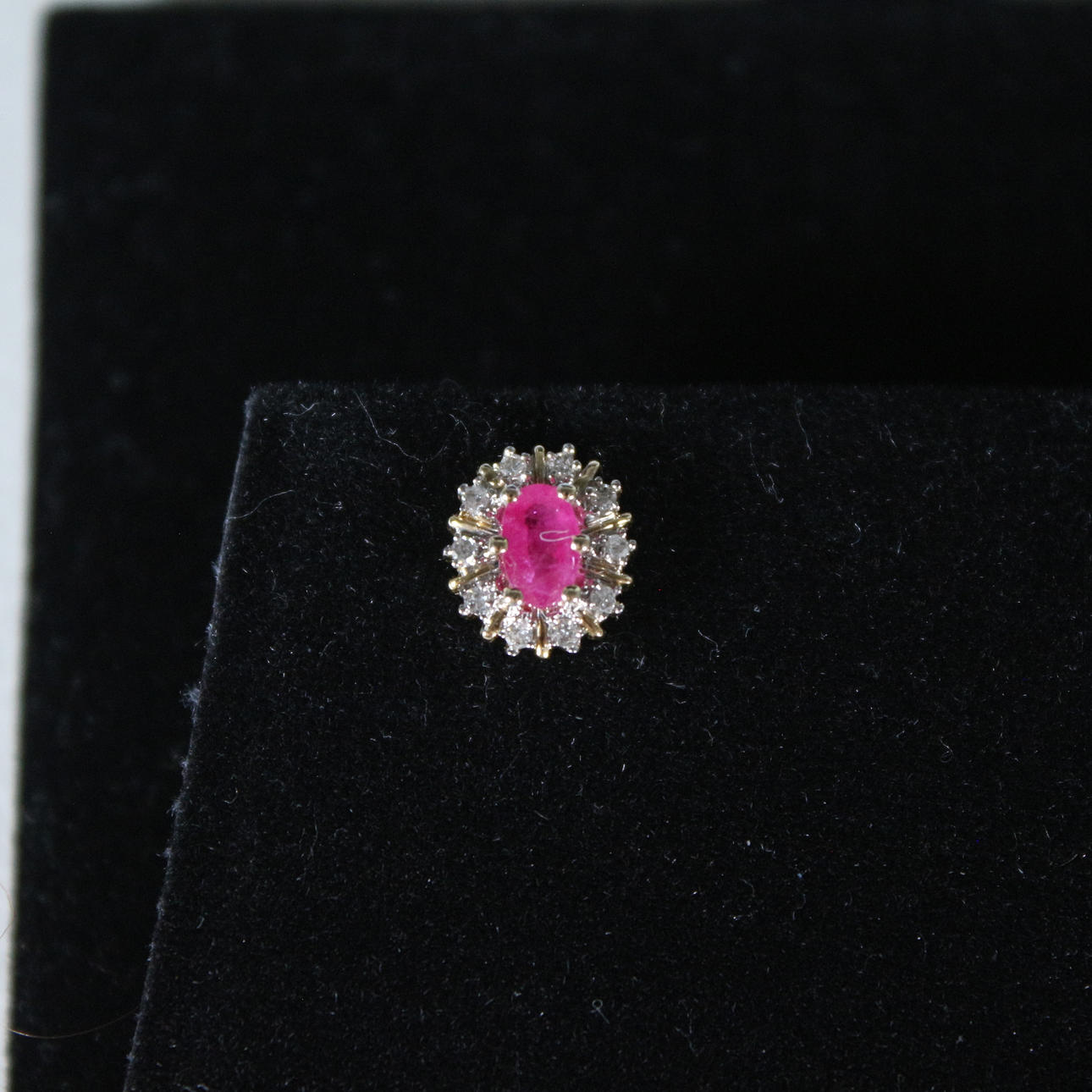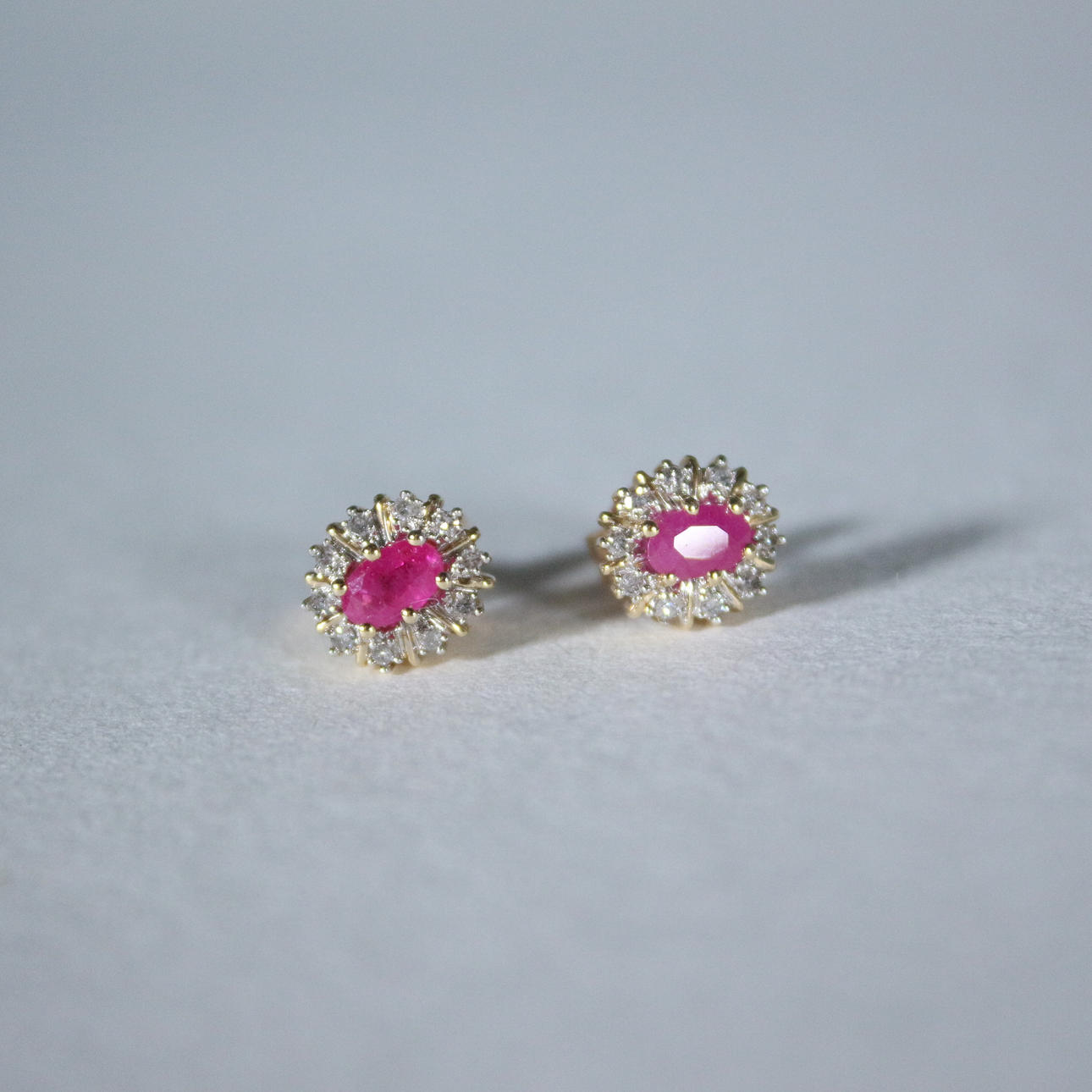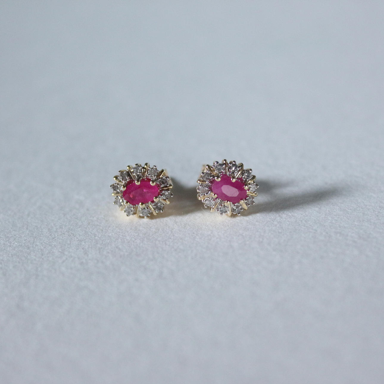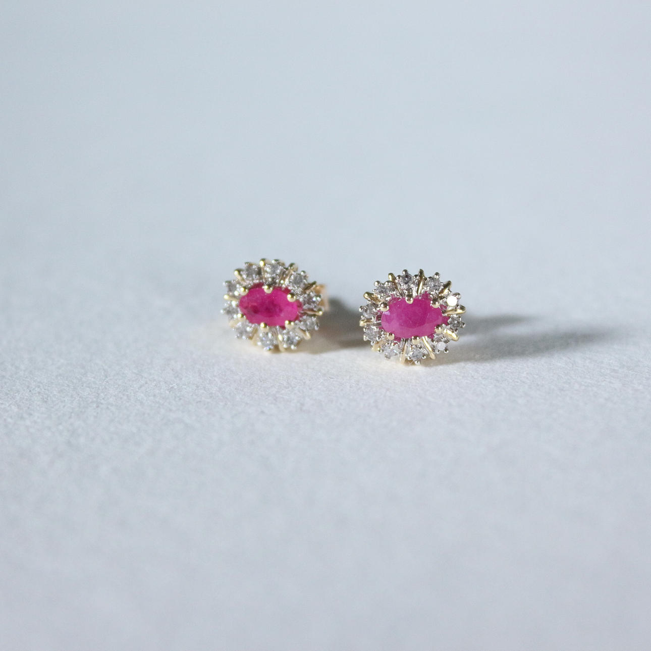 Pendientes de botón con rubí rodeado de diamantes, oro 585, dimensiones (totales) aprox.: 9x6,5 mm; Dimensiones de los rubíes aprox.: 5,5x3,5cm.