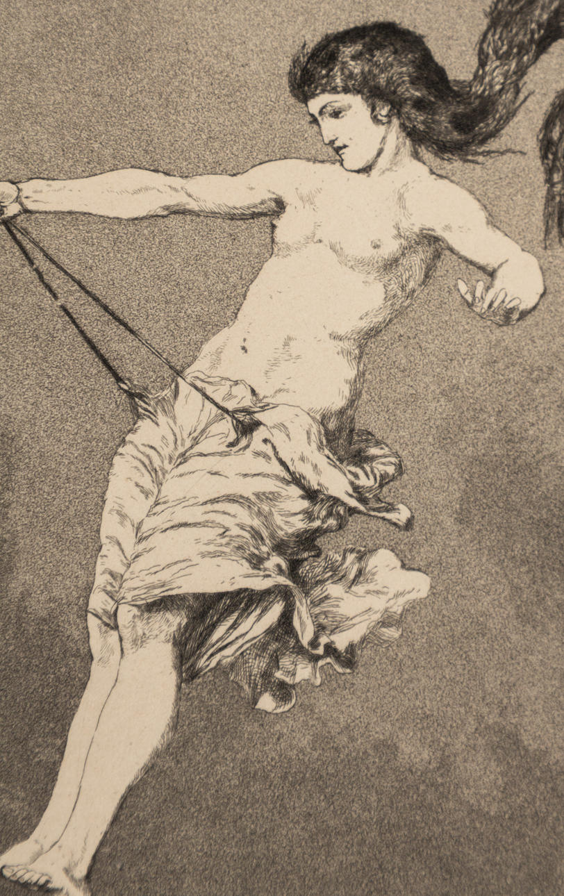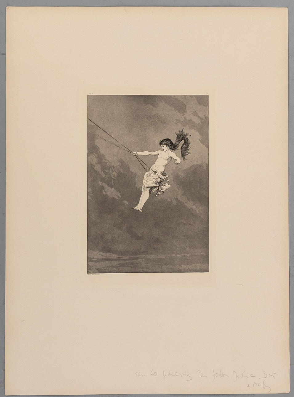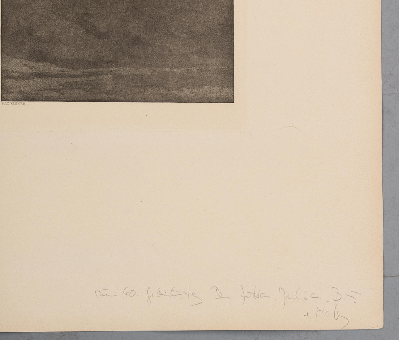Max Klinger (1857-1920), Primer Intermezzo, aguafuerte aguatinta sobre papel cobre, del ciclo "Rettung Ovidischer Opfer" (Opus II, Folio 6), con la firma grabada abajo a la izquierda y las notas grabadas "OP. II." y la numeración "VI." arriba de la imagen, en el margen inferior con dedicatoria del anterior propietario, aprox. 28 x 19 cm, tamaño de hoja aprox. 60x44cm.