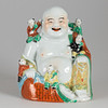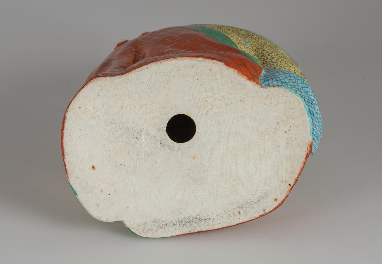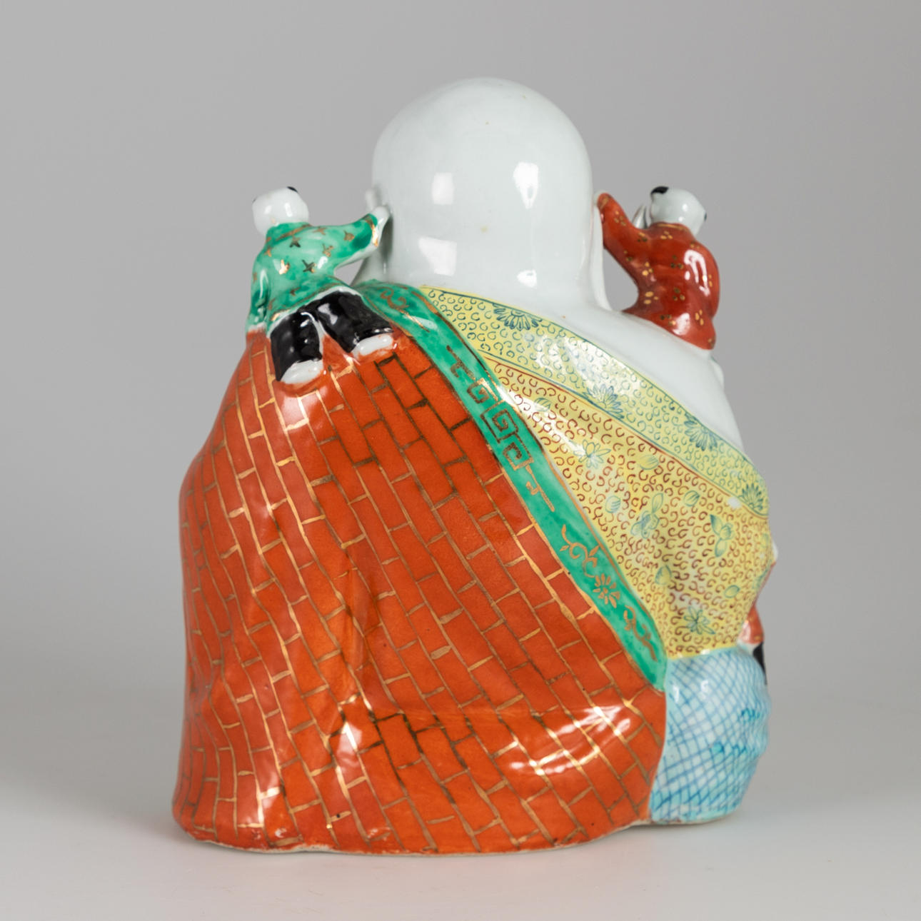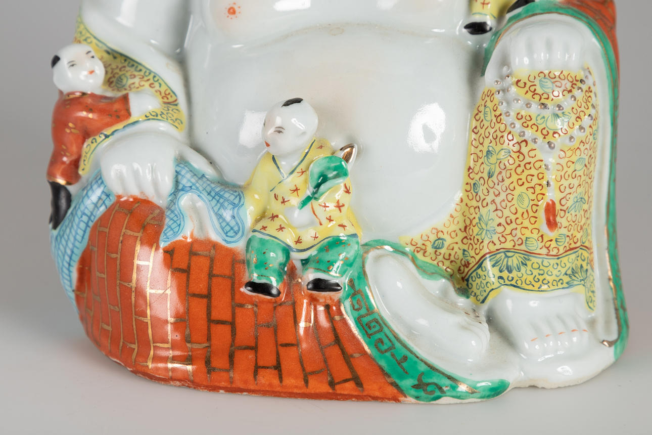Buda sentado con 5 niños. Gres con pintura de esmalte policromado. Marca de carácter: 剑邑蔡昌泰造. Al x An x Pr: 21x16x11 cm.