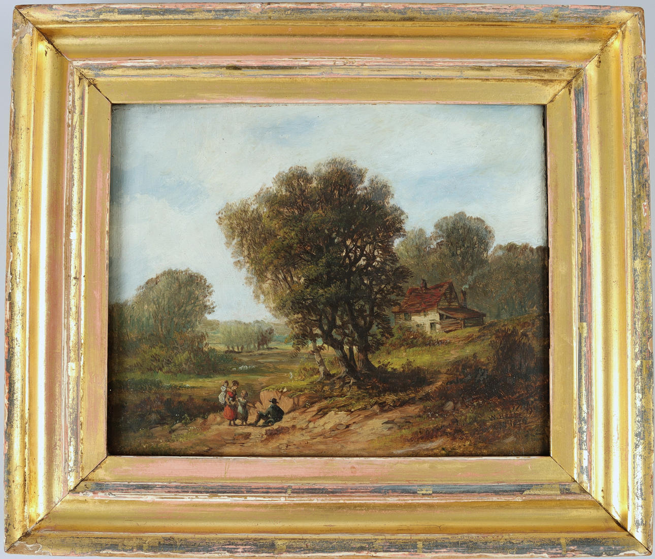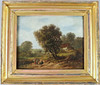 Óleo sobre roble, motivo forestal con escena de figuras. Firma a la derecha, indistinta.