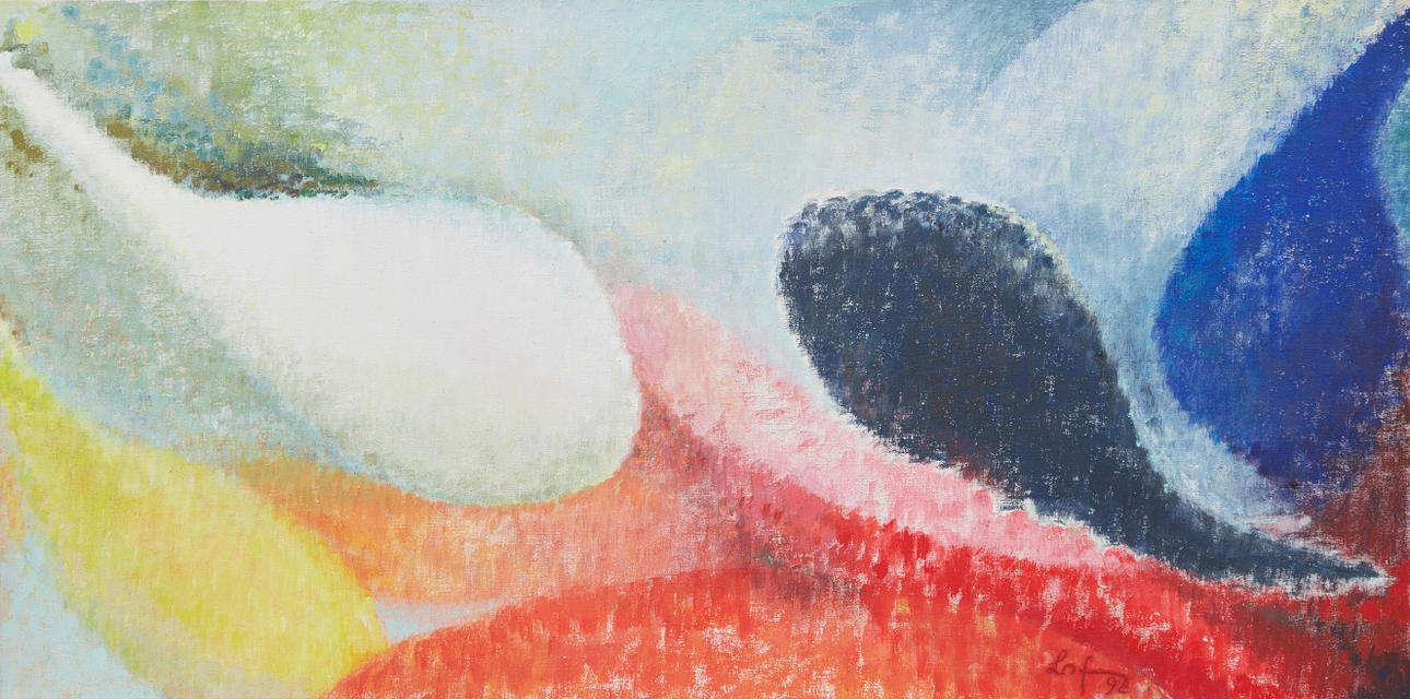 Brigitte von Fischer (1925-2022), Pinturas, gotas, 1992, óleo sobre lienzo. Representación de gotas abstractas y policromadas, firmada y fechada abajo a la derecha, 100x200cm.