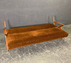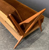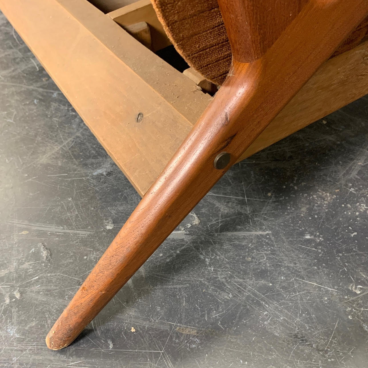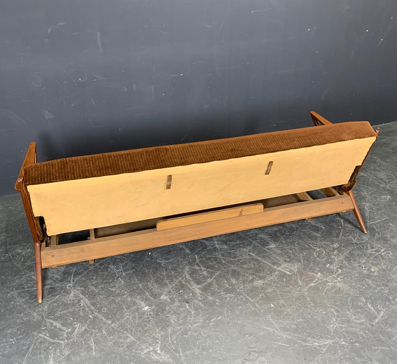 Estructura en madera de teca y haya, tapizada en pana marrón oscuro.