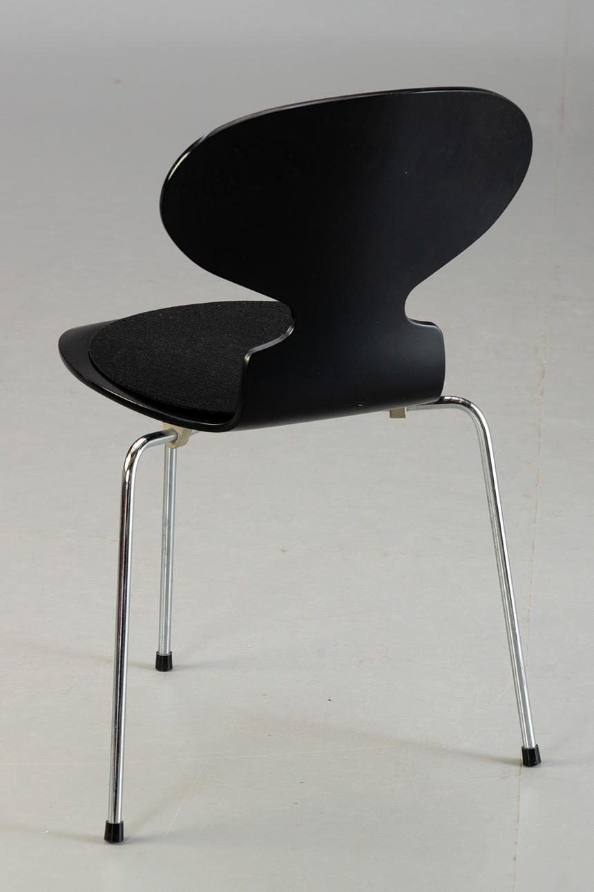 3 sillas 'Ant' diseñadas por Arne Jacobsen para Fritz Hansen. Borrador: 1952. Carcasa del asiento realizada en madera moldurada, pintada de negro. Base de acero tubular cromado. Cojines de asiento de fieltro negro extraíbles.