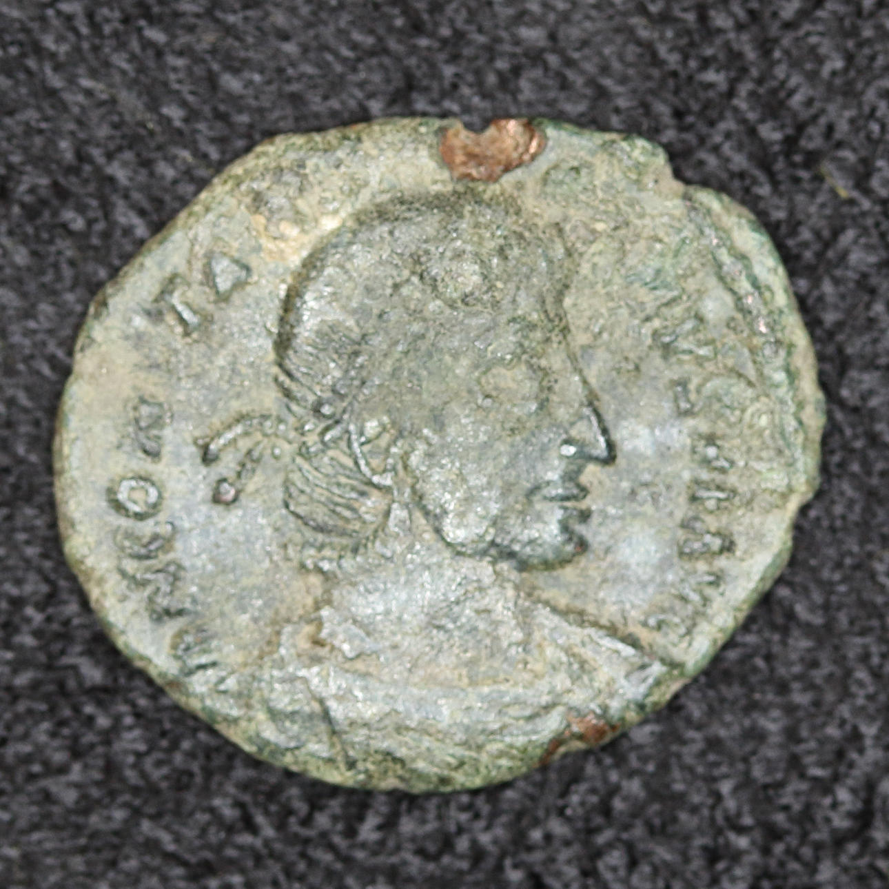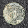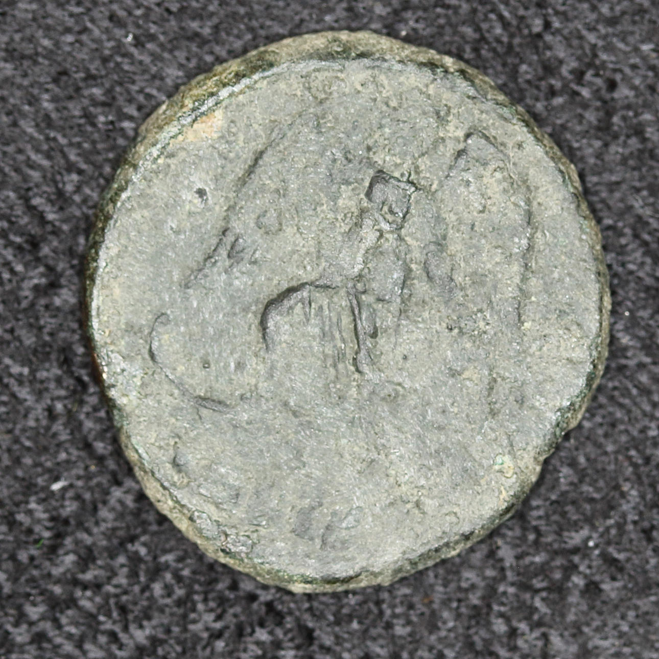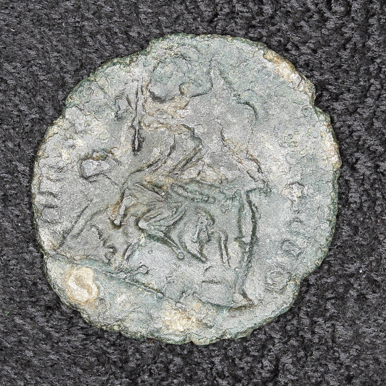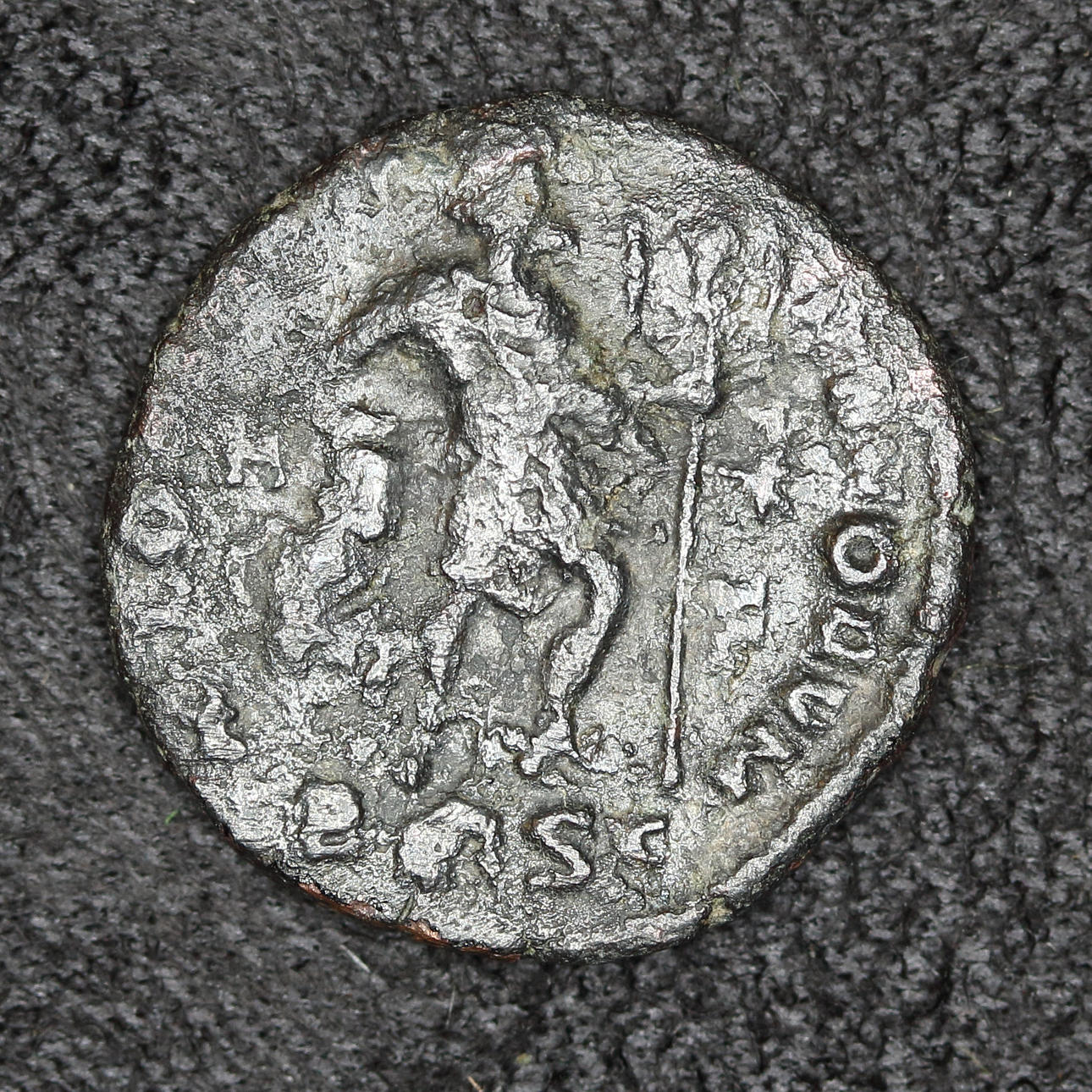 Rev: Felicitas está de pie a la izquierda, sostiene el caduceo en la mano derecha y un largo brote en la izquierda.