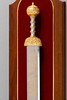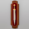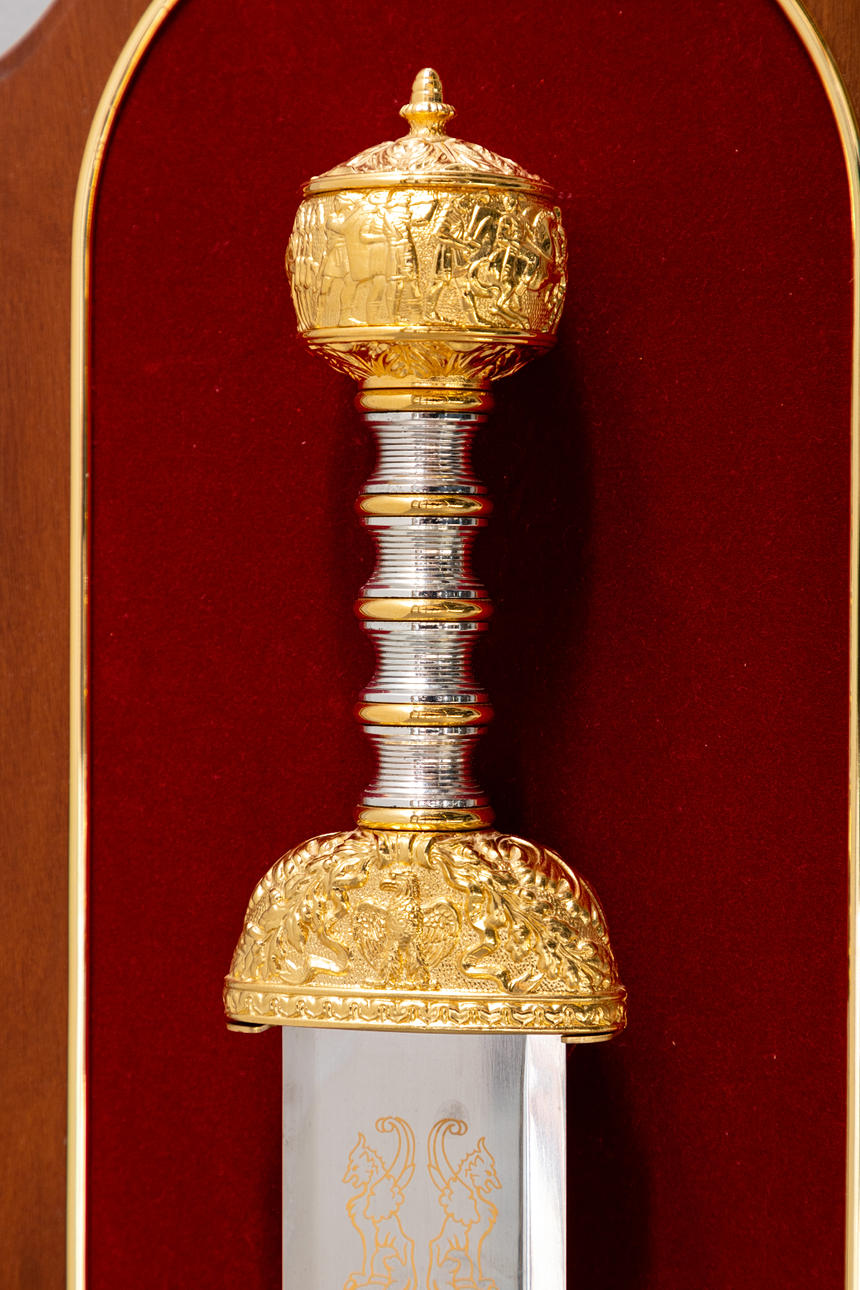 'La espada de Julio César' de Franklin Mint en una pared de madera. Fiel a la réplica original fabricada en una fábrica tradicional española en Toledos. Espada corta muy elaboradamente modelada. Ricamente decorado con oro de 24k y plata de ley. Certificado de autenticidad y folleto informativo del fabricante presente. longitud aprox. 71cm. expositor de pared de madera aprox. 93x28cm.
